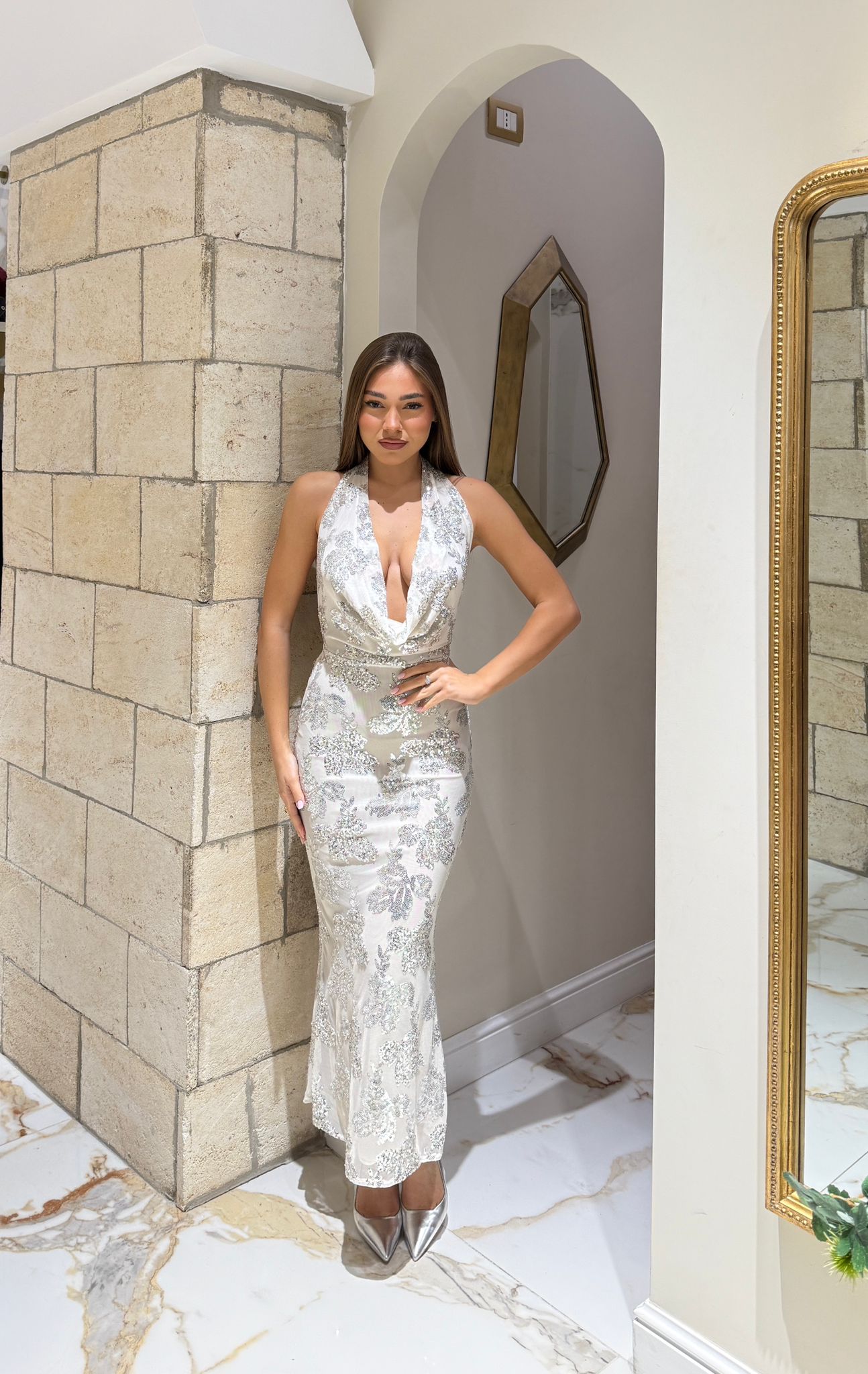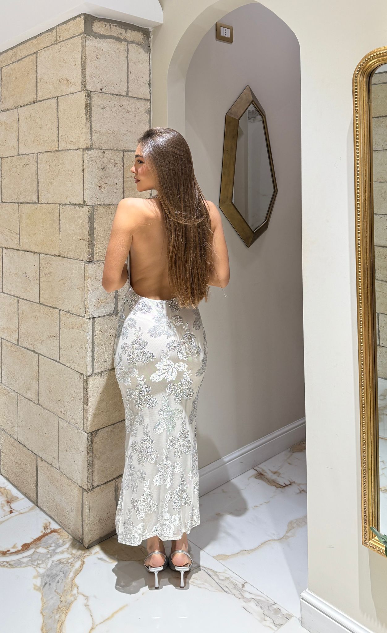 Abito da donna con applicazioni paillettes, scollo morbido sul davanti e schiena scoperta, vestirà bene fino ad una M.