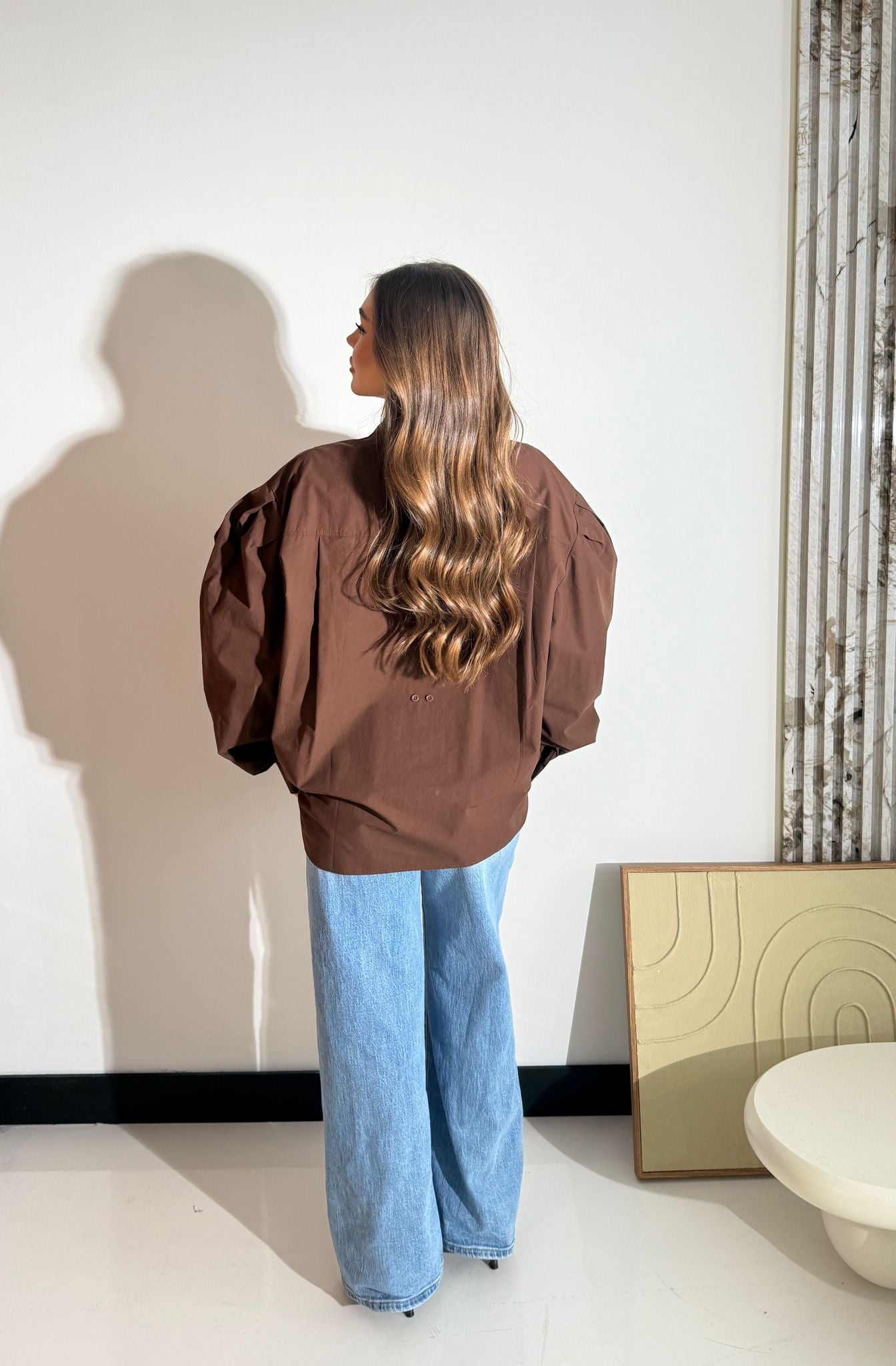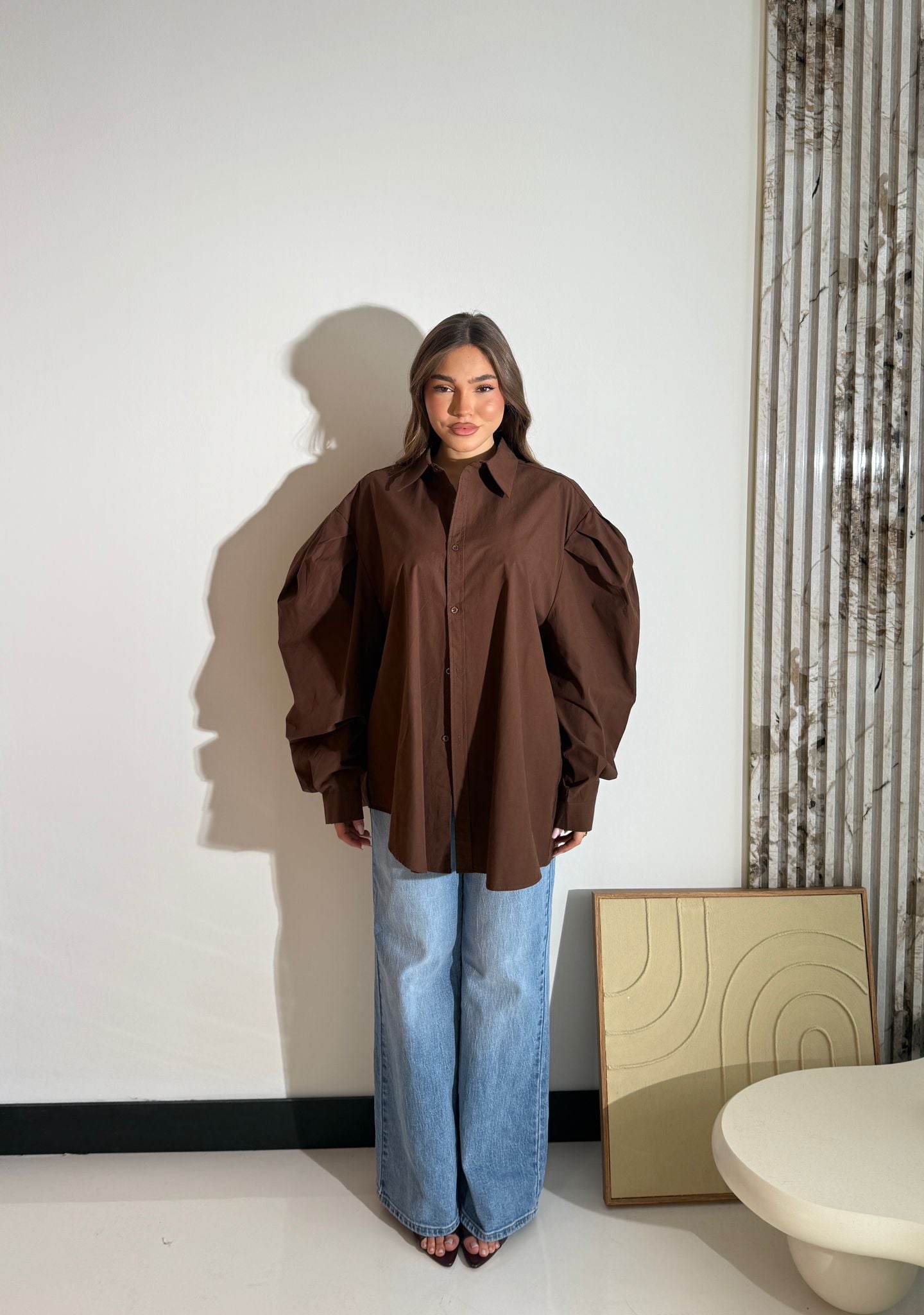 Camicia da donna con manica a sbuffo e polsino, modello oversize. Taglia unica, veste bene fino ad una taglia L/XL.