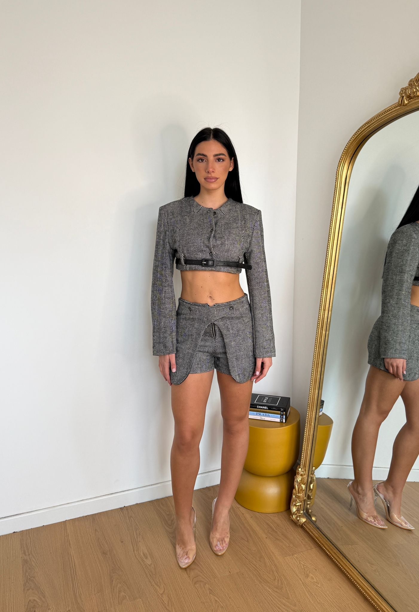 Coordinati da donna composto da giacca crop con spalline foderata internamente e shorts a vita alta, vestirà bene fino ad una M piena