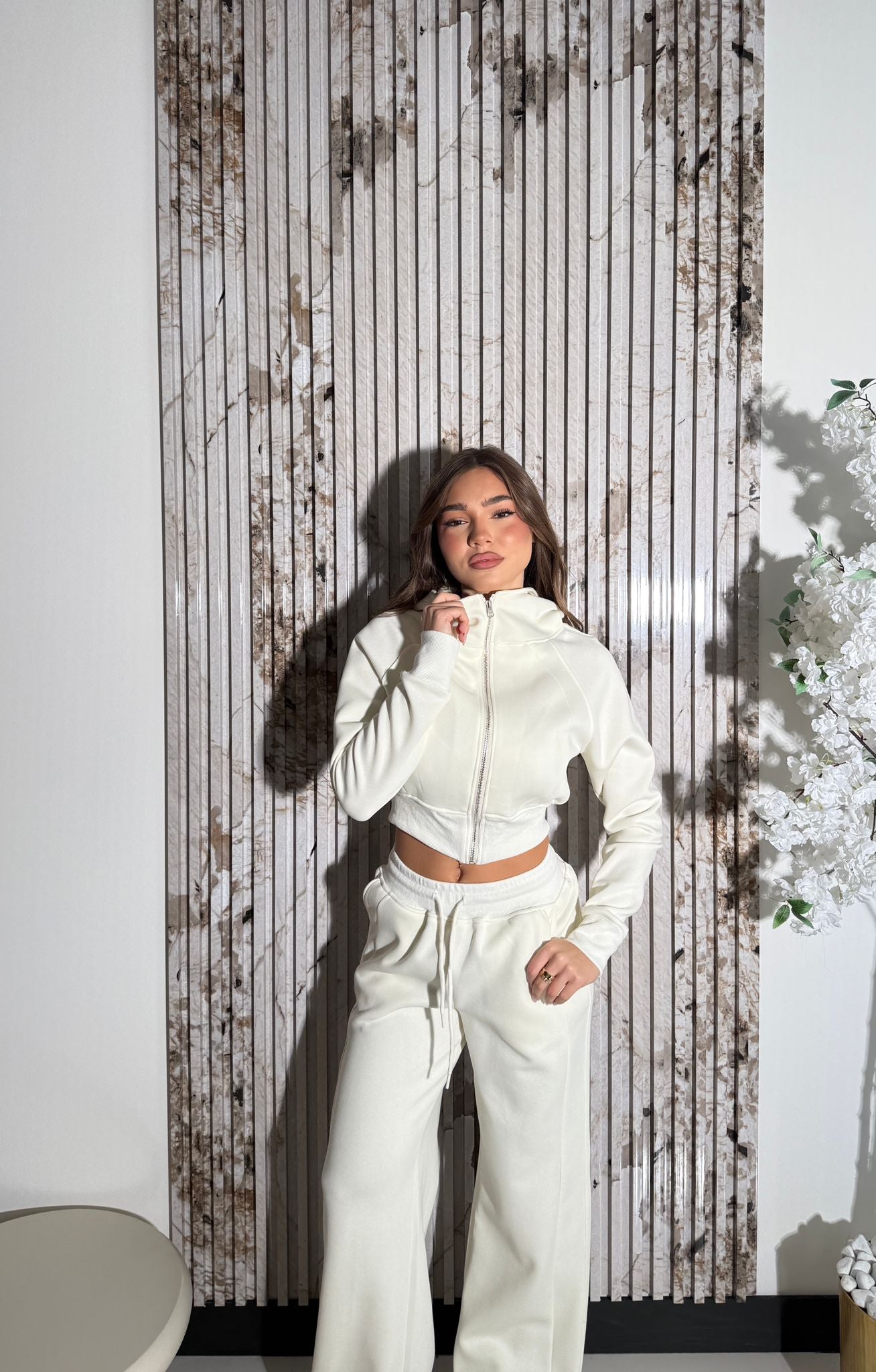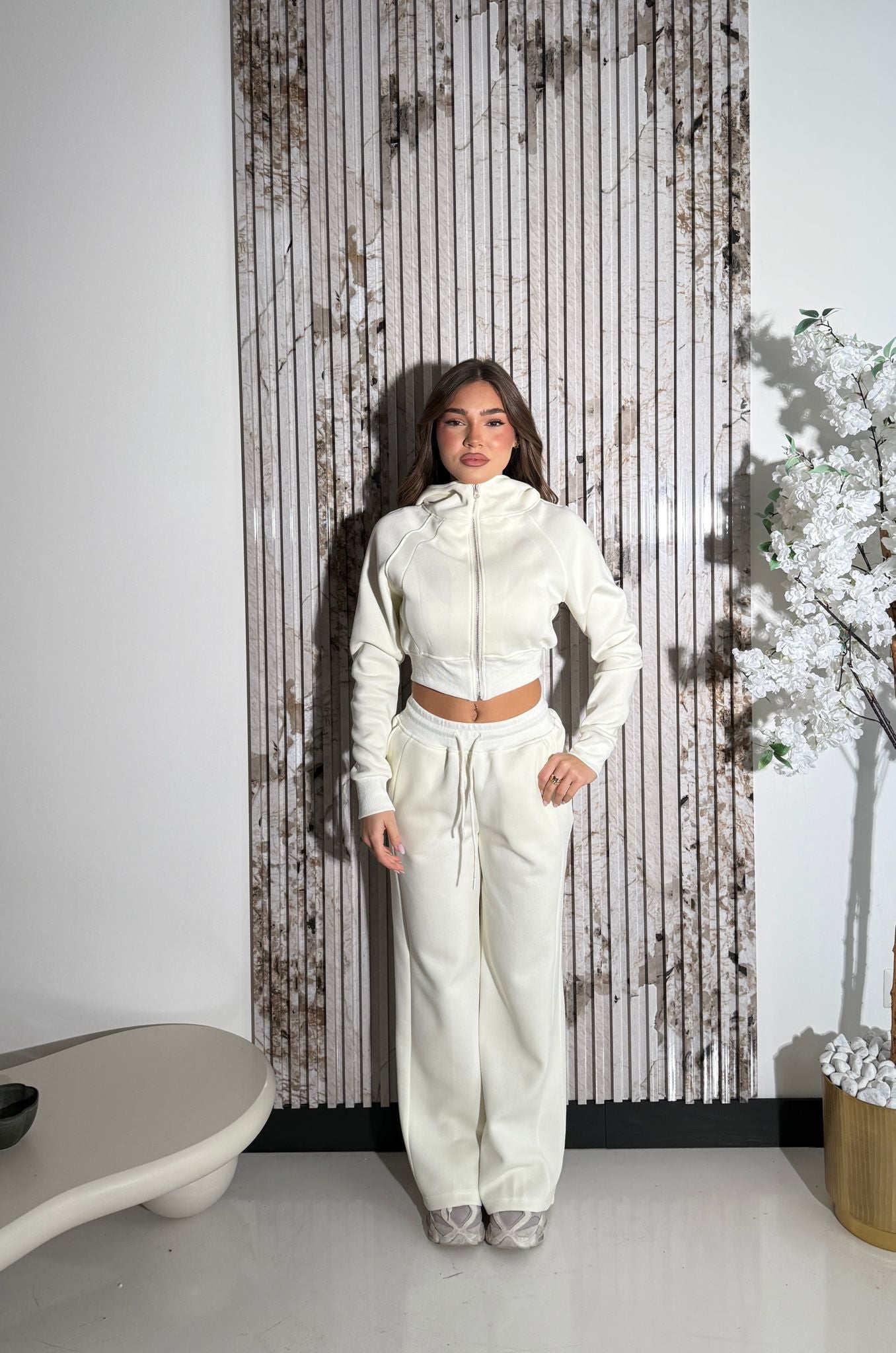 Coordinato da donna composto da felpa con cappuccio, zip, laccetti regolabili, elastico sul finale e polsini, e da pantalone con elastico in vita e laccetti. La modella in foto indossa taglia S/M ed è alta 1,65 e pesa 52/53 kg.