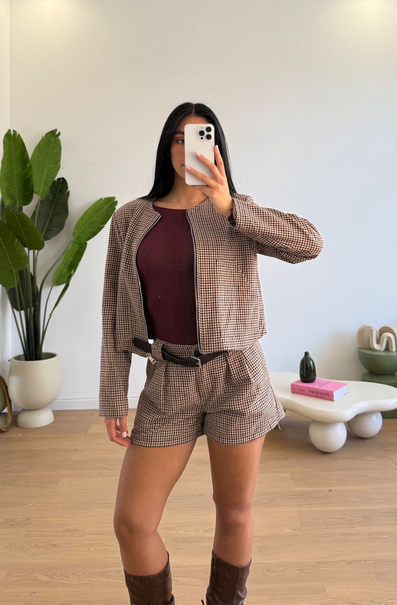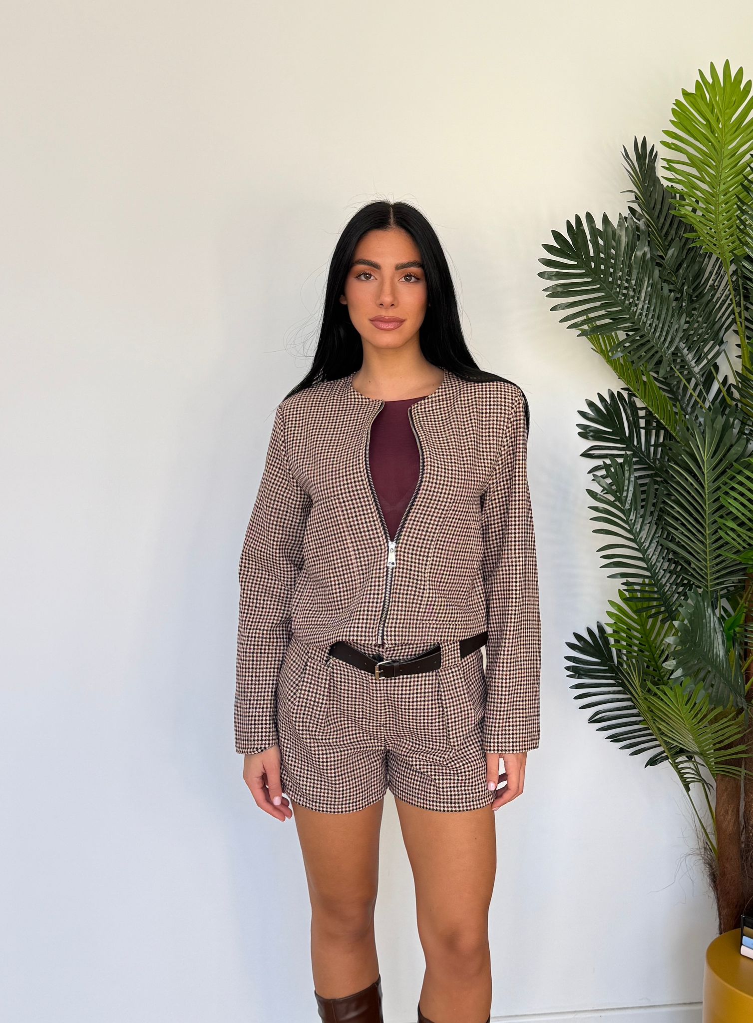 Coordinato da donna composto da giacca crop con spalline imbottite e gonna a pantaloncino con cintura inclusa e veste bene fino ad una M piena