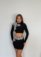 Coordinato da donna top quality, composto da top e gonna con applicazioni fiori in strass, tessuto bandage. La modella in foto indossa S/M.