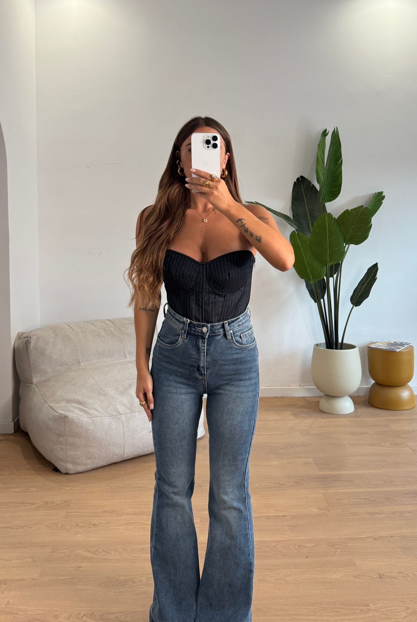 Corpetto da donna gessato con ferretto e chiusura intreccio sul retro e veste regolarmente la propria taglia e la modella indossa taglia S