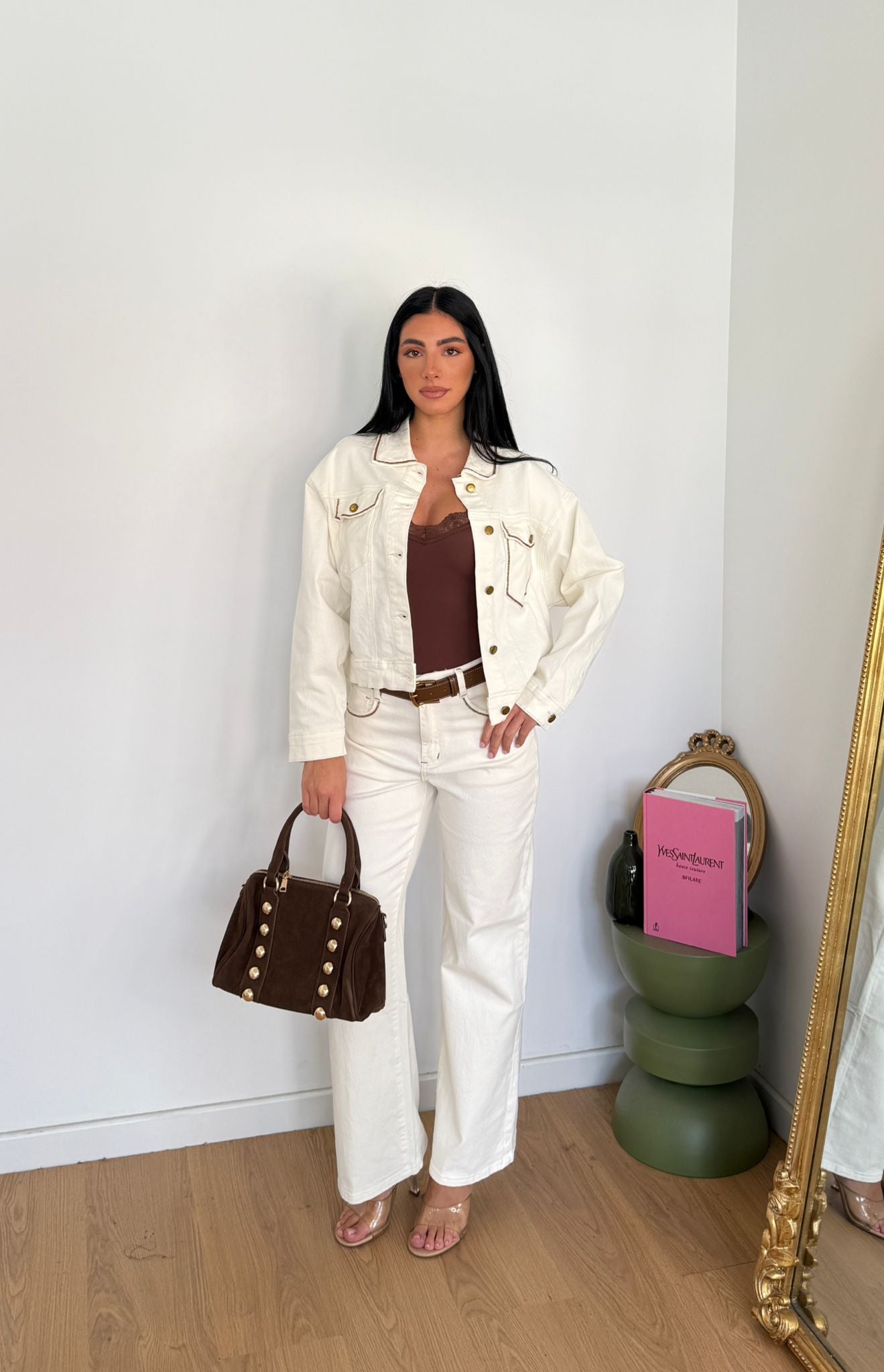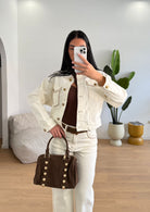 Giubbino da donna in denim tela fissa ma veste regolarmente la propria taglia e la modella indossa taglia XS