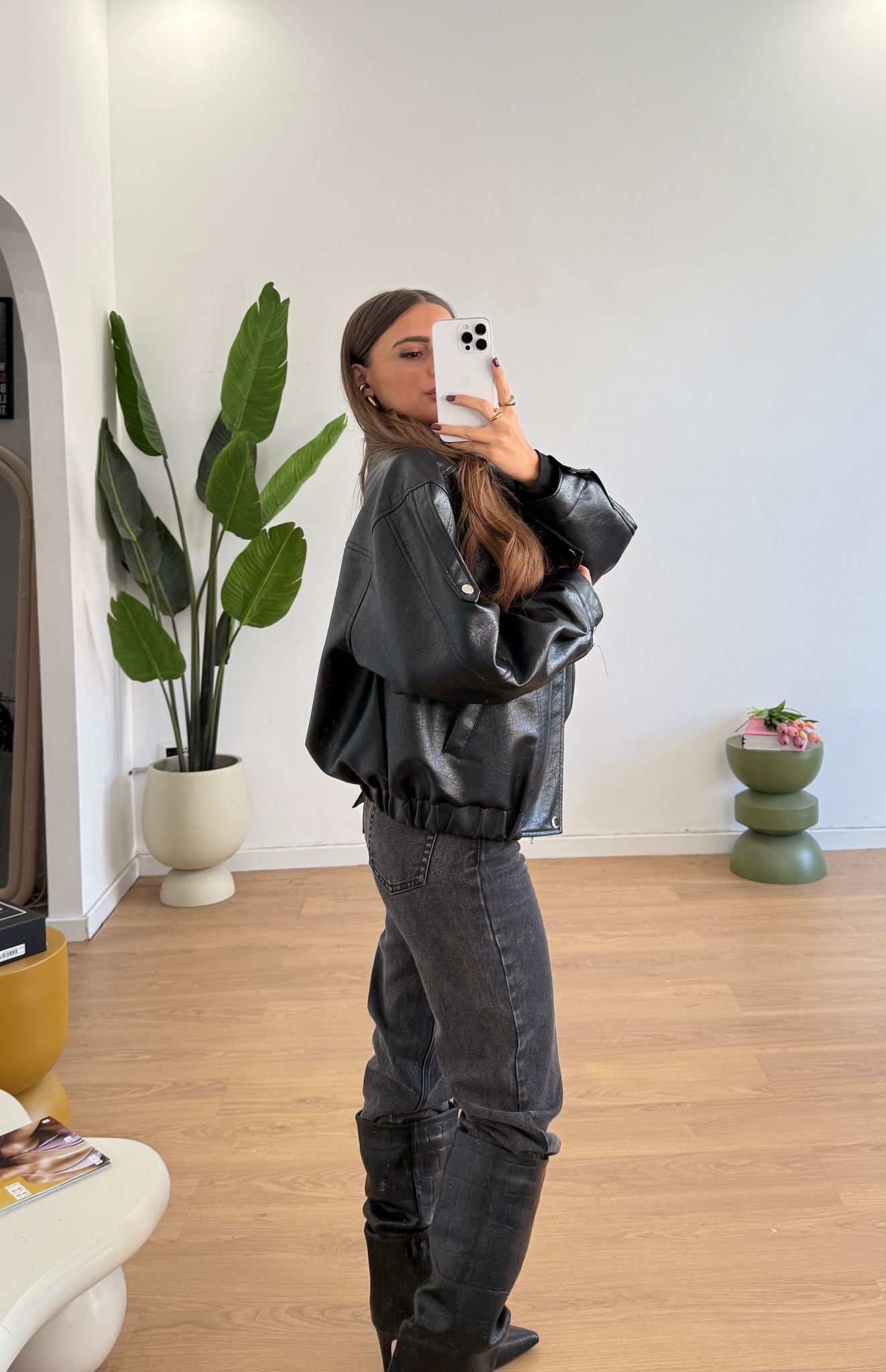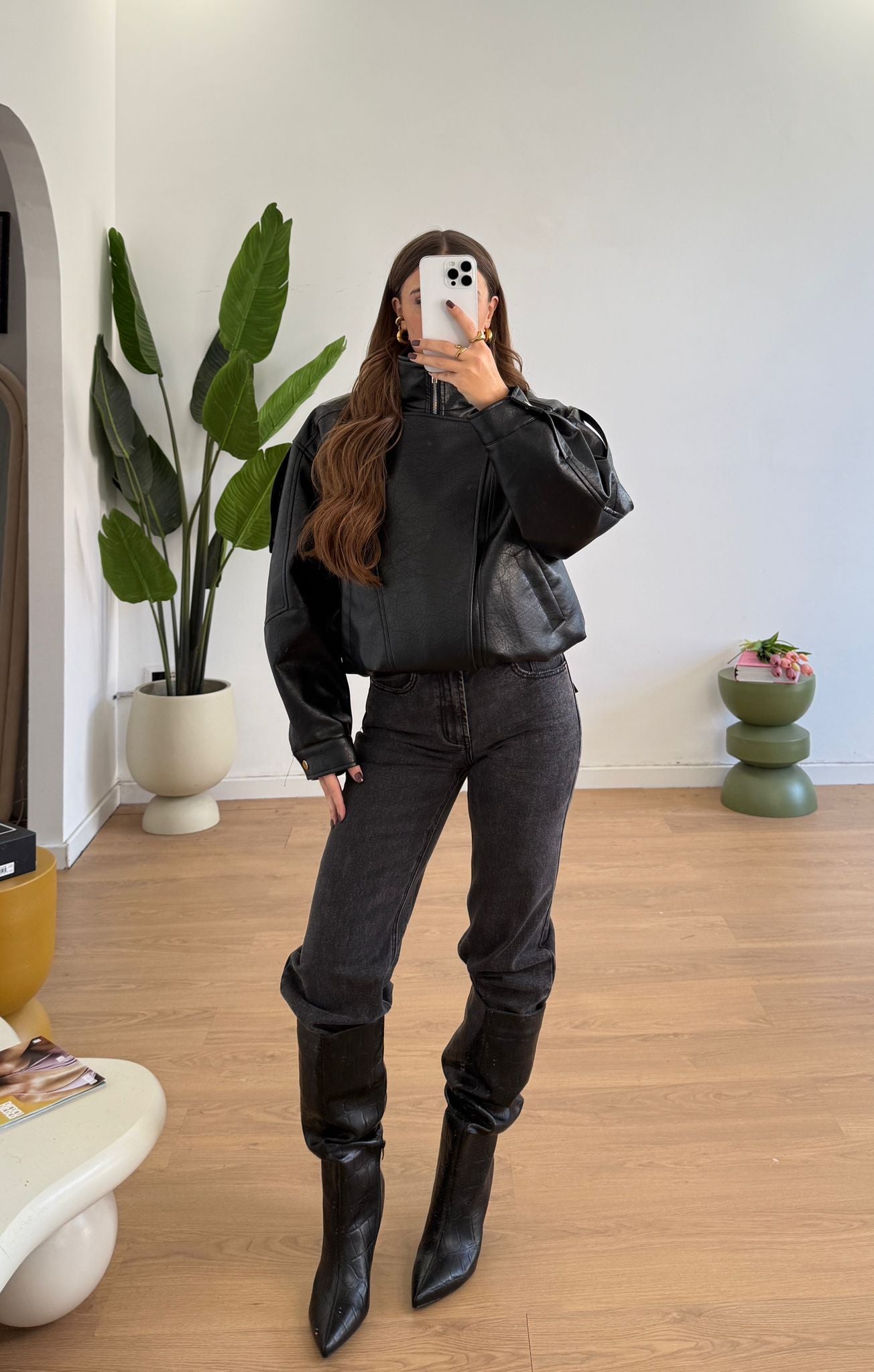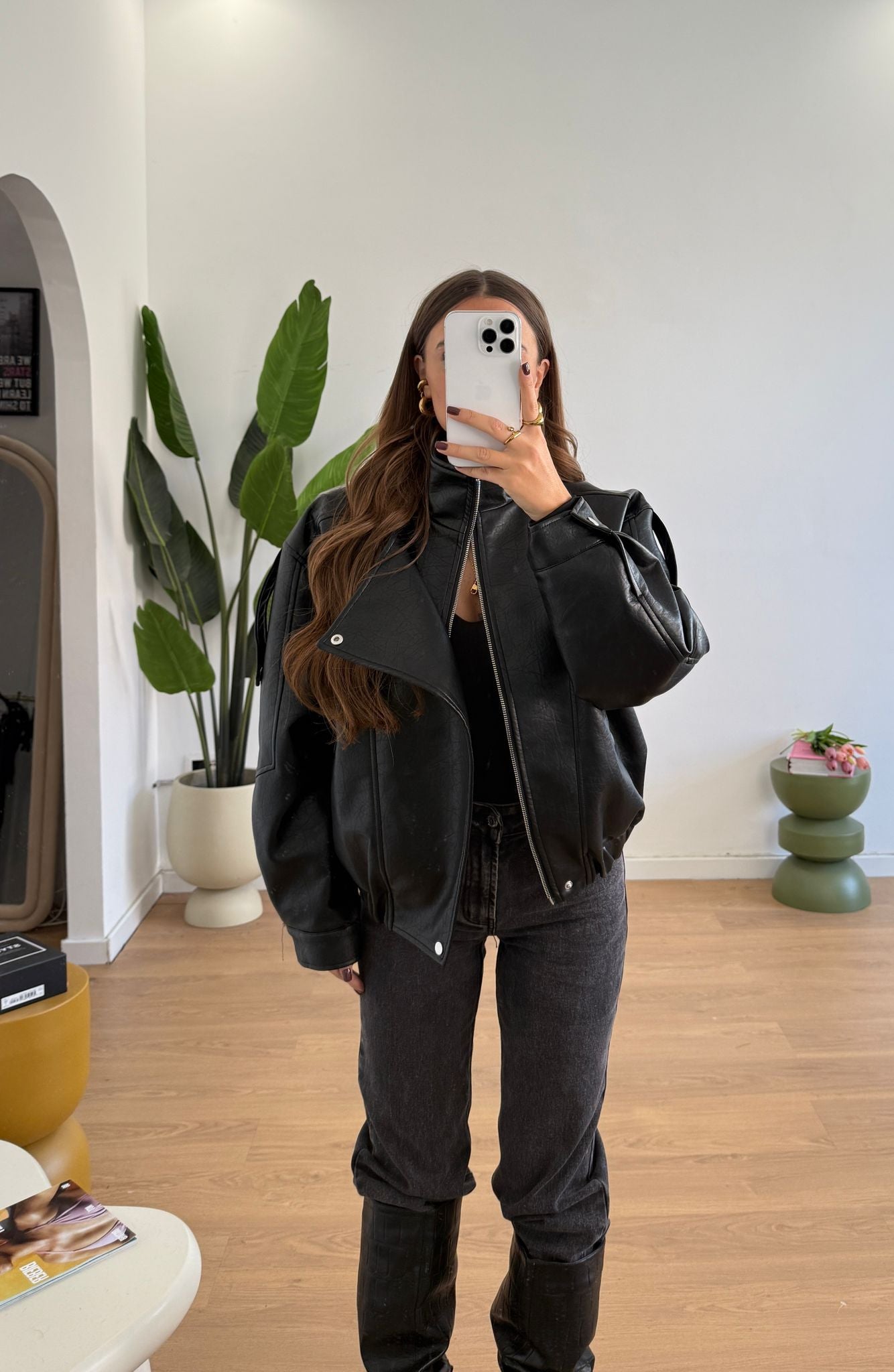 Giubbino da donna in ecopelle foderato internamente con chiusura zip sul davanti e veste regolarmente la propria taglia e la modella indossa taglia S