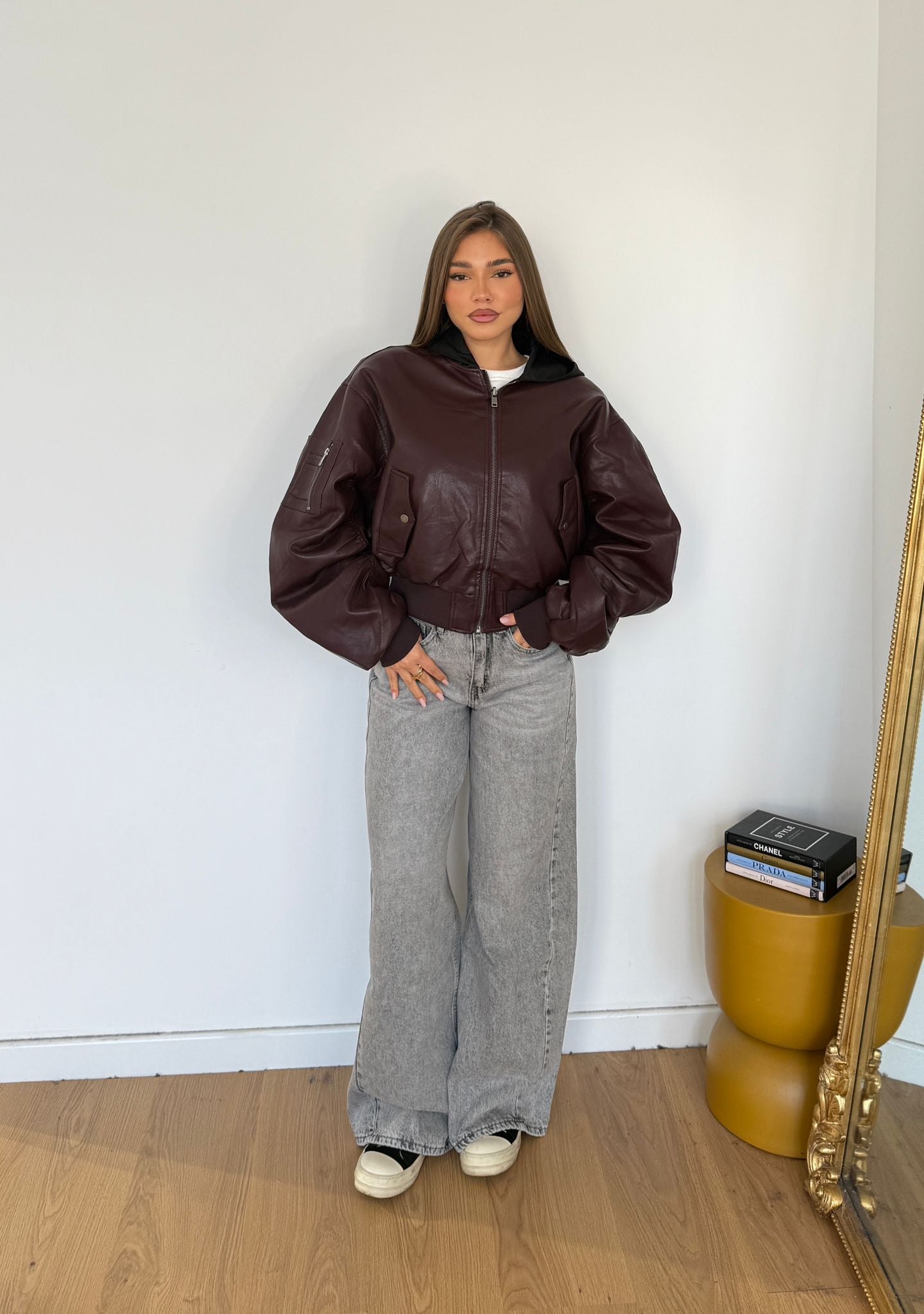 Giubbino da donna in ecopelle, foderato internamente con cappuccio in polsini, top quality e veste regolarmente la propria taglia e la modella indossa taglia S/M