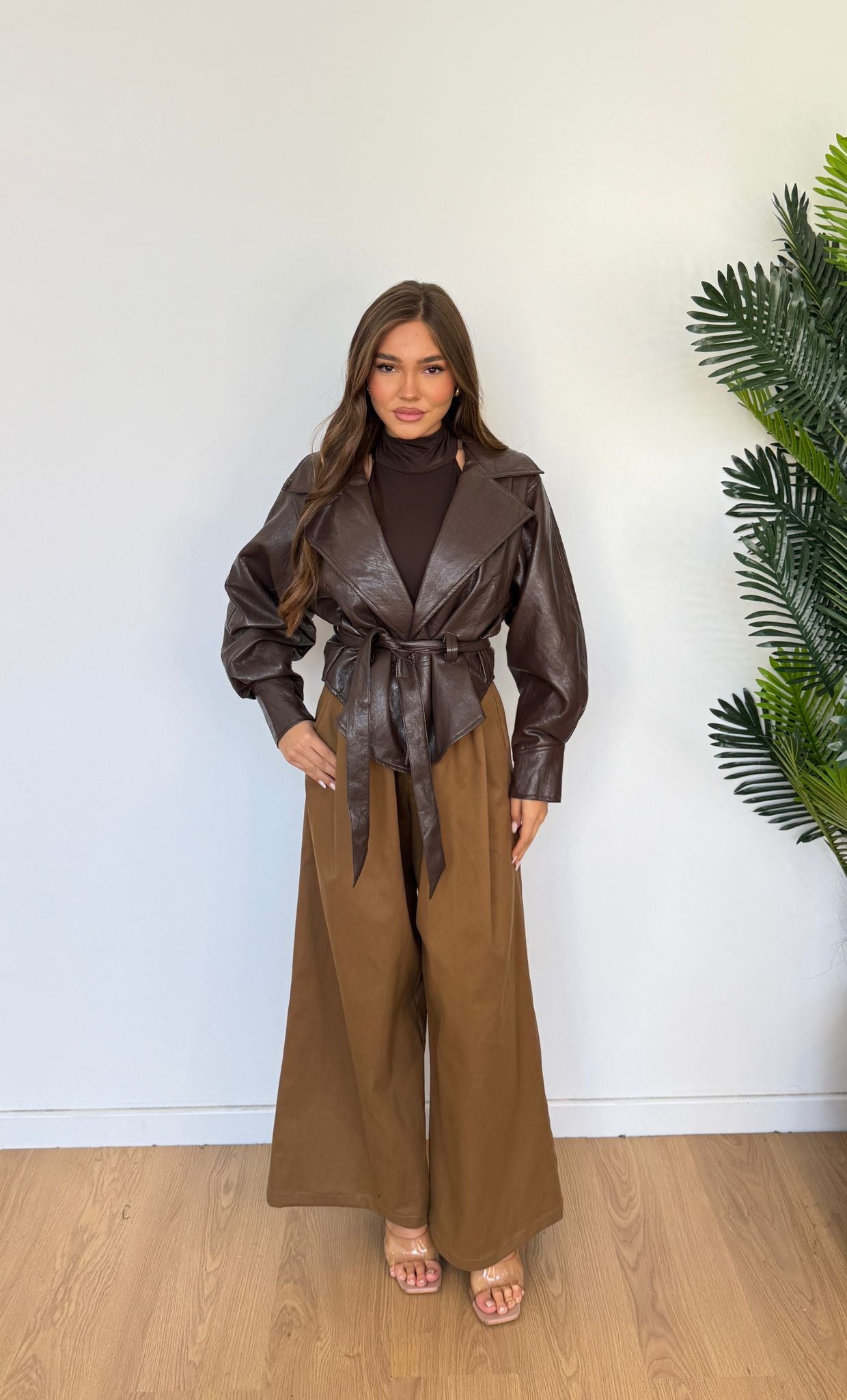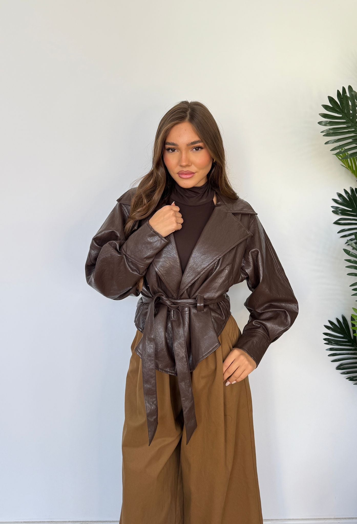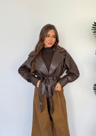 Giubbino da donna in ecopelle, foderato internamente, con cintura in vita. Taglia unica, veste bene fino ad una M.