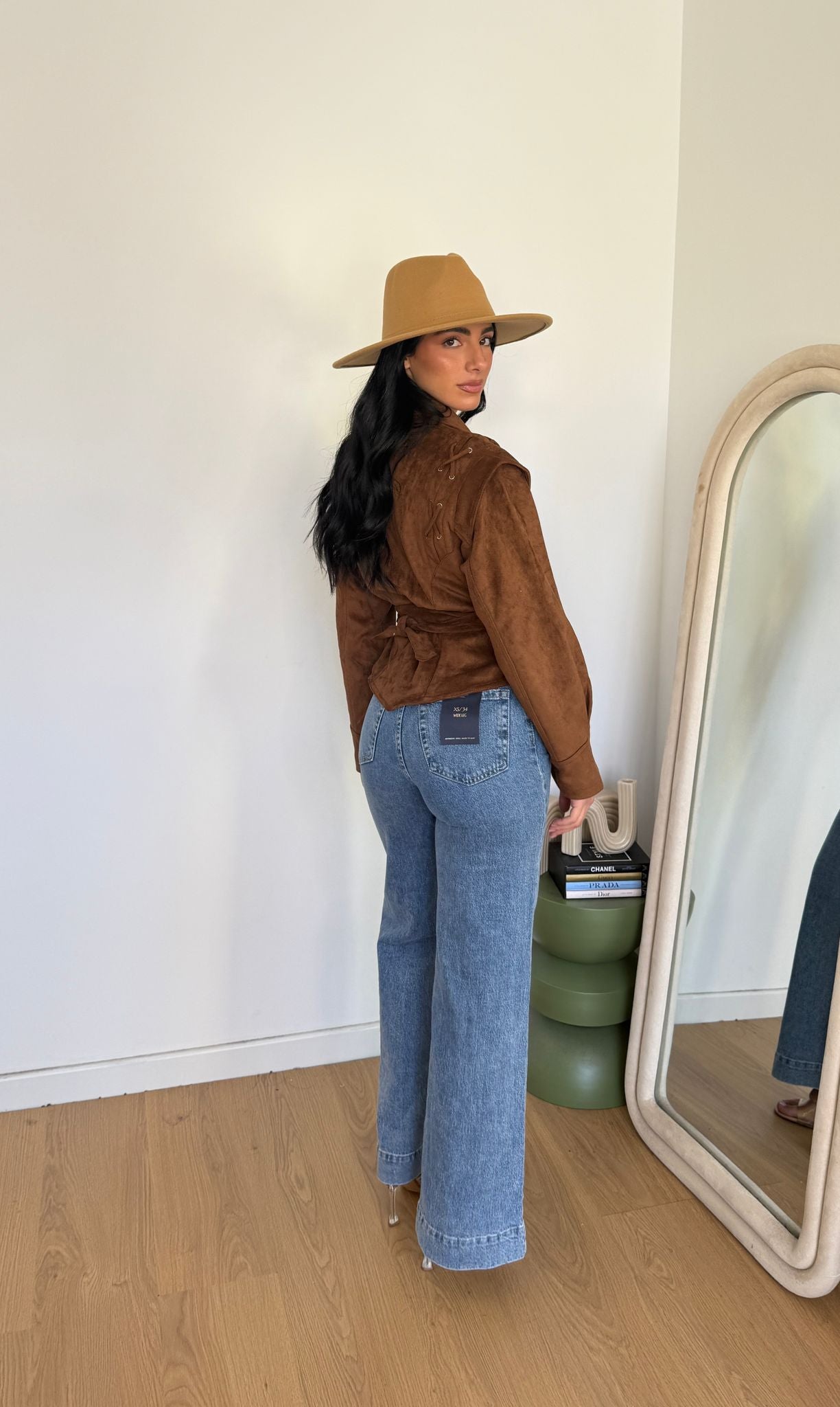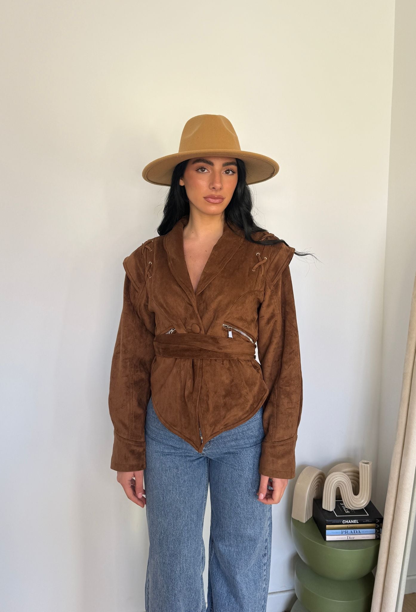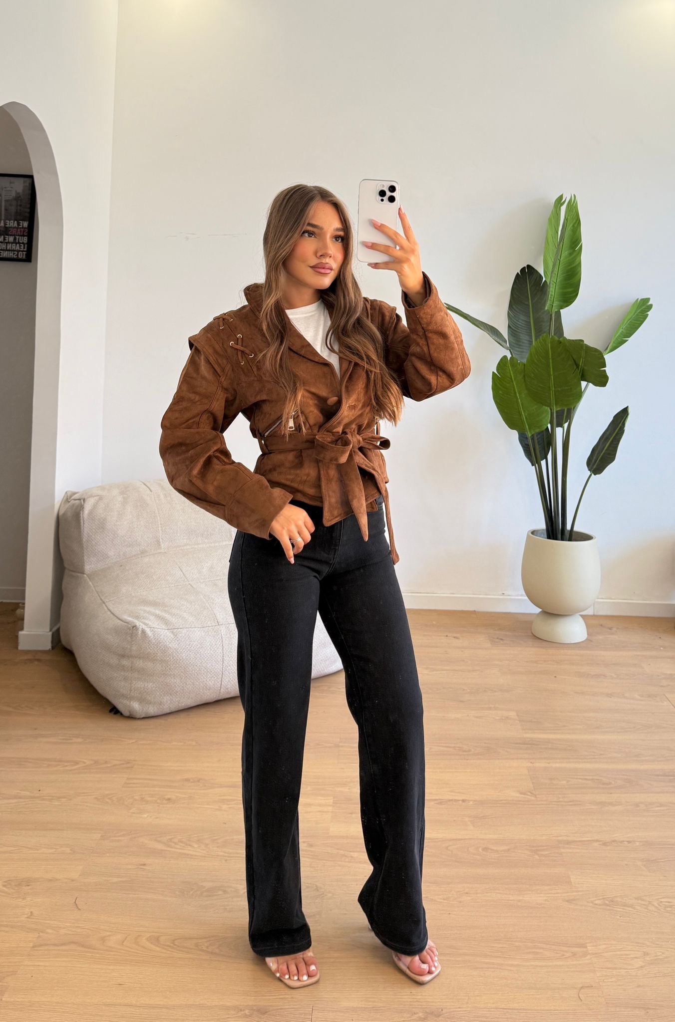 Giubbino da donna in camoscio con cintura compresa e veste regolarmente la propria taglia e la modella indossa taglia S/M