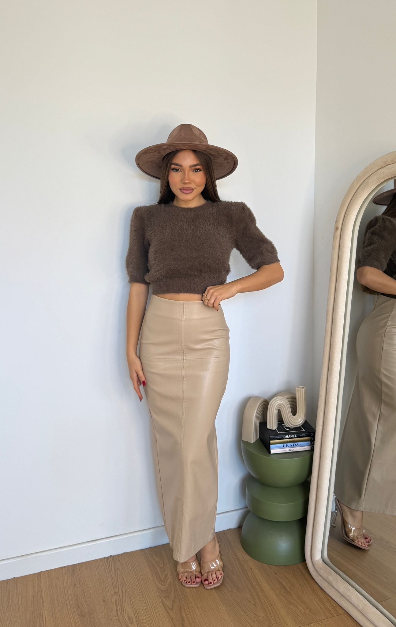 Gonna Da donna in ecopelle con chiusura zip e spacchetto sul retro, veste regolarmente la propria taglia e la modella indossa taglia S