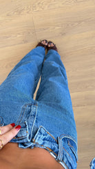 Jeans da donna i tela fissa ma veste regolarmente la propria taglia e la modella indossa taglia XS