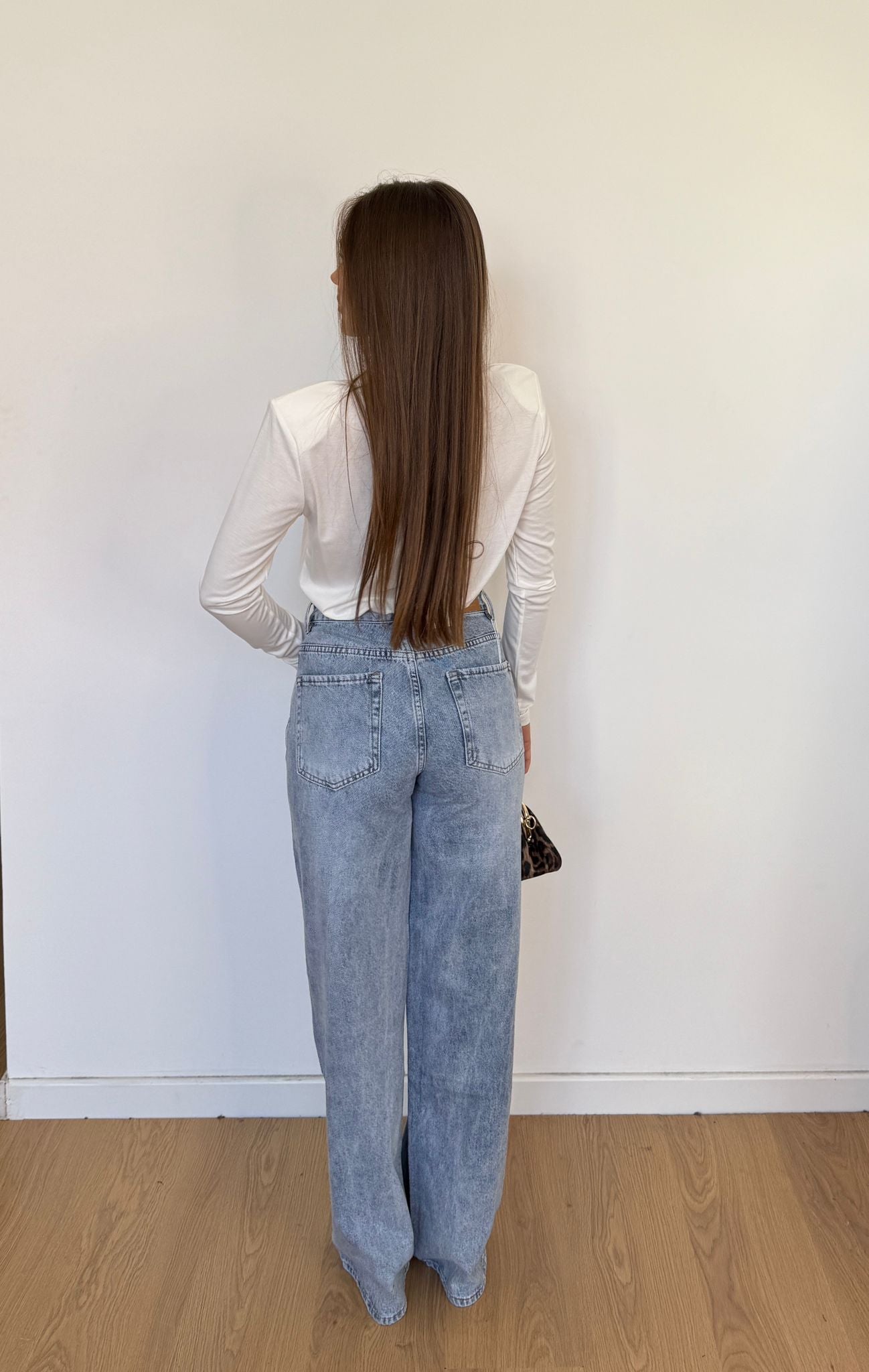 Jeans da donna in denim chiaro modello wide-leg in tela fissa non elasticizzato e veste regolarmente la propria taglia e la modella indossa taglia XS