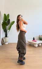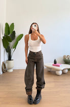 Jeans da donna in denim tela fissa modello ballon e veste regolarmente la propria taglia e la modella indossa taglia XS