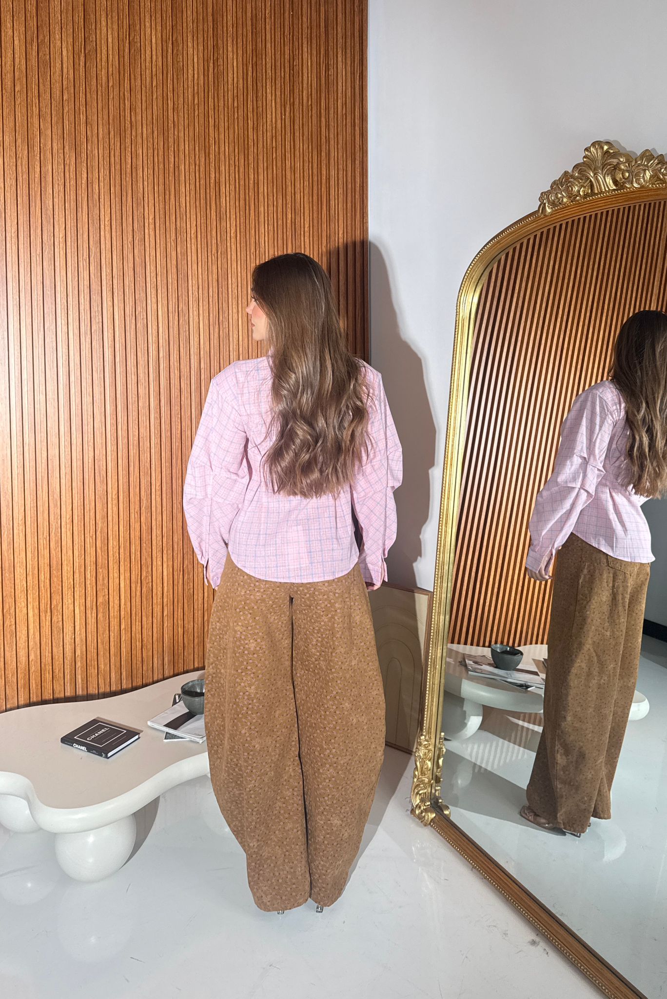 Camicia da donna in cotone con spalline strutturate e fantasia a quadri, lunghezza basic e veste regolarmente la propria taglia e la modella indossa taglia S/M ed è alta 1,65 e pesa 52/53 kg.