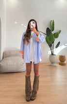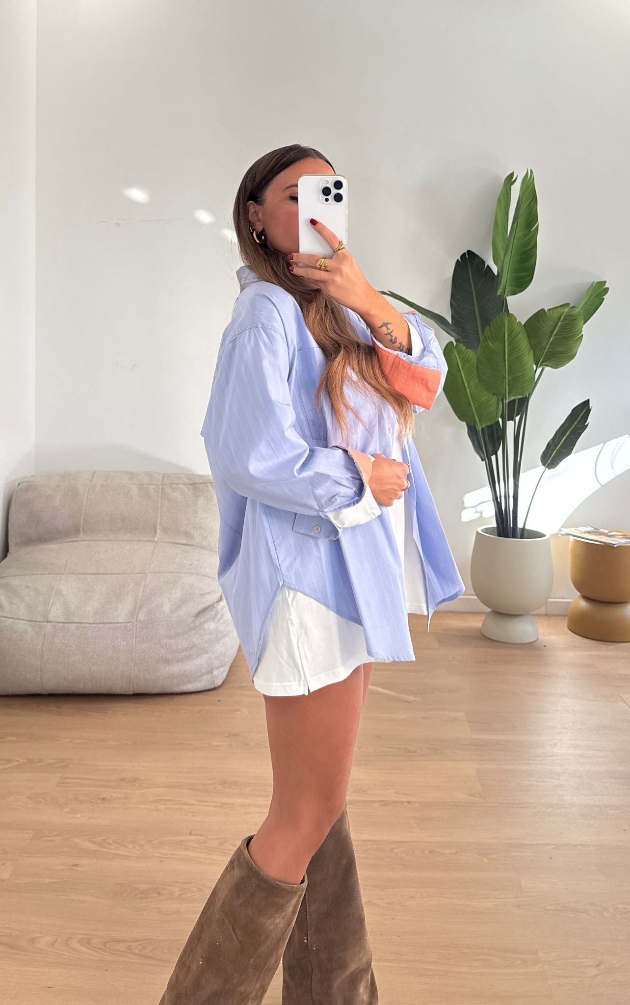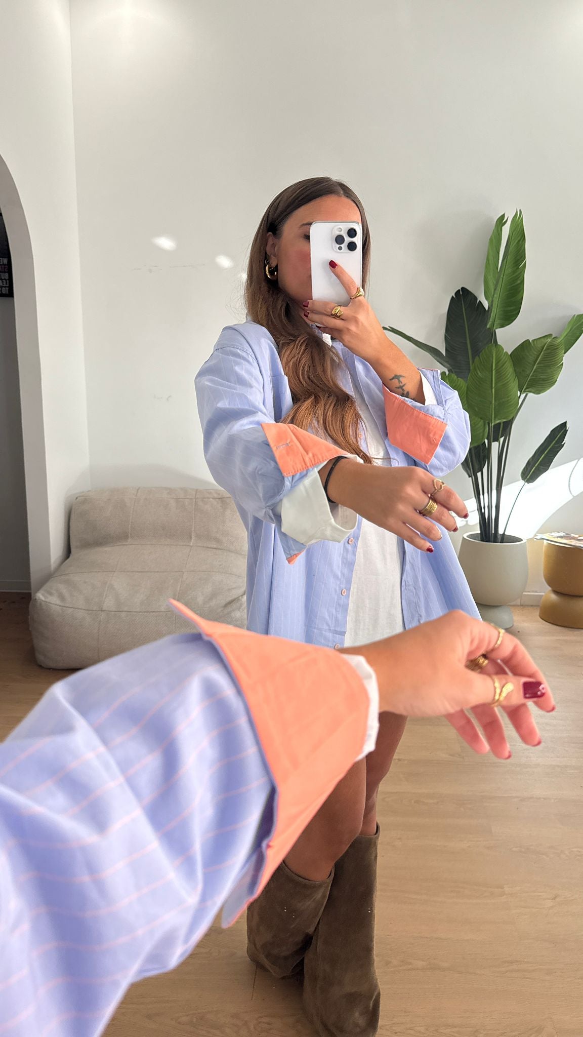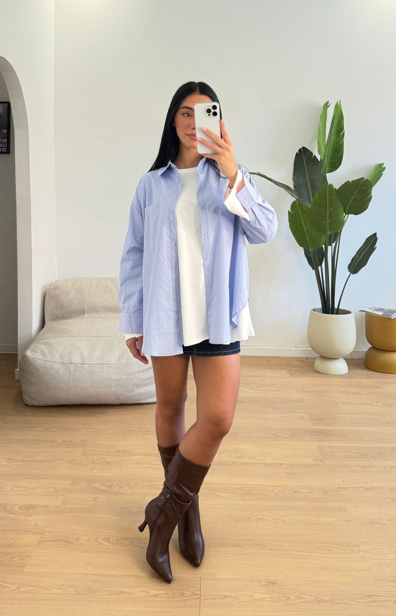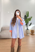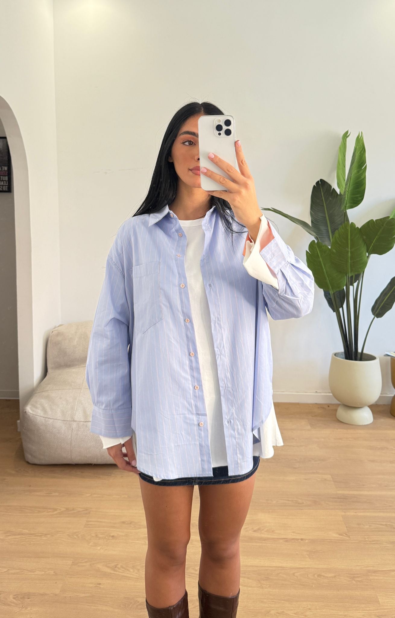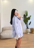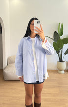 Camicione da donna gessato modello oversize ma veste la propria taglia e la modella indossa taglia S/M