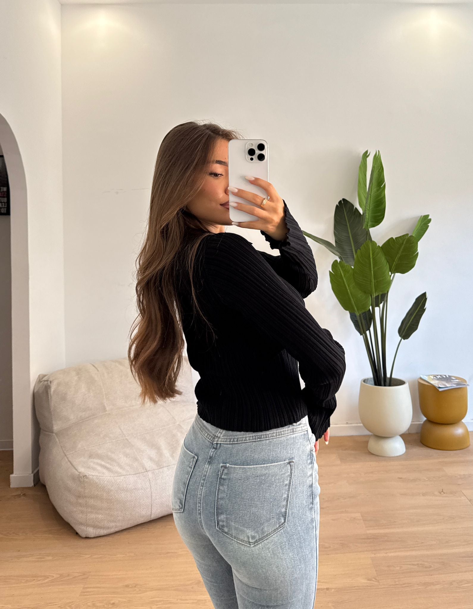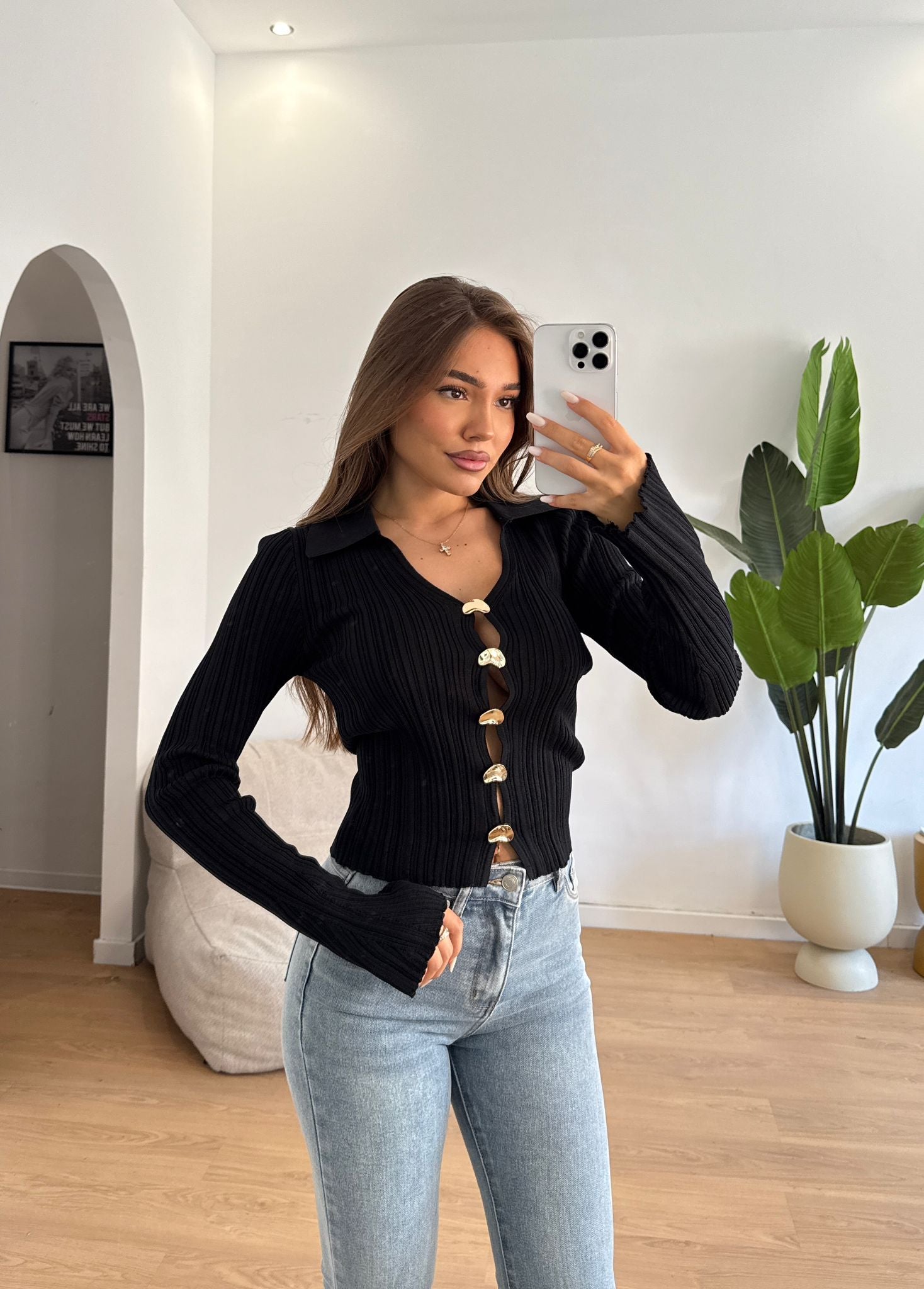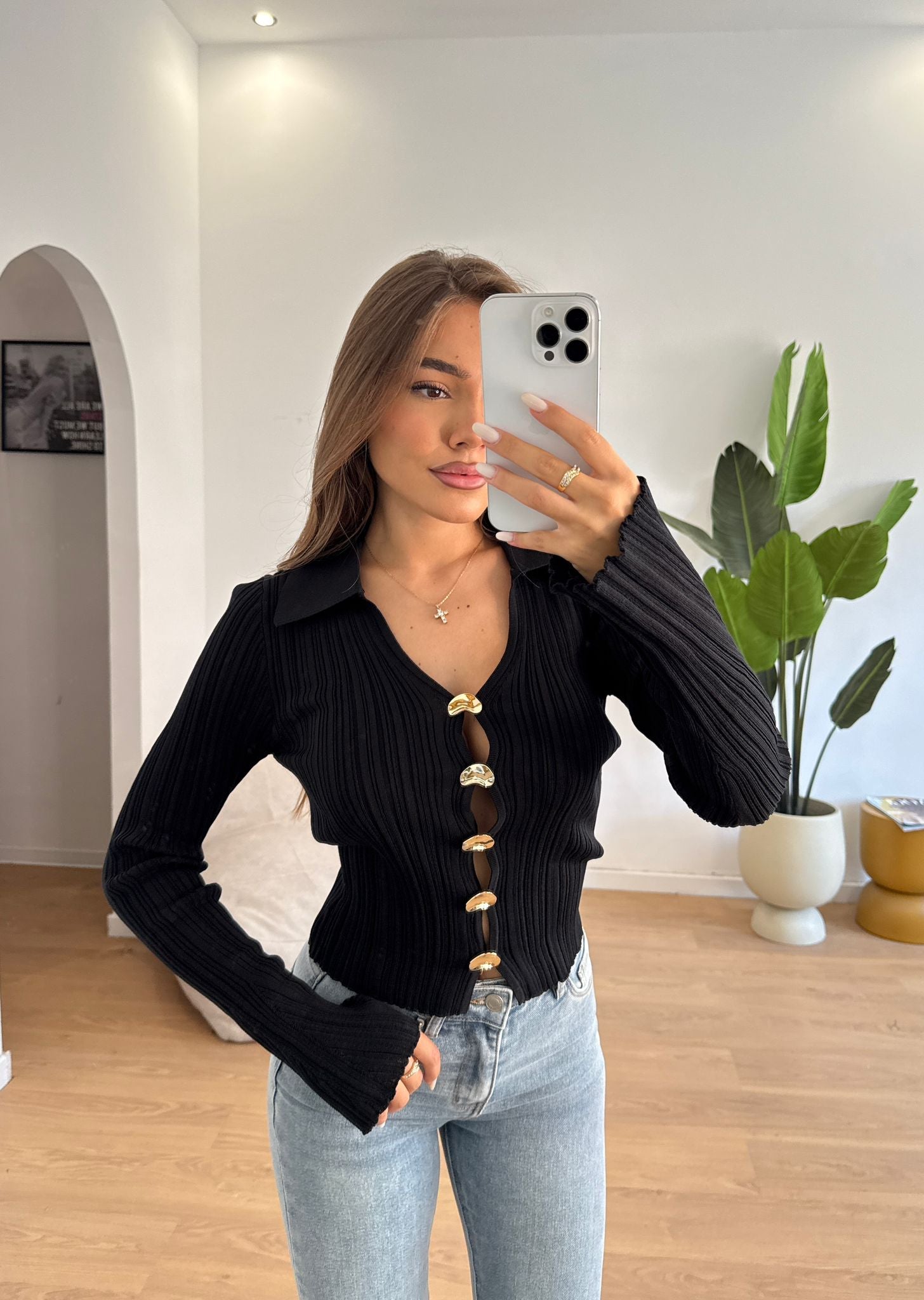 Cardigan da donna in filo tessuto elasticizzato e veste regolarmente la propria taglia e la modella indossa taglia S/M