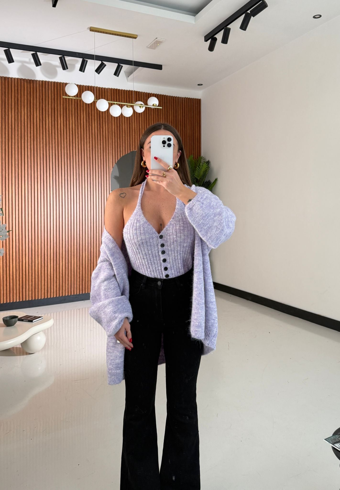 Coord.set da donna in lana rasata composto da top e cardigan, tessuto elasticizzato. Taglia unica, veste bene fino ad una taglia M/L piena.