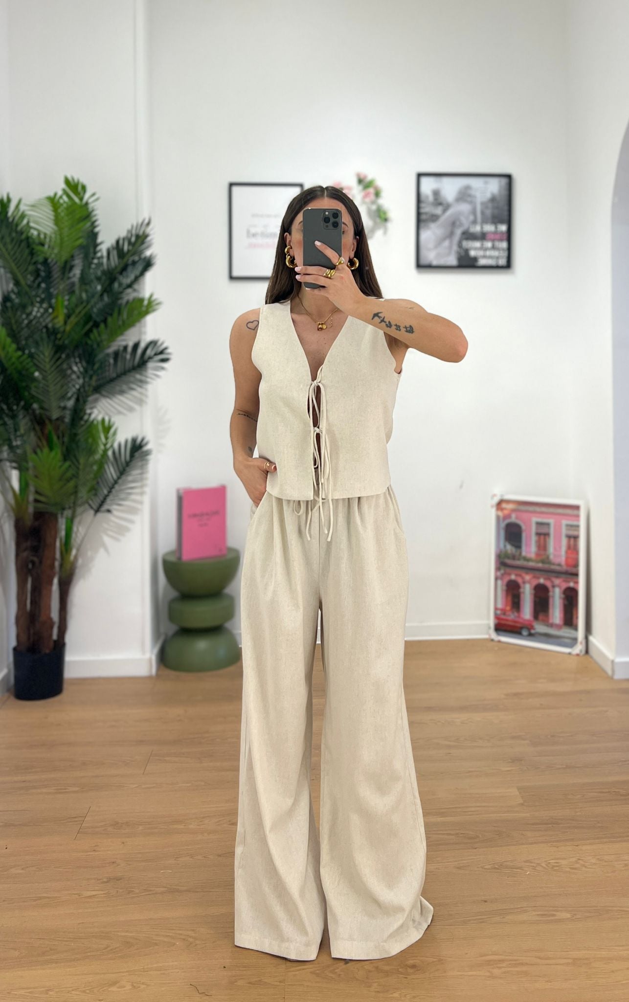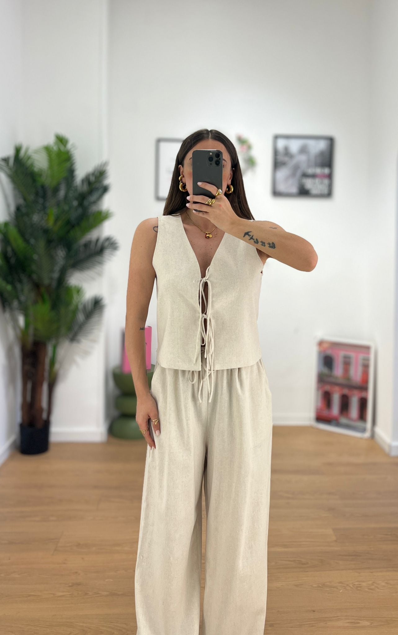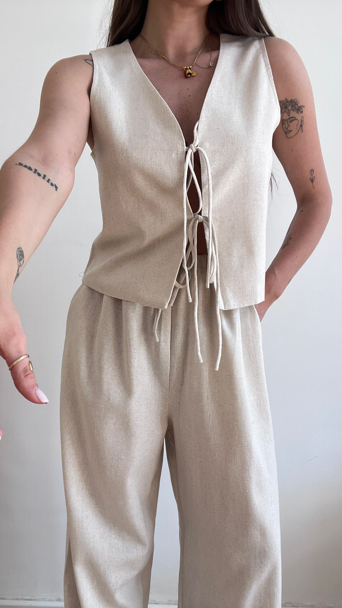 Coordinato da donna in misto lino composto da gilet e pantalone con elastico in vita ma veste regolarmente la propria taglia e giusy indossa taglia S/M