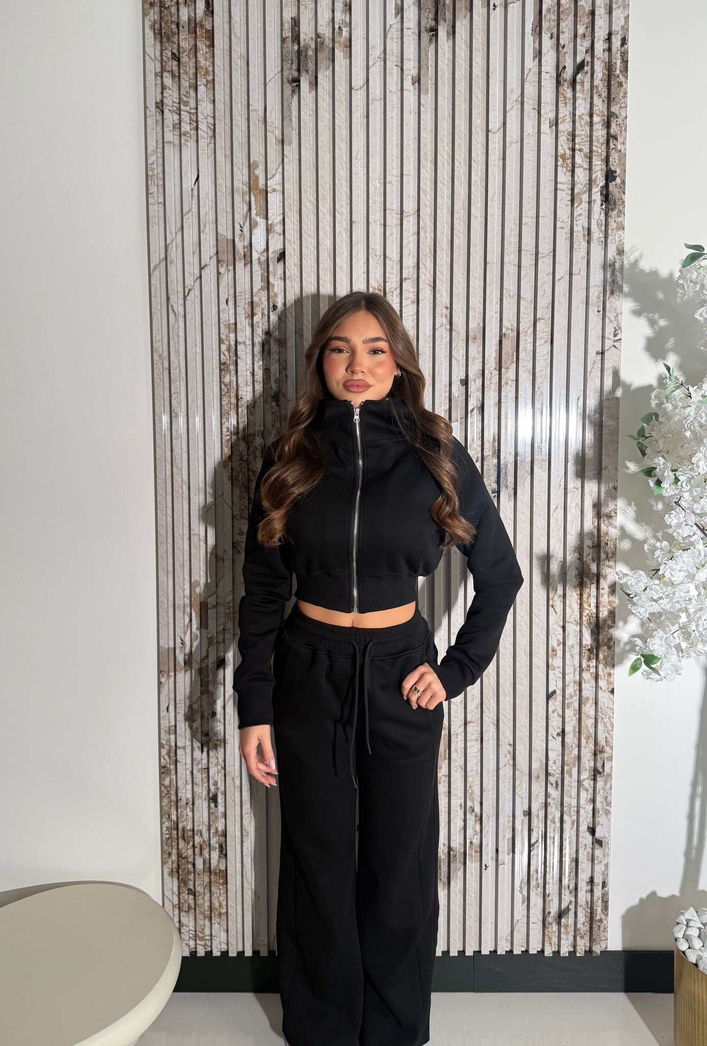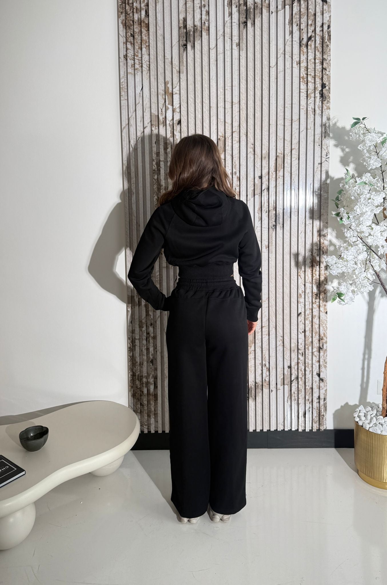 Coordinato da donna composto da felpa con cappuccio, zip, laccetti regolabili, elastico sul finale e polsini, e da pantalone con elastico in vita e laccetti. La modella in foto indossa taglia S/M ed è alta 1,65 e pesa 52/53 kg.