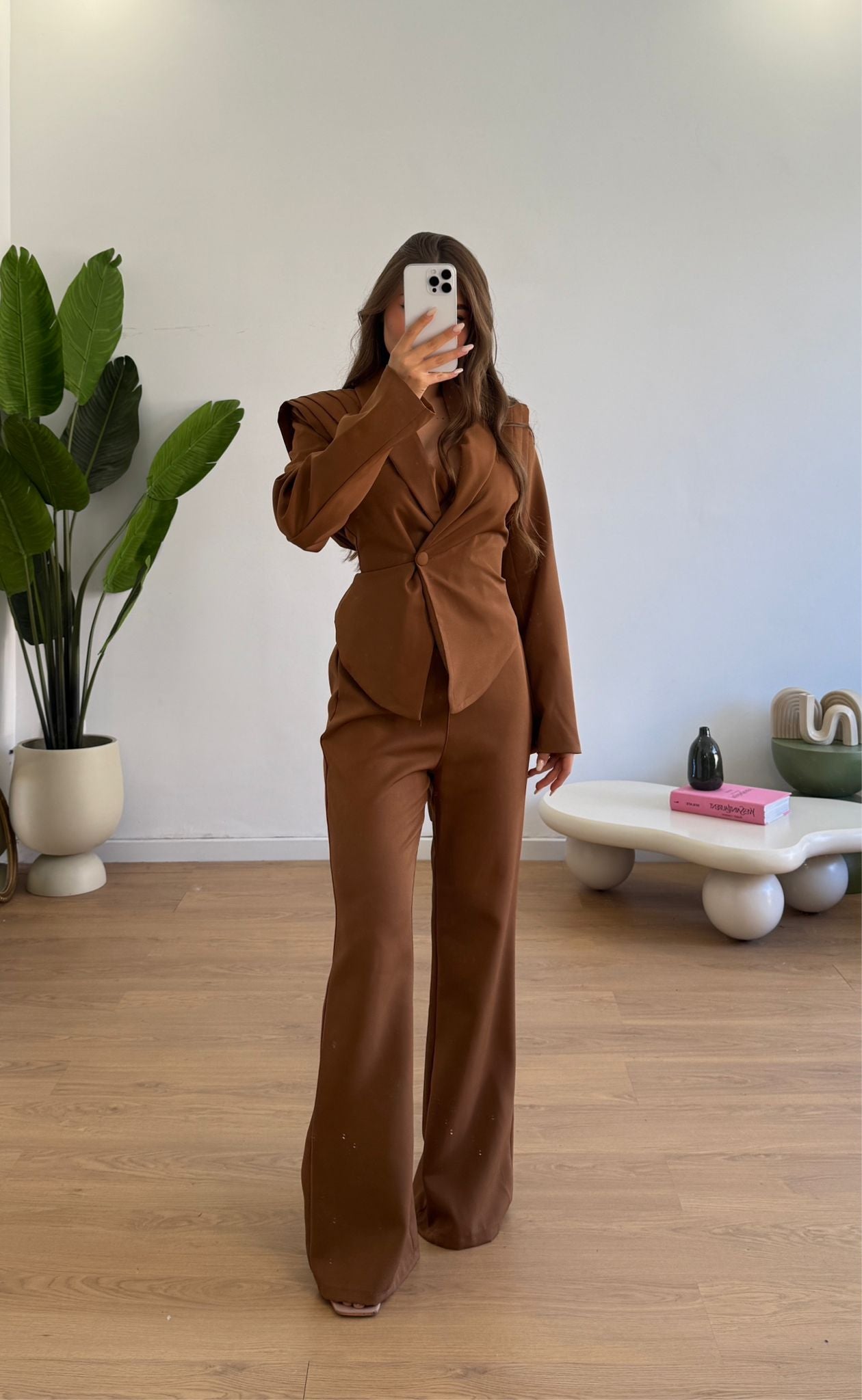 Coordinato da donna composto da giacca con chiusura a bottone e cintura in vita, e pantalone con elastico in vita sul retro. Taglia unica, veste bene fino ad una M.