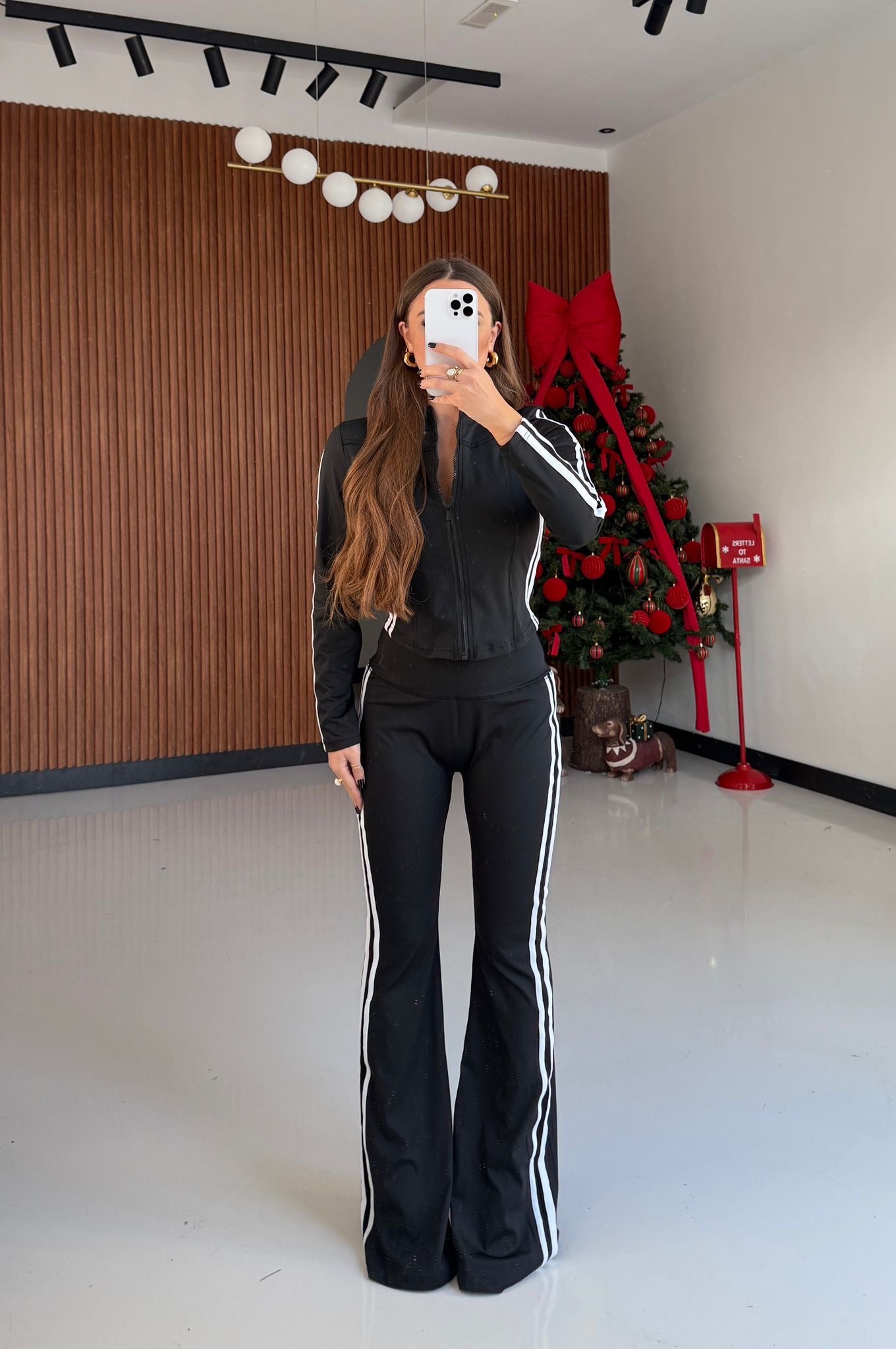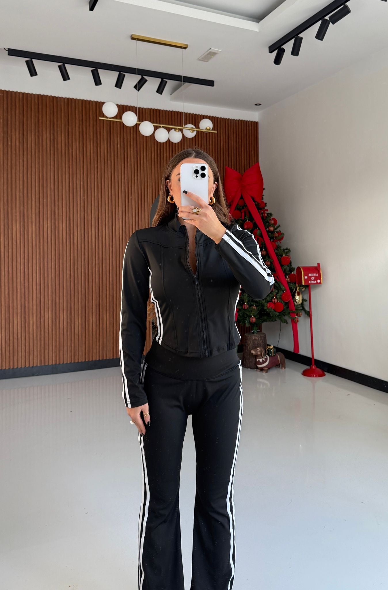 Coordinato da donna in lycra, tessuto elasticizzato. Composto da maglia con zip sul davanti e pantalone a zampa con elastico in vita. Taglia unica, veste bene fino ad una taglia M.