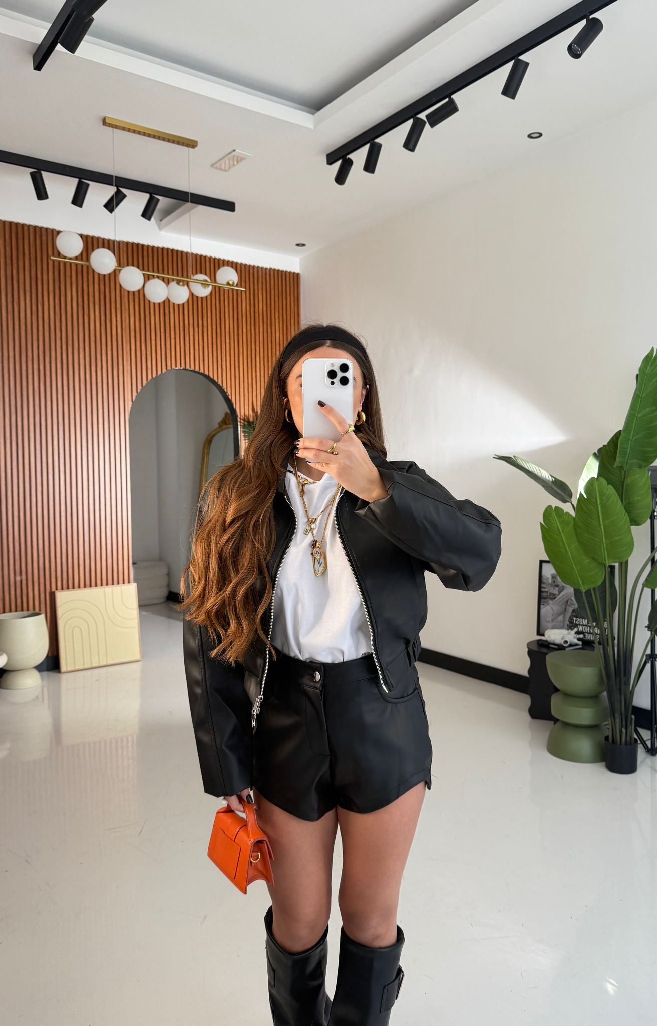 Coordinato da donna top quality in ecopelle composto da giubbino a giacca lunghezza basic foderato internamente con chiusura zip sul davanti, mentre lo shorts ha l’elastico in vita sul retro modello leggermente a farfalla. Vestirà bene fino ad una M/L piena. La modella è alta 1,65 e pesa 52/53 kg