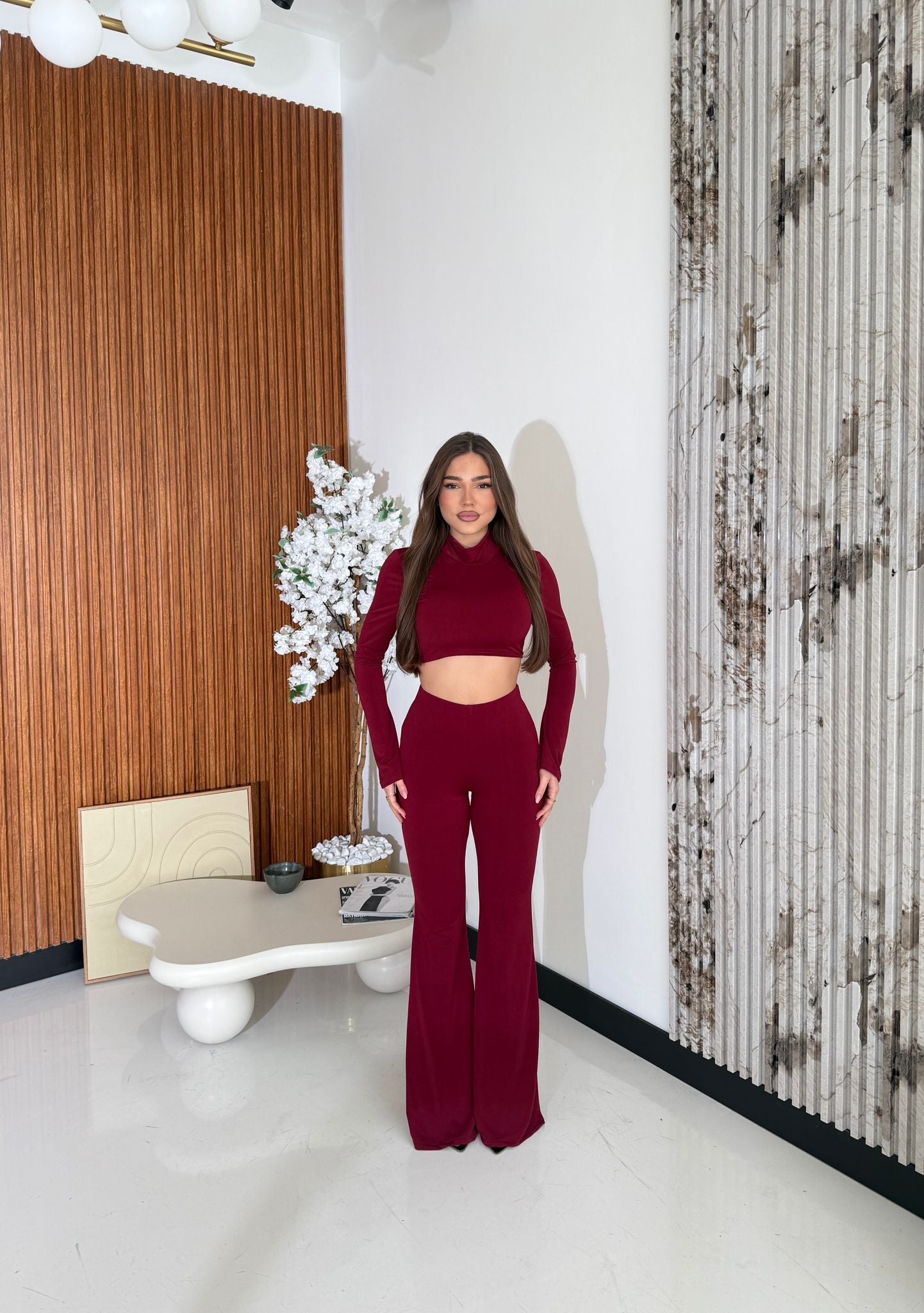 Coordinato da donna in cotone leggero composto da top con mezzo colletto, maniche leggermente a campana sul finale e schiena scoperta, mentre il pantalone è un modello a zampetta e ha l’elastico in vita internamente, tessuto elasticizzato e vestirà bene fino ad una M/L. La modella è alta 1,65 e pesa 52/53 kg.