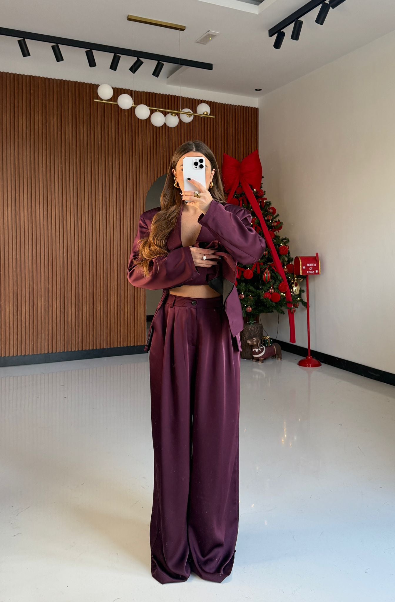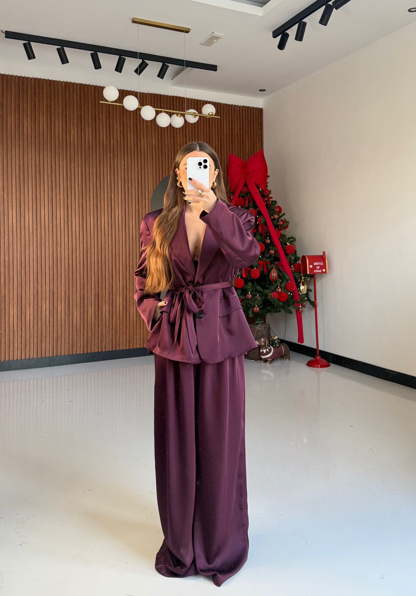 Coordinato da donna top quality effetto satin composto da giacca con spalline imbottite, cintura compresa e pantalone con elastico in vita sul retro. Taglia unica, veste bene fino ad una taglia 44 piena.