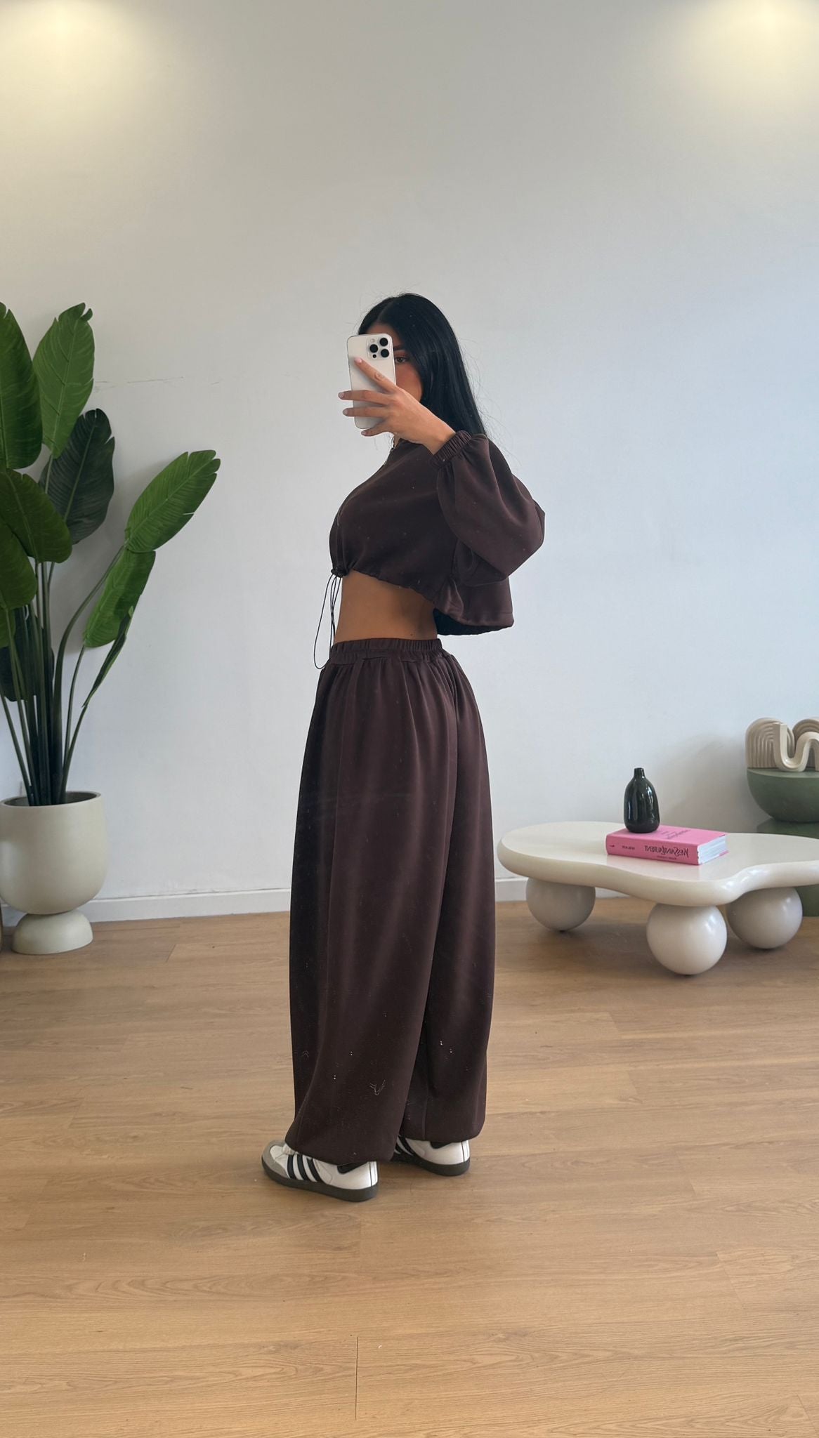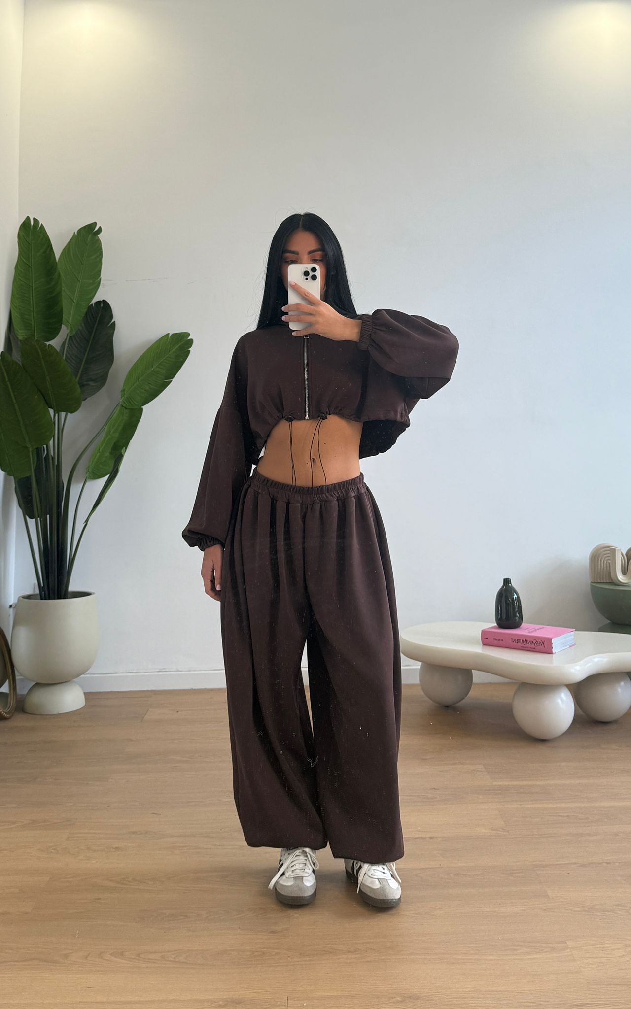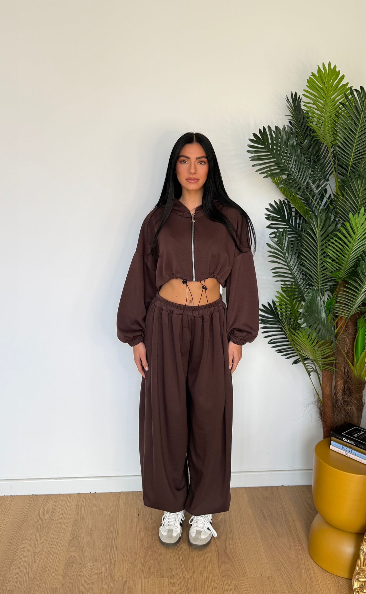 Coordinati da donna composto da felpa crop con cappuccio, chiusura zip sul davanti e coulisse regolabile, pantalone con elastico in vita e sul finale e vestirà bene fino ad una M/L