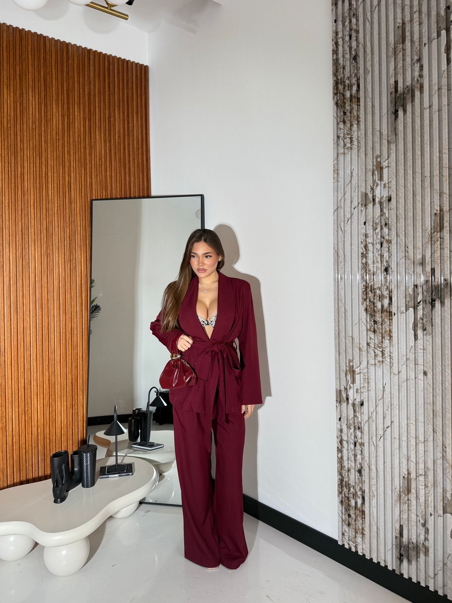 Coordinato composto da giacca foderata internamente, con spallina imbottita e tasche sul davanti, e da pantalone con gamba dritta e morbida, bottone sul davanti ed elastico sul retro. Taglia unica, e veste bene fino ad una M/L. La modella è alta 1,65 e pesa 52/53kg.