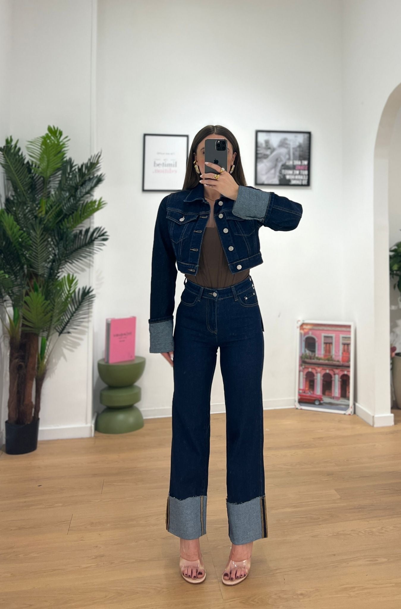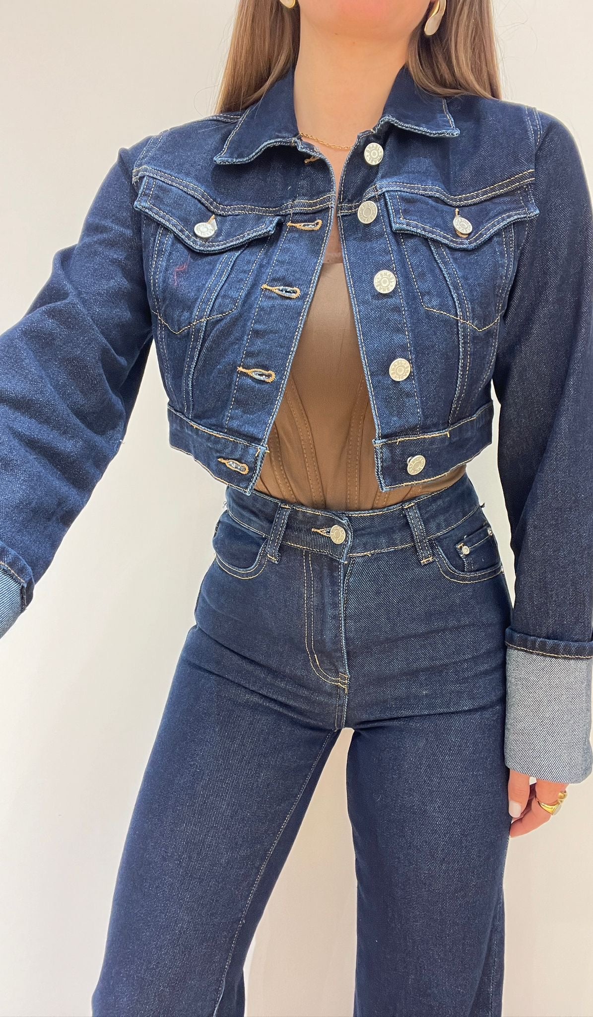 Coordinato in denim elasticizzato, composto da giubbino modello crop con piega in lavaggio più chiaro sul fondo della manica e da un jeans gamba dritta e vita alta con piegone sul fondo. Giusy veste una taglia XS.