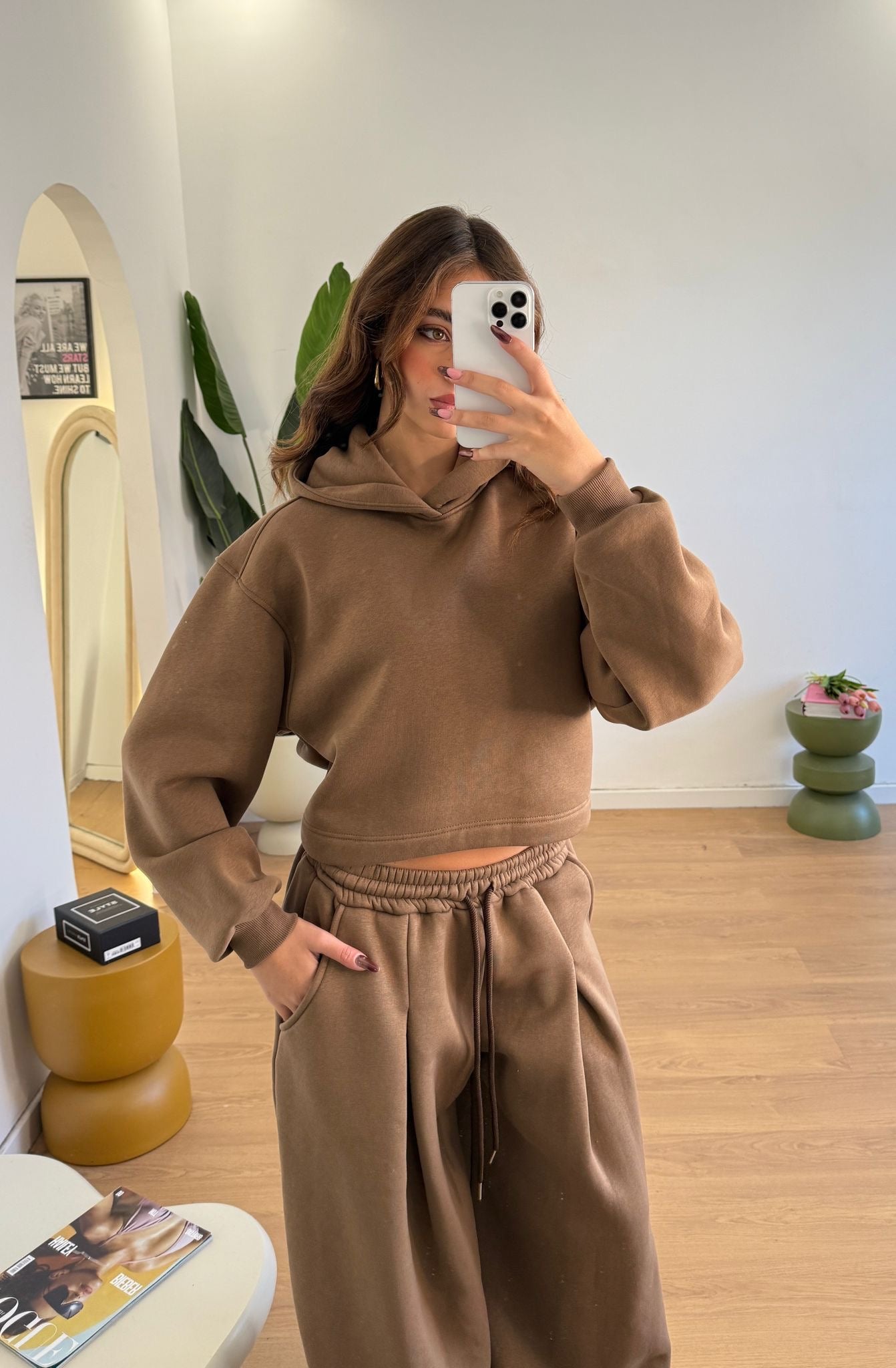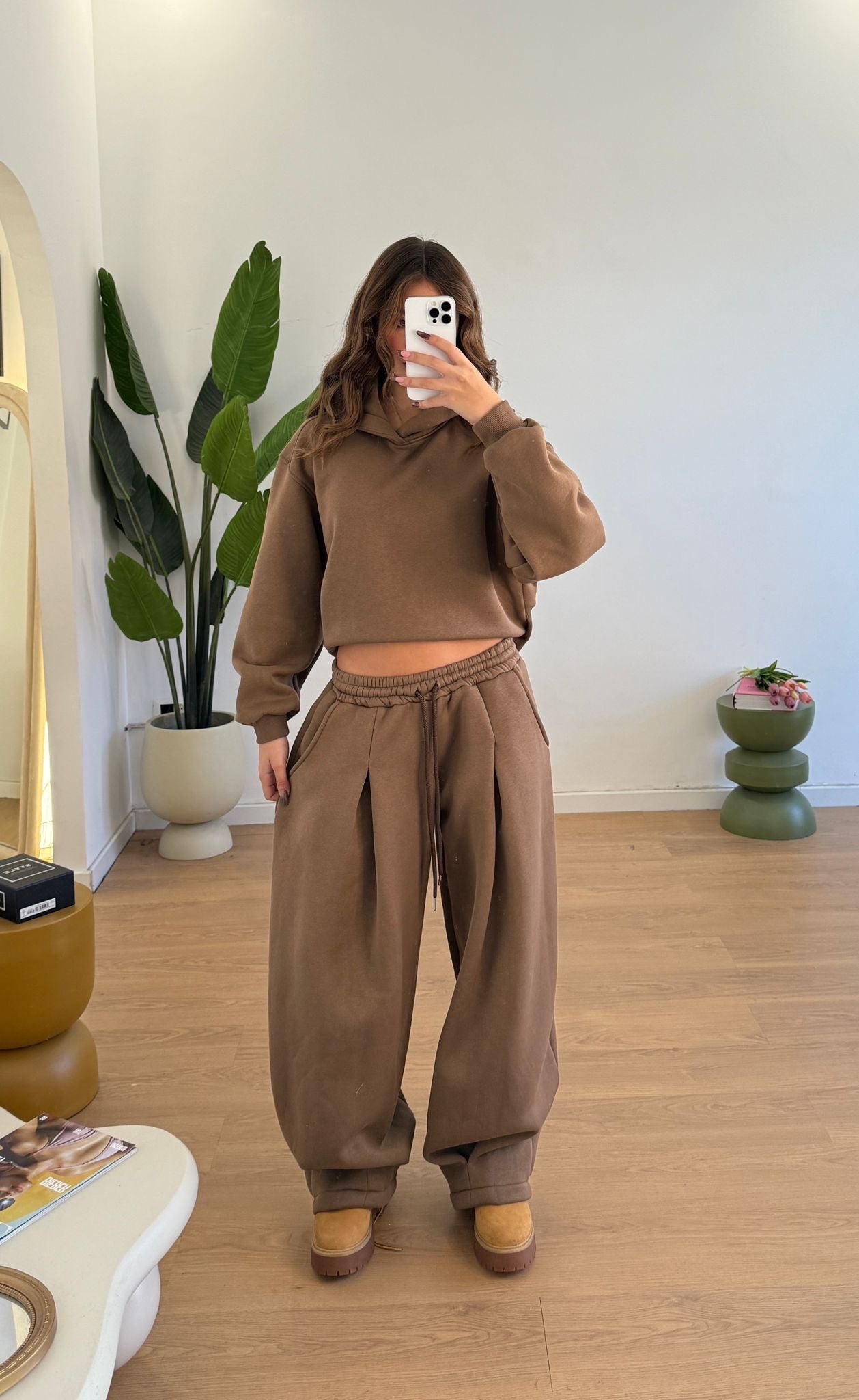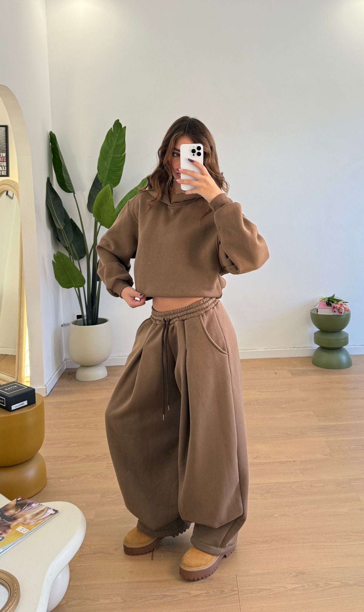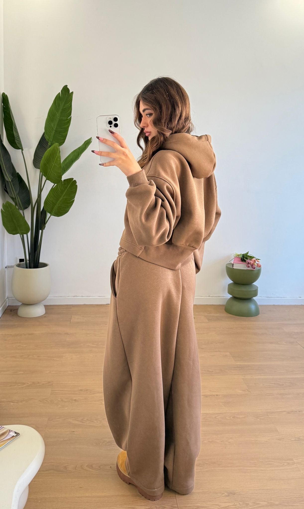 Coordinato da donna felpati internamente, composto da felpa con cappuccio, polsini ed elastico sul retro e da pantalone gamba larga, elastico in vita e laccetti regolabili. Taglia unica, veste bene fino ad una taglia 46.