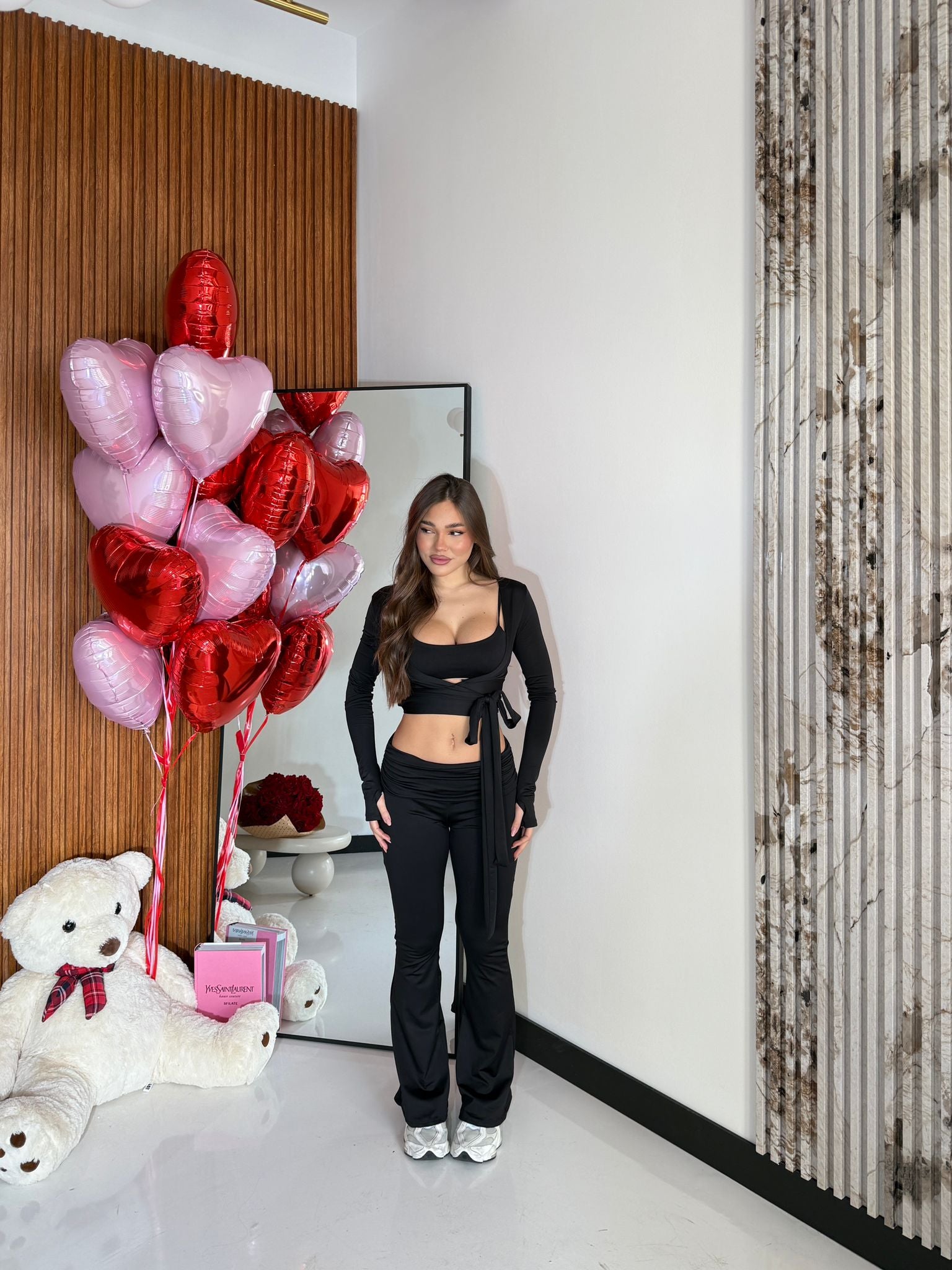 Coordinato da donna in lycra composto da top, maglia con chiusura a laccetti e manica a guanto, e da pantalone a zampa. Tessuto elasticizzato, taglia unica, veste bene fino ad una taglia M piena. La modella è alta 1,65 e pesa 52/53kg.
