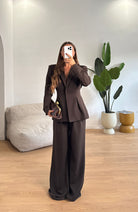 Coordinato da donna composto da giacca con spalline imbottite e pantalone con elastico in vita e vestirà bene fino ad una M/L
