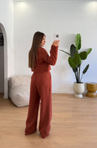 Coordinato composto da giacca con doppio bottone e spallina imbottita, e dal pantalone con gamba dritta e morbida che presenta un bottone sul davanti ed elastico sul retro. Vestibilità fino ad una M/L.