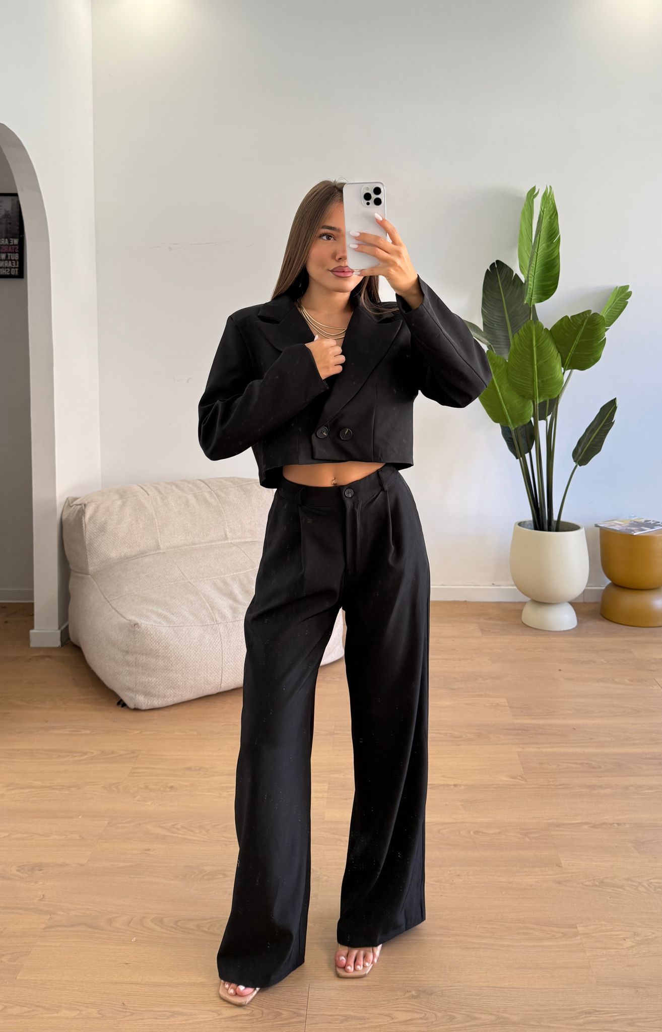 Coordinato composto da giacca con doppio bottone e spallina imbottita, e dal pantalone con gamba dritta e morbida che presenta un bottone sul davanti ed elastico sul retro. Vestibilità fino ad una M/L.