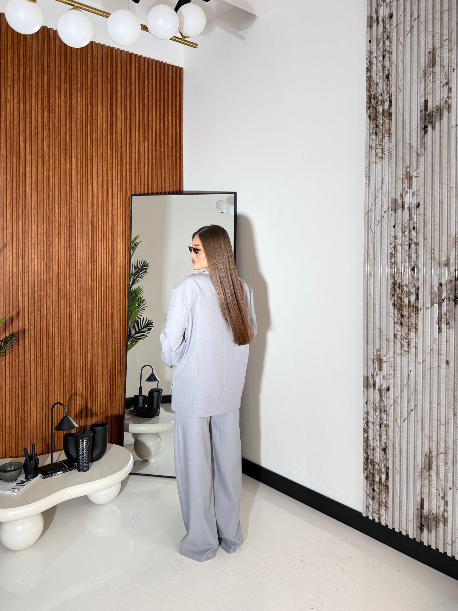 Coordinato composto da giacca modello oversize con spalline imbottite e fodera interna, chiusura a doppio petto è il pantalone ha l elastico sul retro ed è a gamba larga, vestirà bene fino ad una M/L piena e la modella è alta 1,65 cm e pesa 52/53 kg
