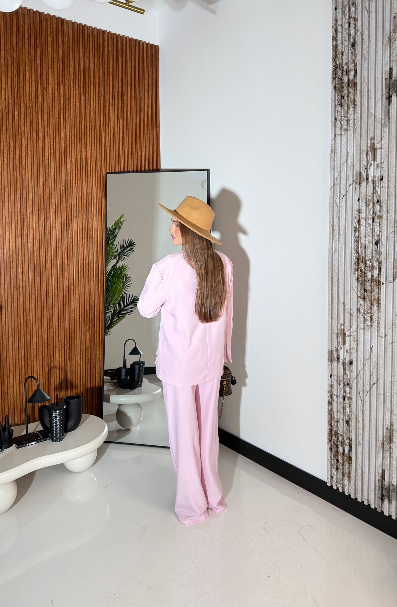 Coordinato composto da giacca modello oversize con spalline imbottite e fodera interna, chiusura a doppio petto è il pantalone ha l elastico sul retro ed è a gamba larga, vestirà bene fino ad una M/L piena e la modella è alta 1,65 cm e pesa 52/53 kg