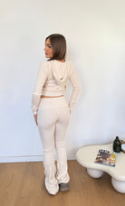 Coordinato da donna composto da felpa crop con cappuccio e chiusura zip sul davanti e e pantalone a vita alta, tessuto elasticizzato e vestirà bene fino ad una M/L