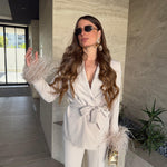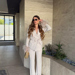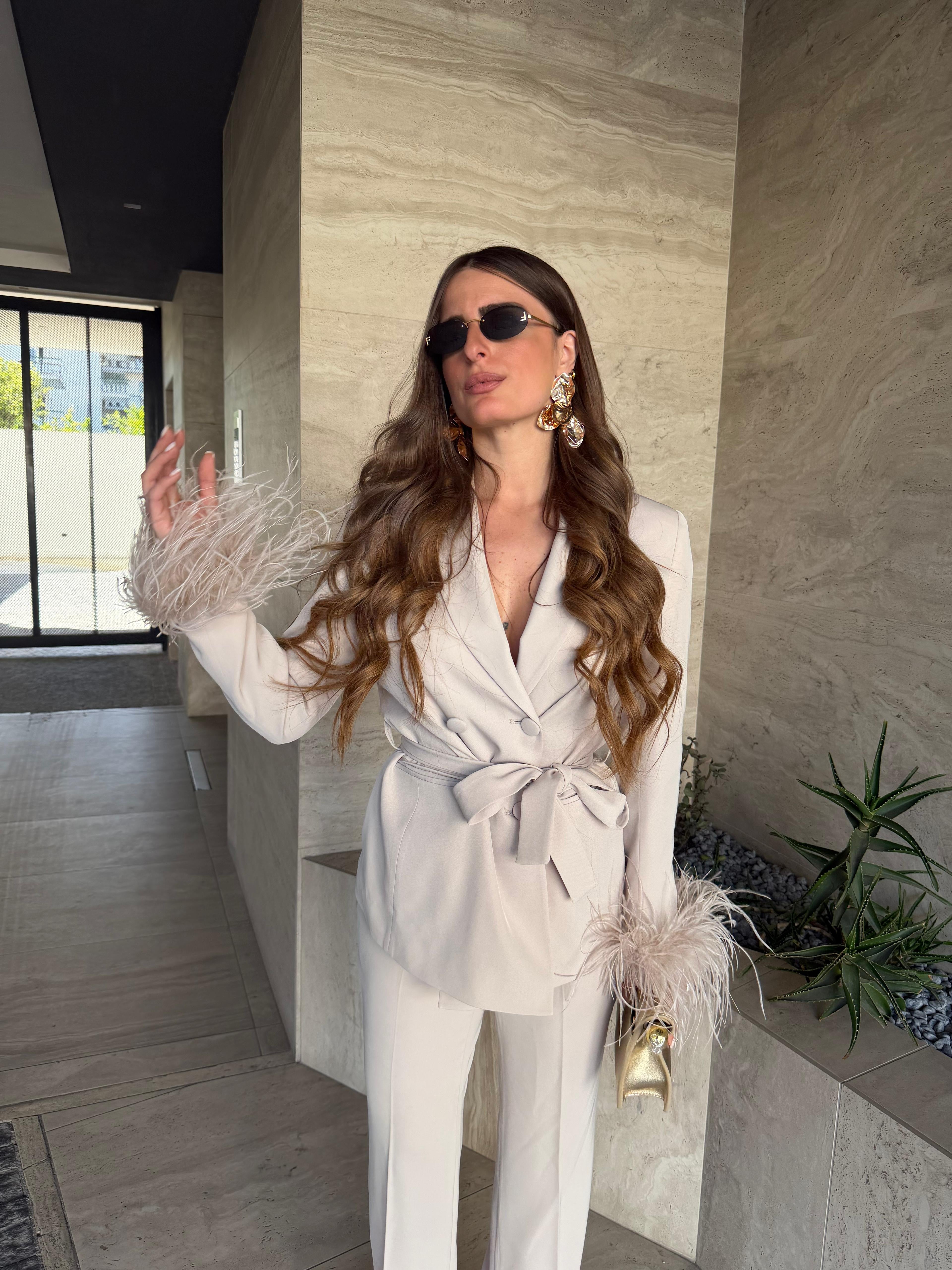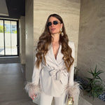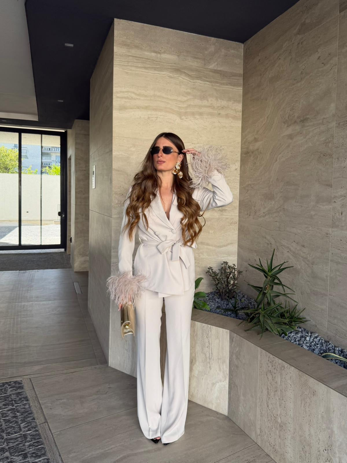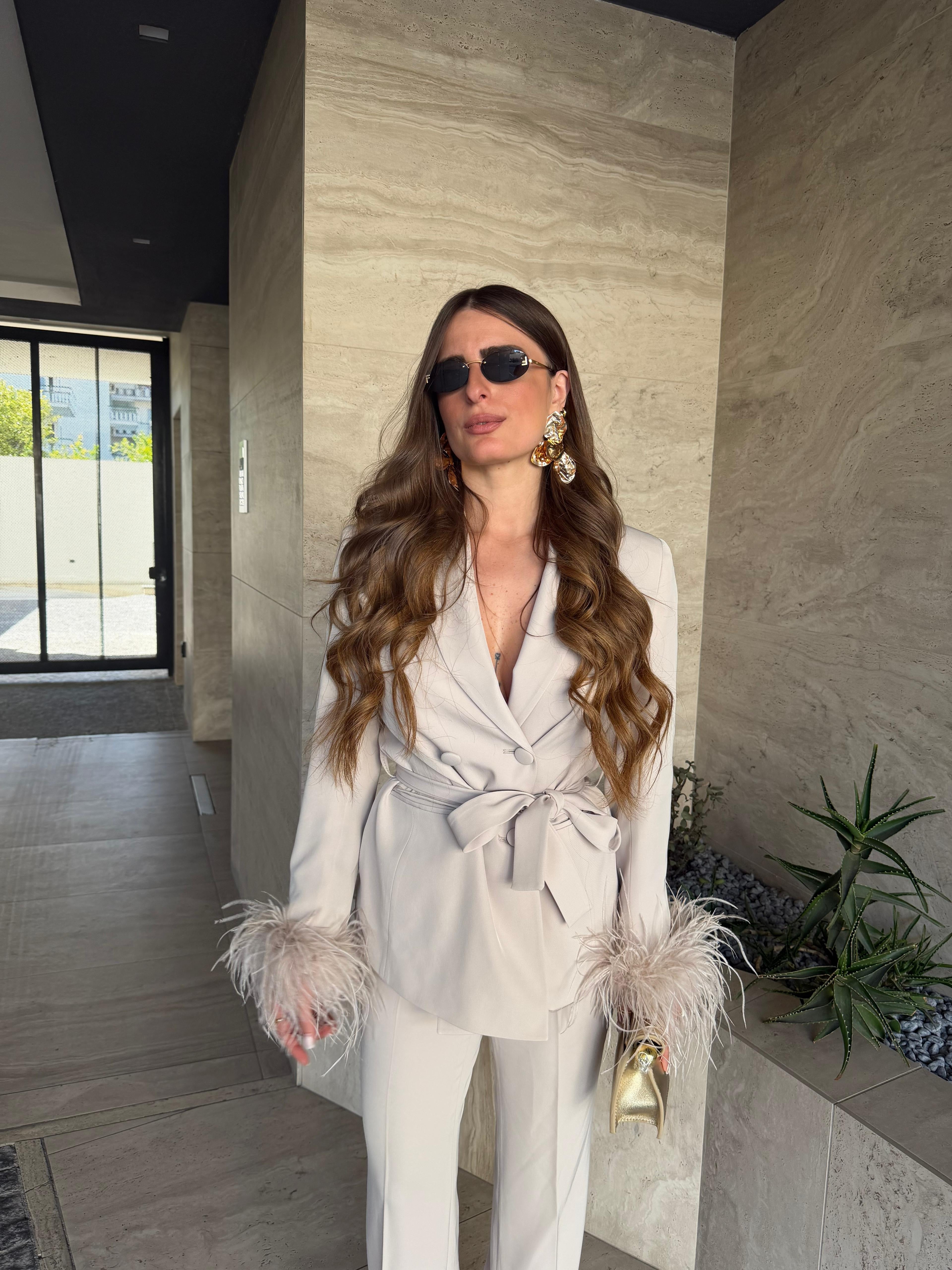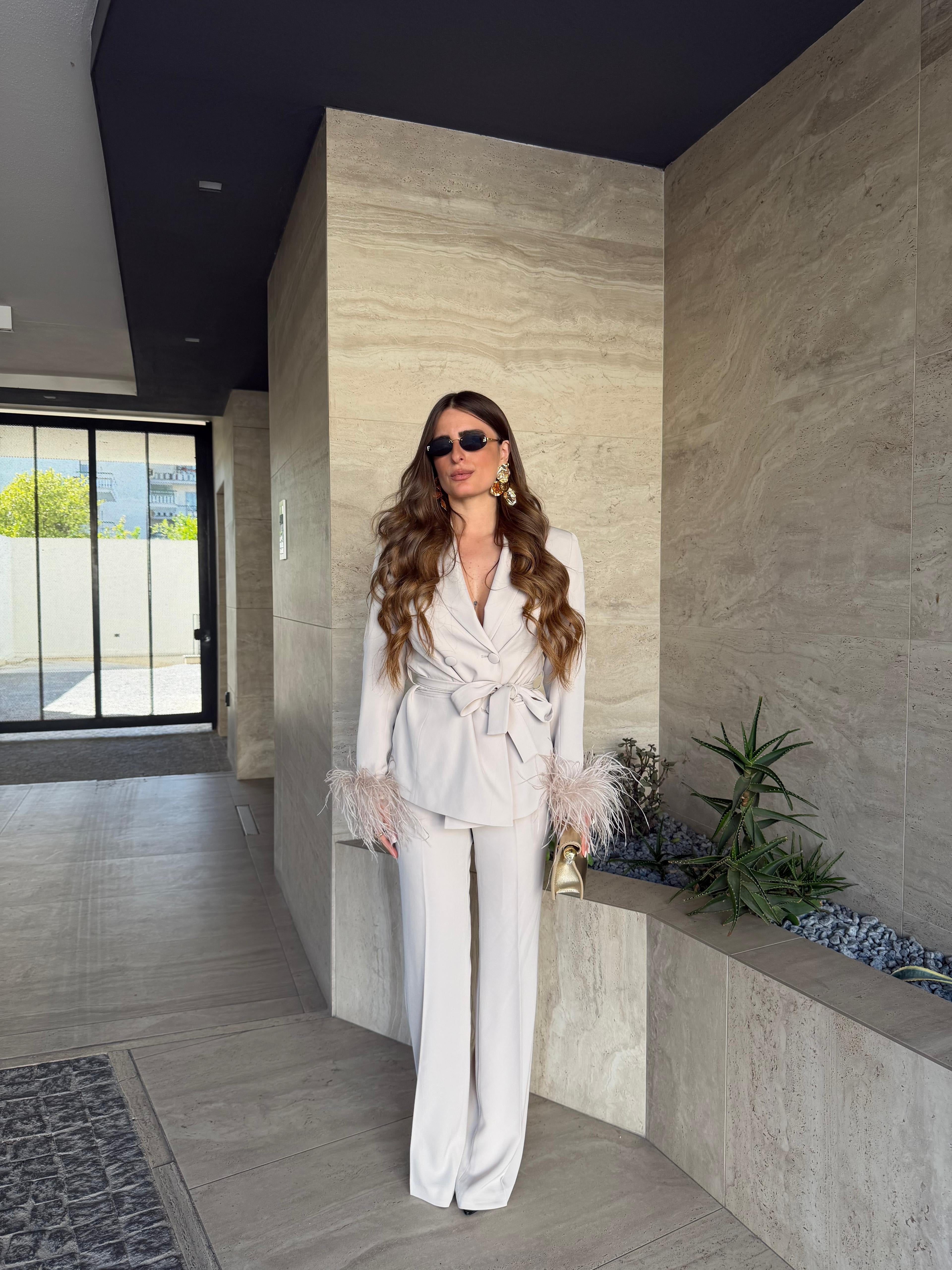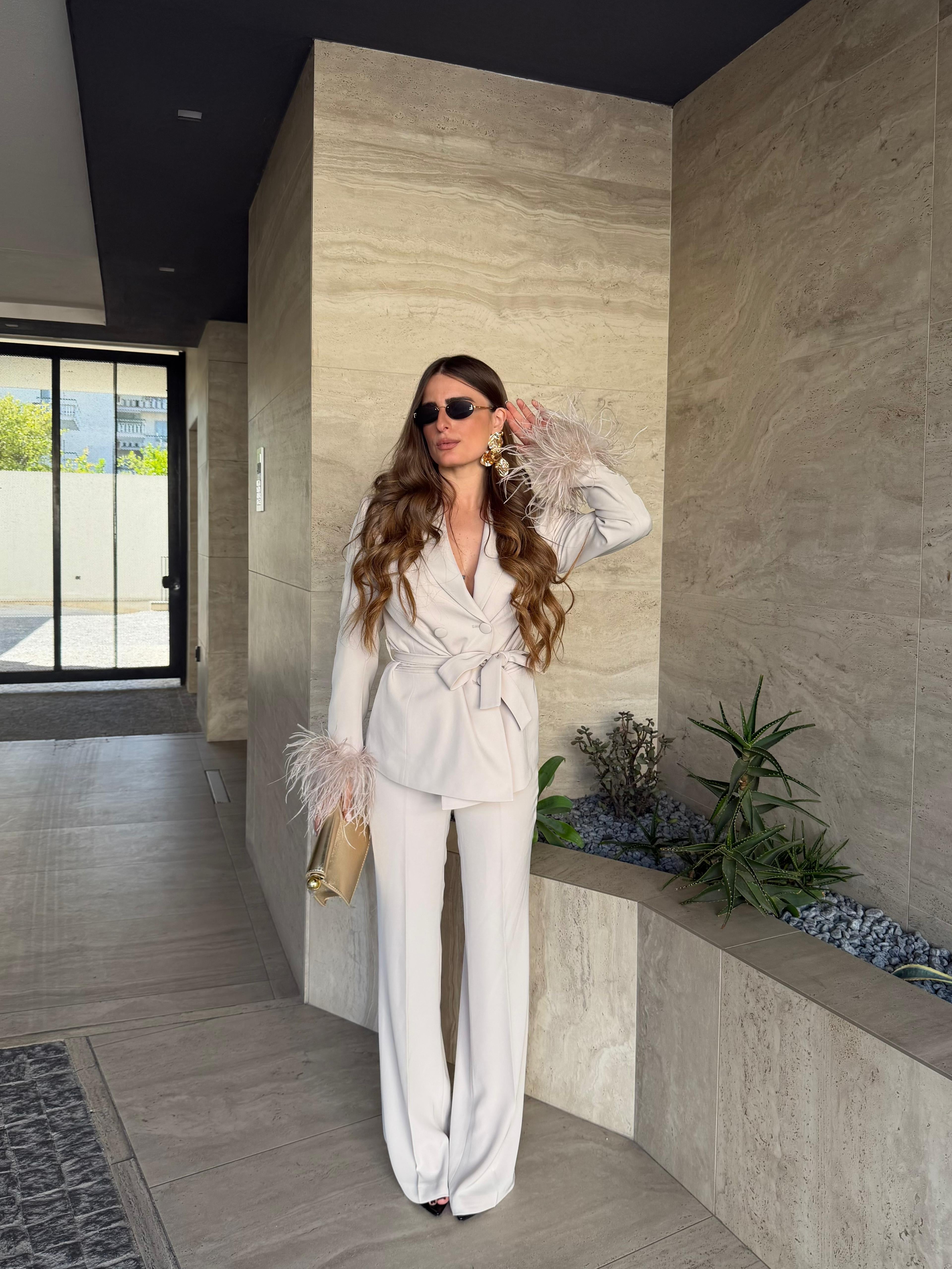 Tailleur Made in Italy by Frida, top quality, composto da giacca con piume ai polsi, chiusura sul davanti a doppiopetto e cintura compresa, e da pantalone vita alta, gamba dritta e chiusura a zip laterale. Ha una vestibilità regolare, la modella  indossa taglia XS.