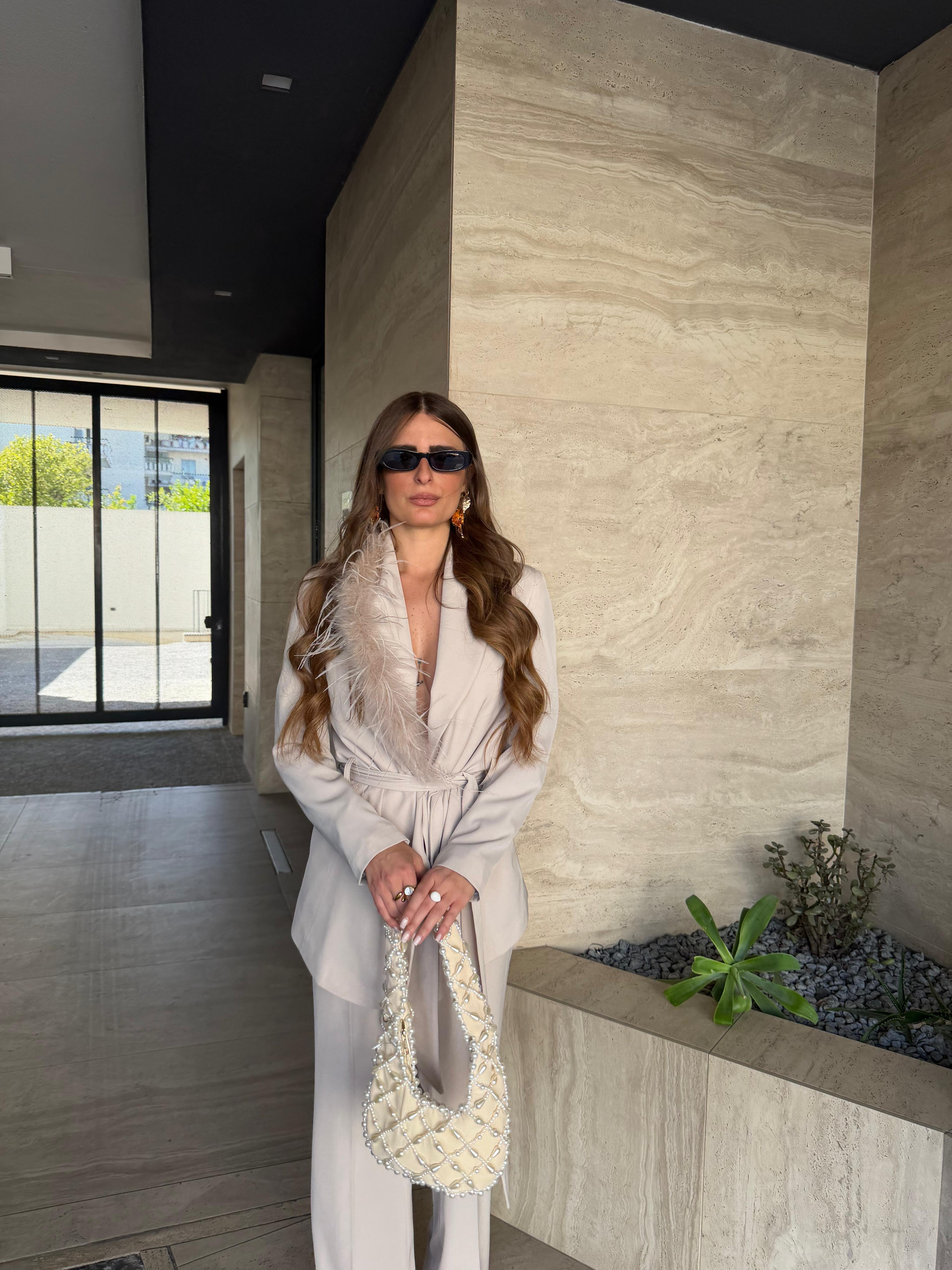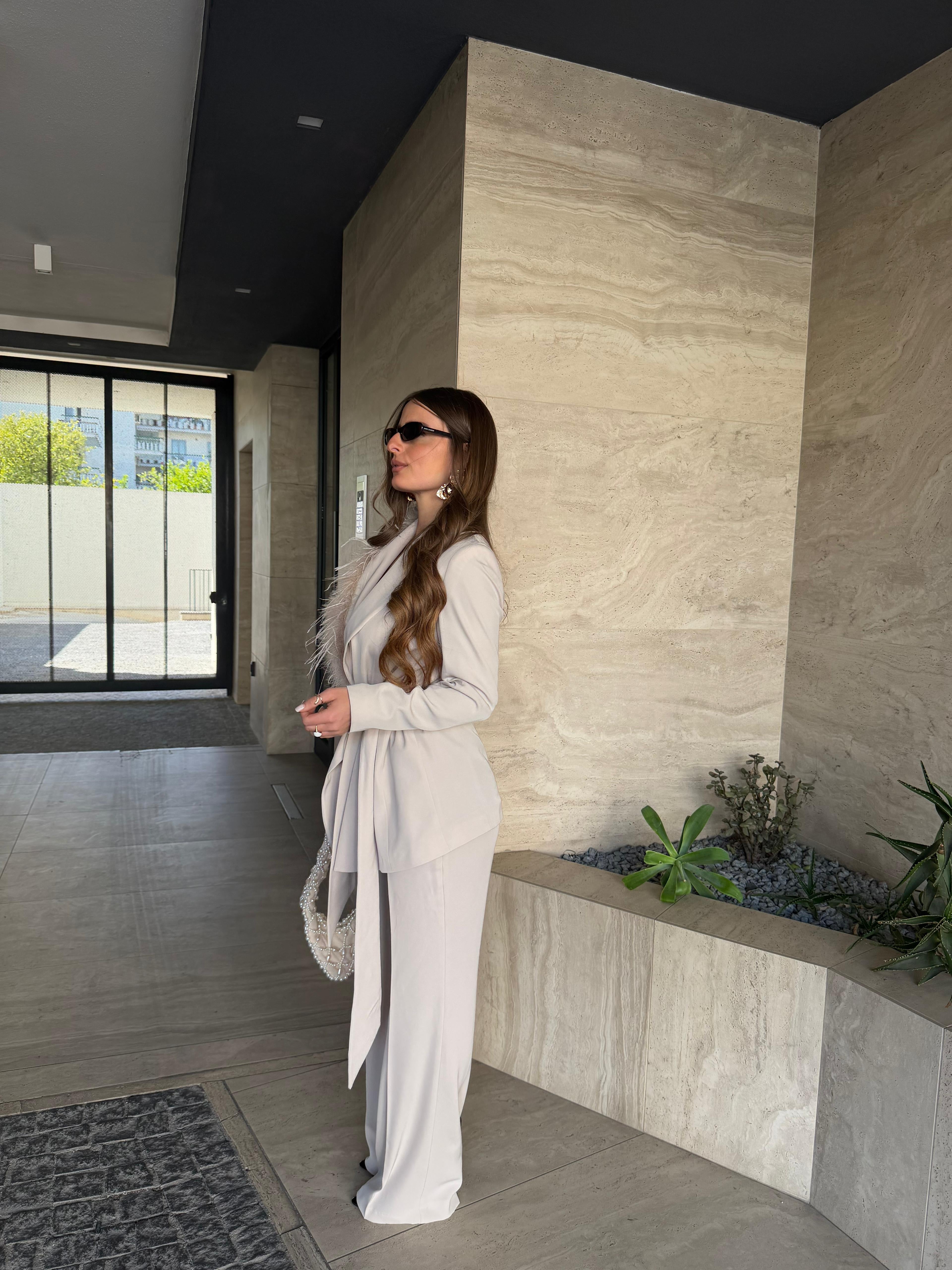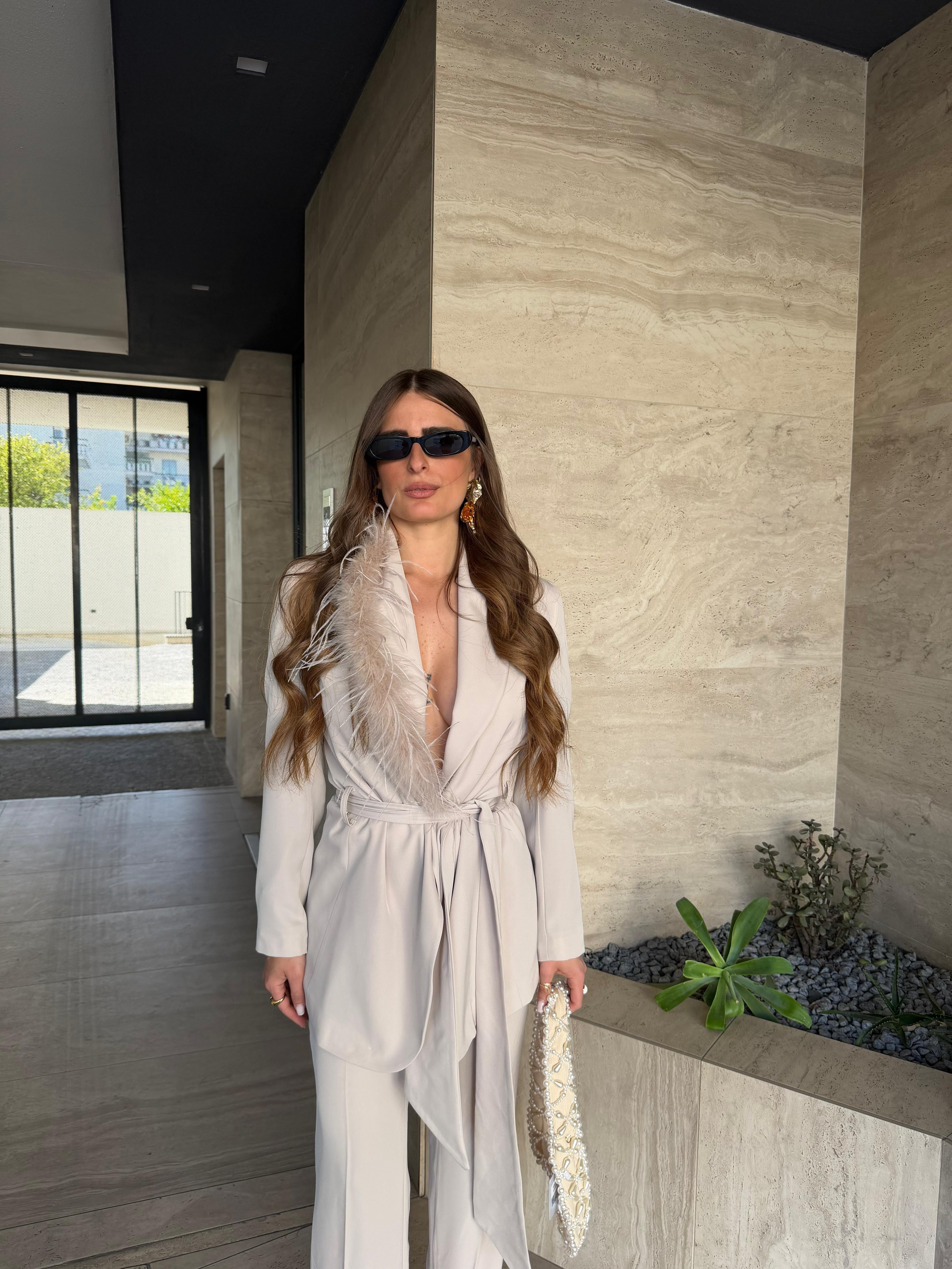 Tailleur Made in Italy by Frida, top quality, composto da giacca con piume sul davanti, cintura compresa e non presenta bottoni, e da pantalone vita alta, gamba dritta e chiusura a zip laterale. Ha una vestibilità regolare, la modella indossa taglia XS.