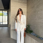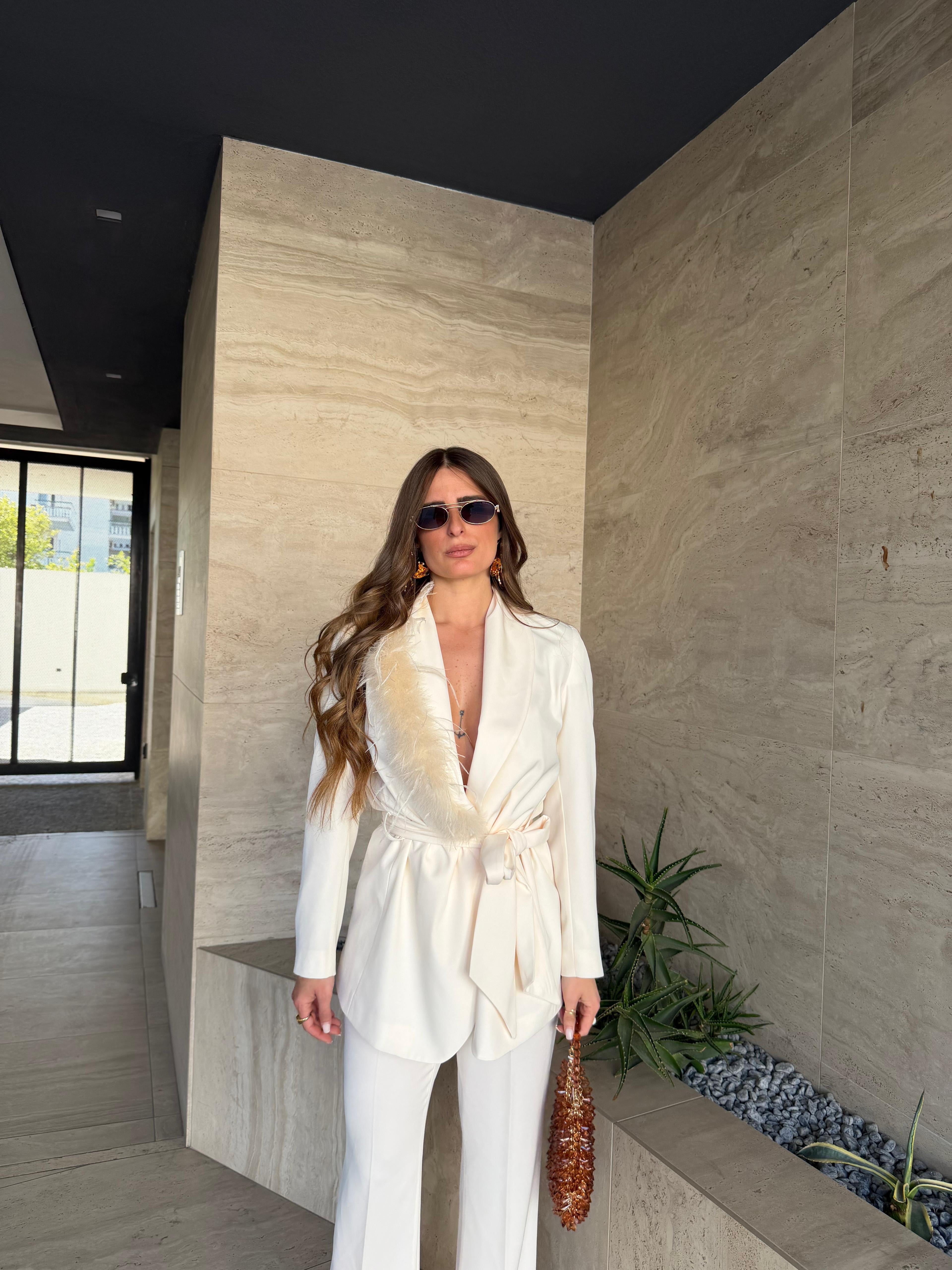 Tailleur Made in Italy by Frida, top quality, composto da giacca con piume sul davanti, cintura compresa e non presenta bottoni, e da pantalone vita alta, gamba dritta e chiusura a zip laterale. Ha una vestibilità regolare, la modella  indossa taglia XS.