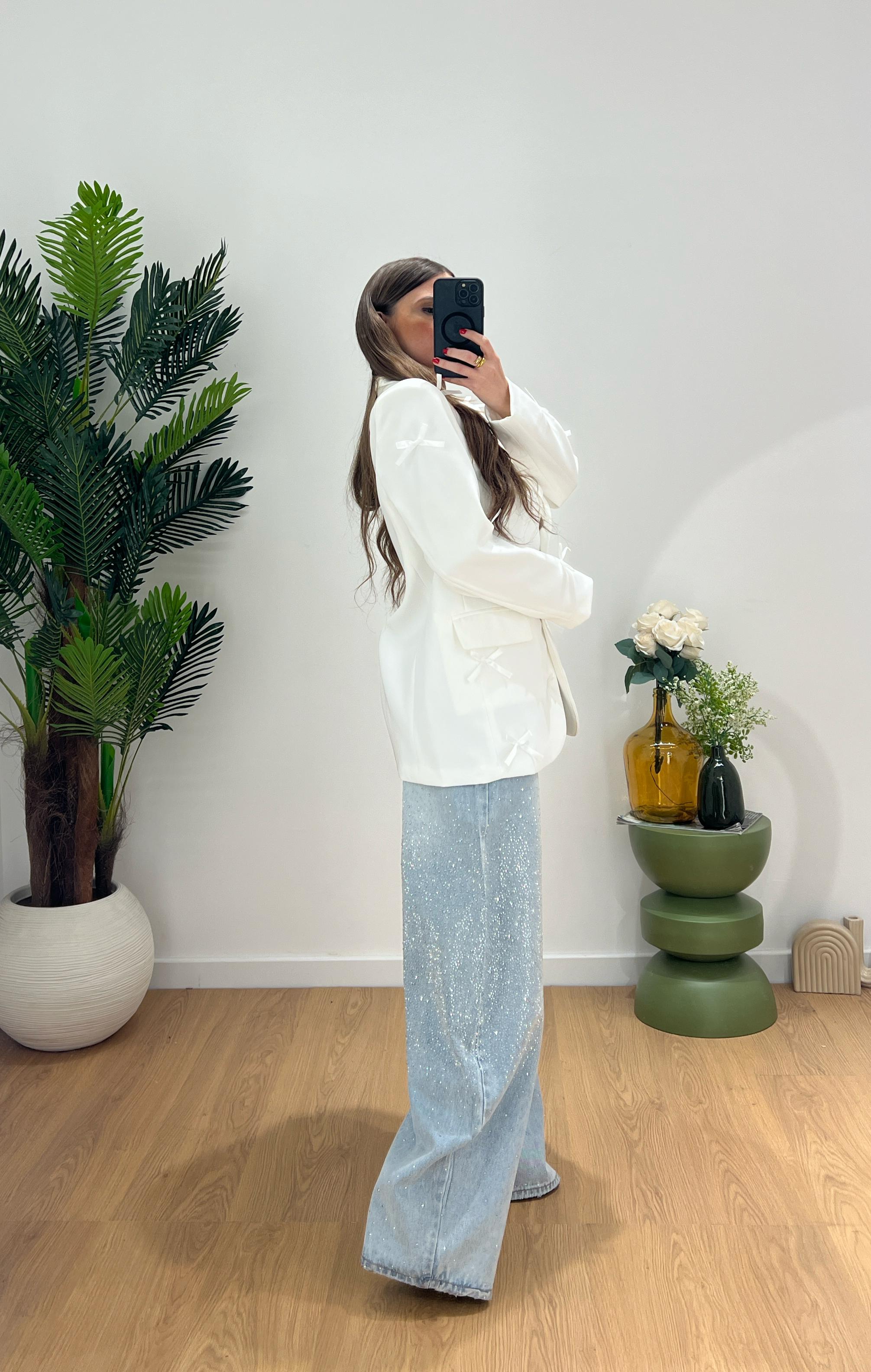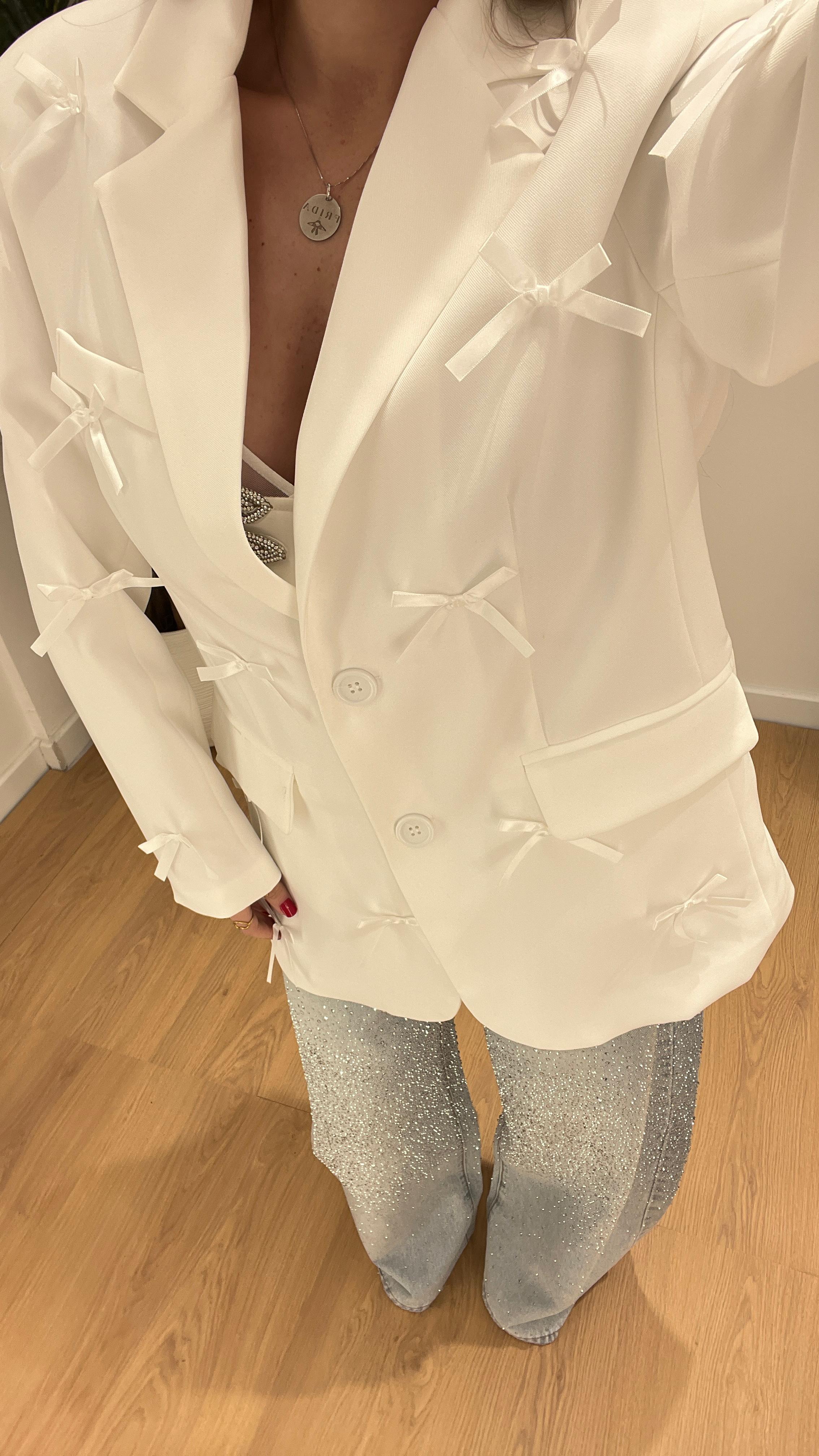 Blazer da donna top quality foderata internamente e con spalline imbottite e applicazione fiocchi non rimovibili. Veste regolarmente la propria taglia e Giusy indossa taglia S