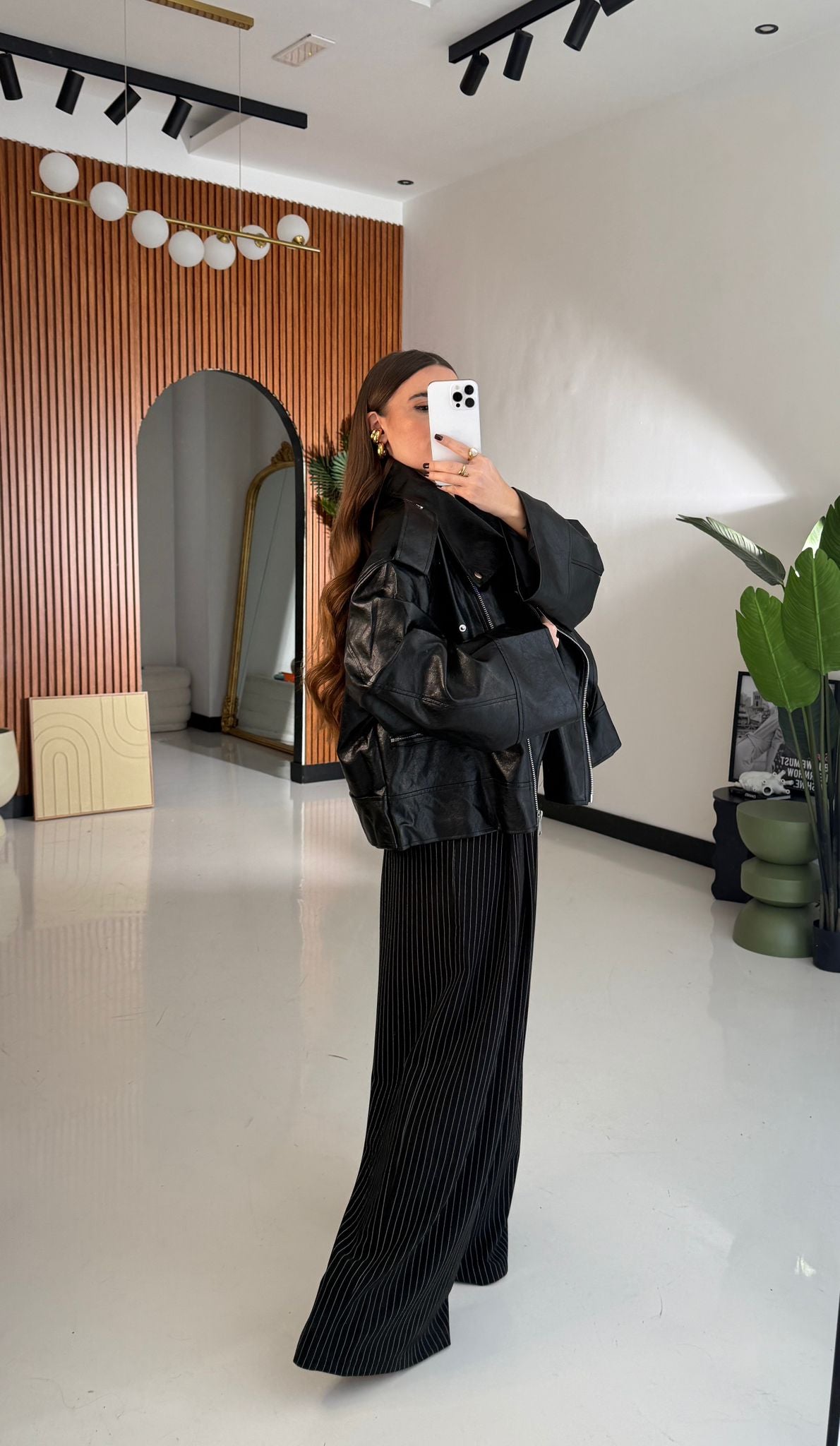 Chiodo da donna top quality in ecopelle semi lucida, vestibilità oversize con chiusura in zip sul davanti. Vestirà bene fino ad una L/XL e la modella è alta 1,65 e pesa 52/53 kg
