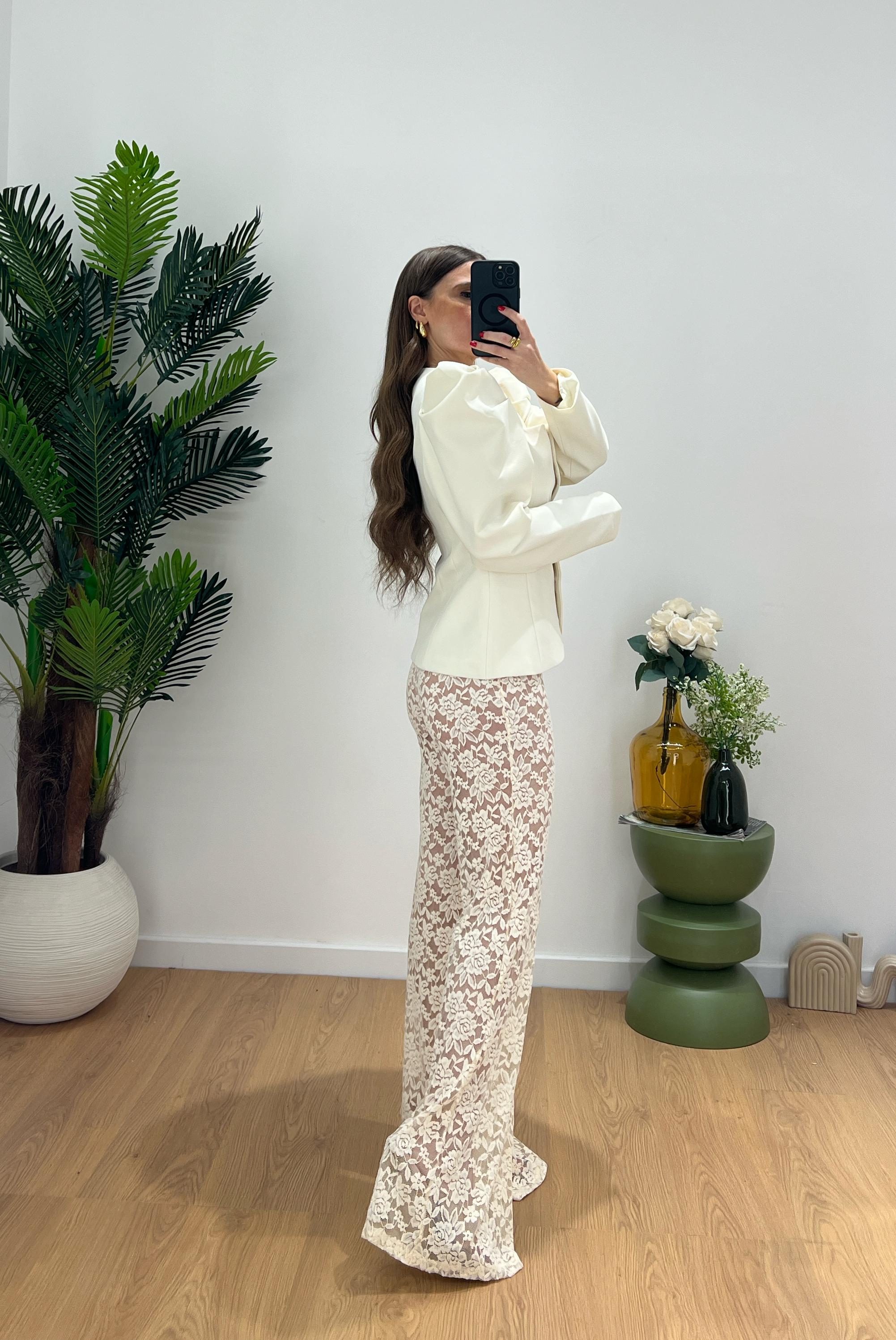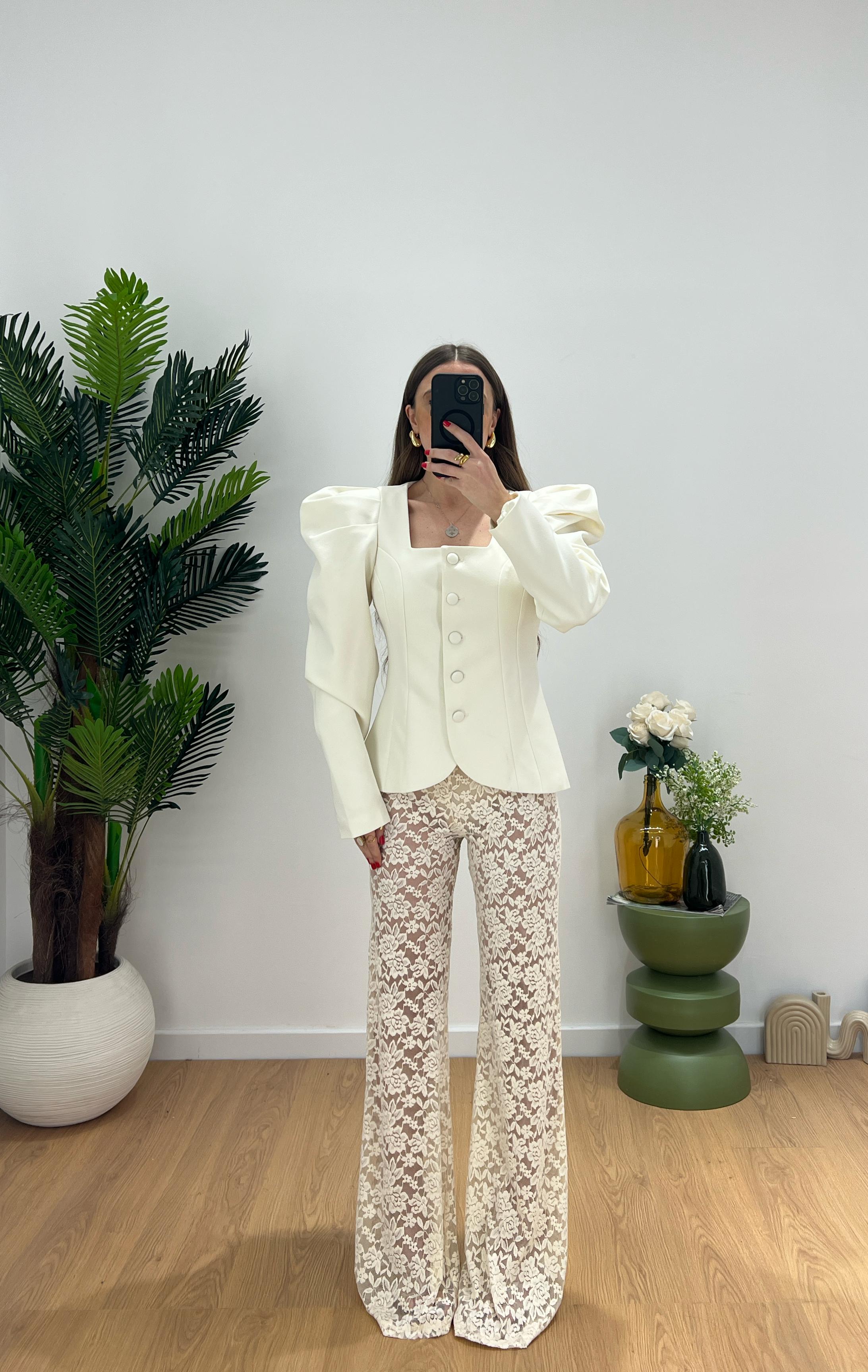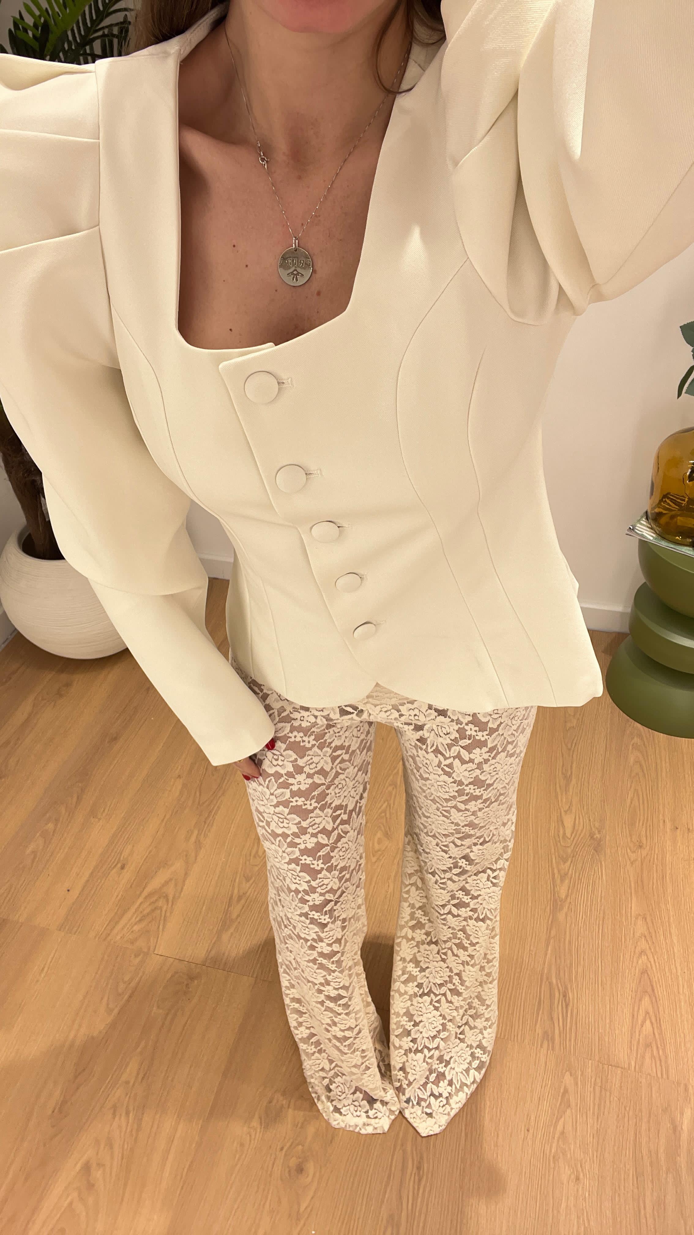 Giacca da donna con scollo quadrato sul davanti e chiusura con bottoncini rivestiti e particolarità con spalle a buffo, veste regolarmente la propria taglia e giusy indossa taglia S