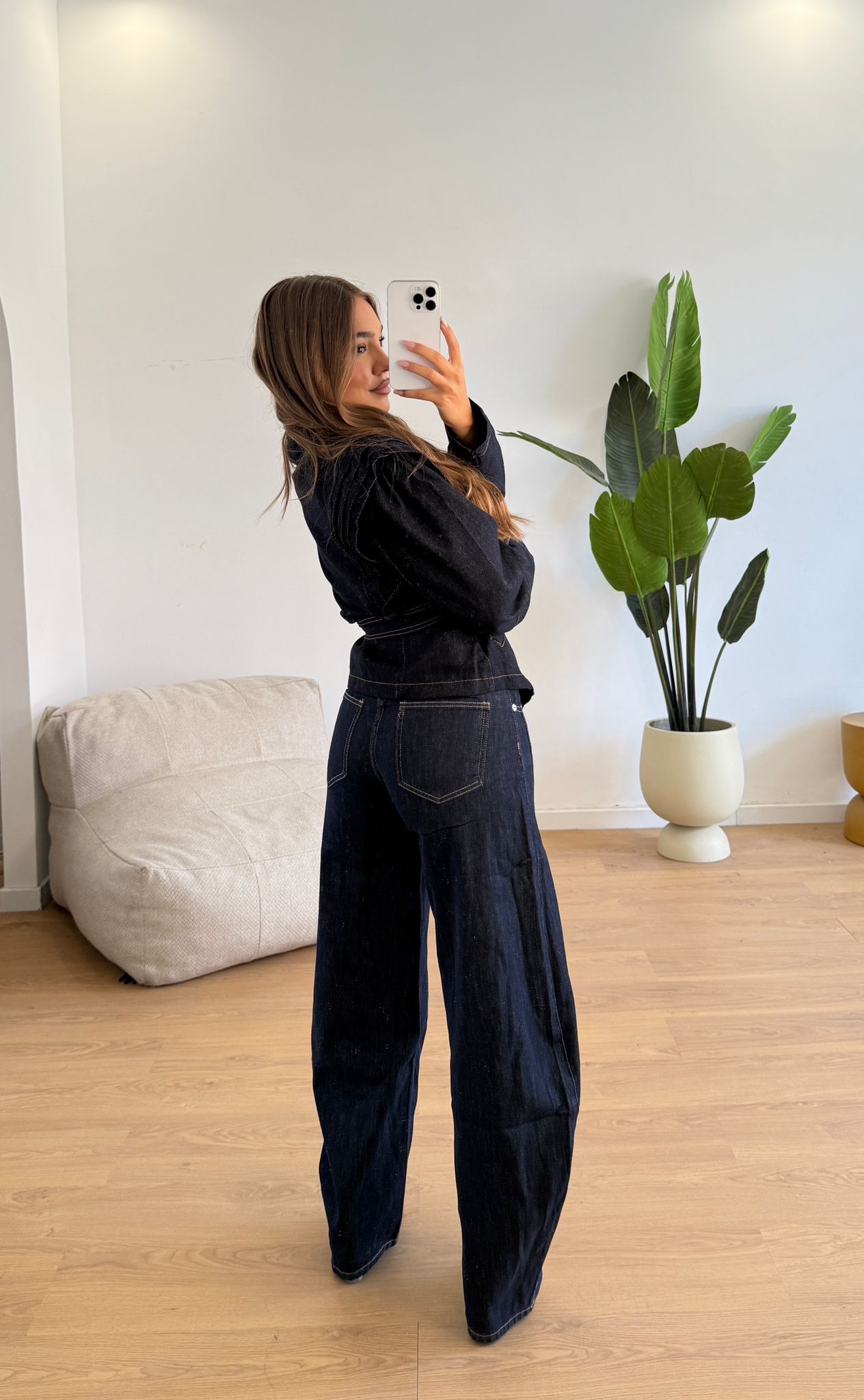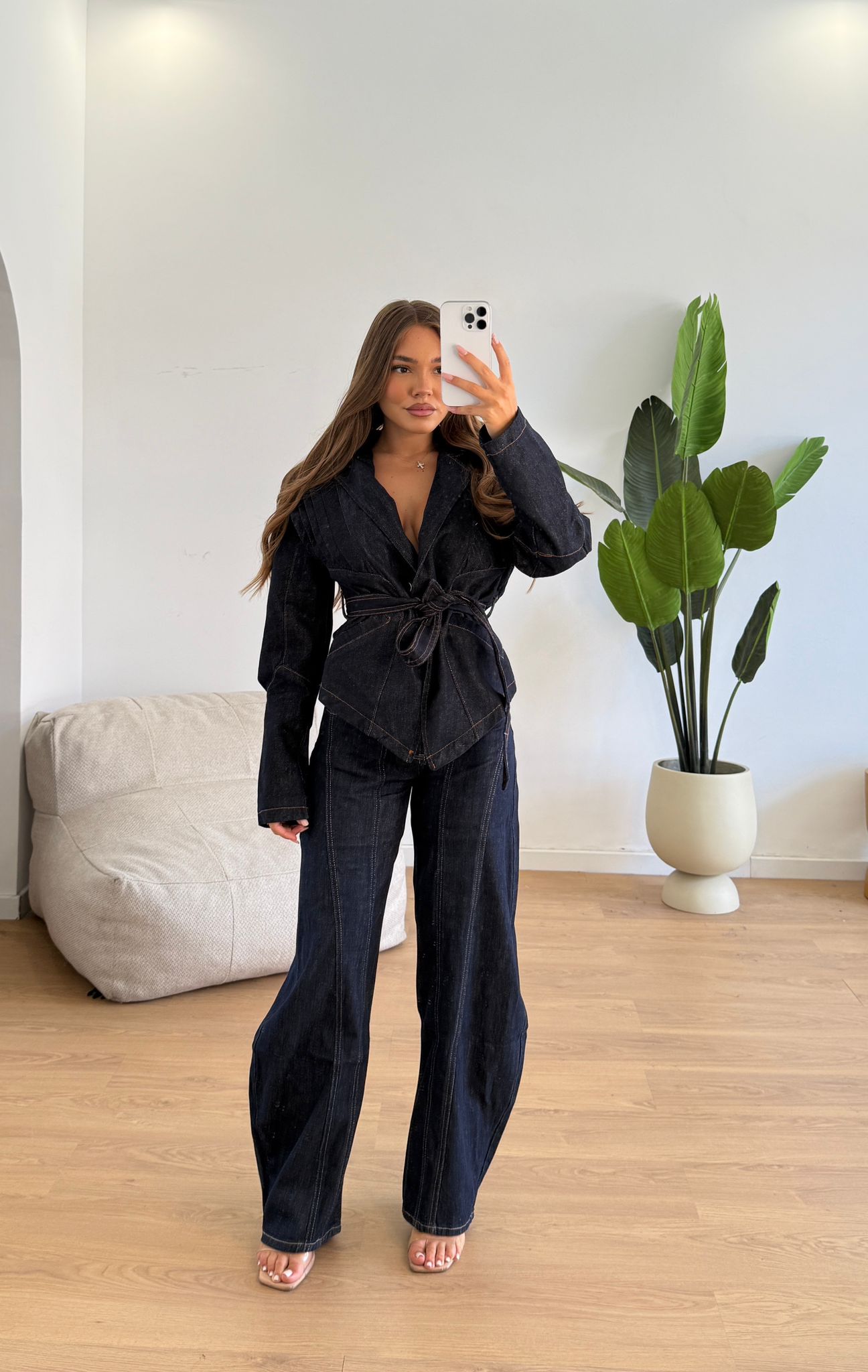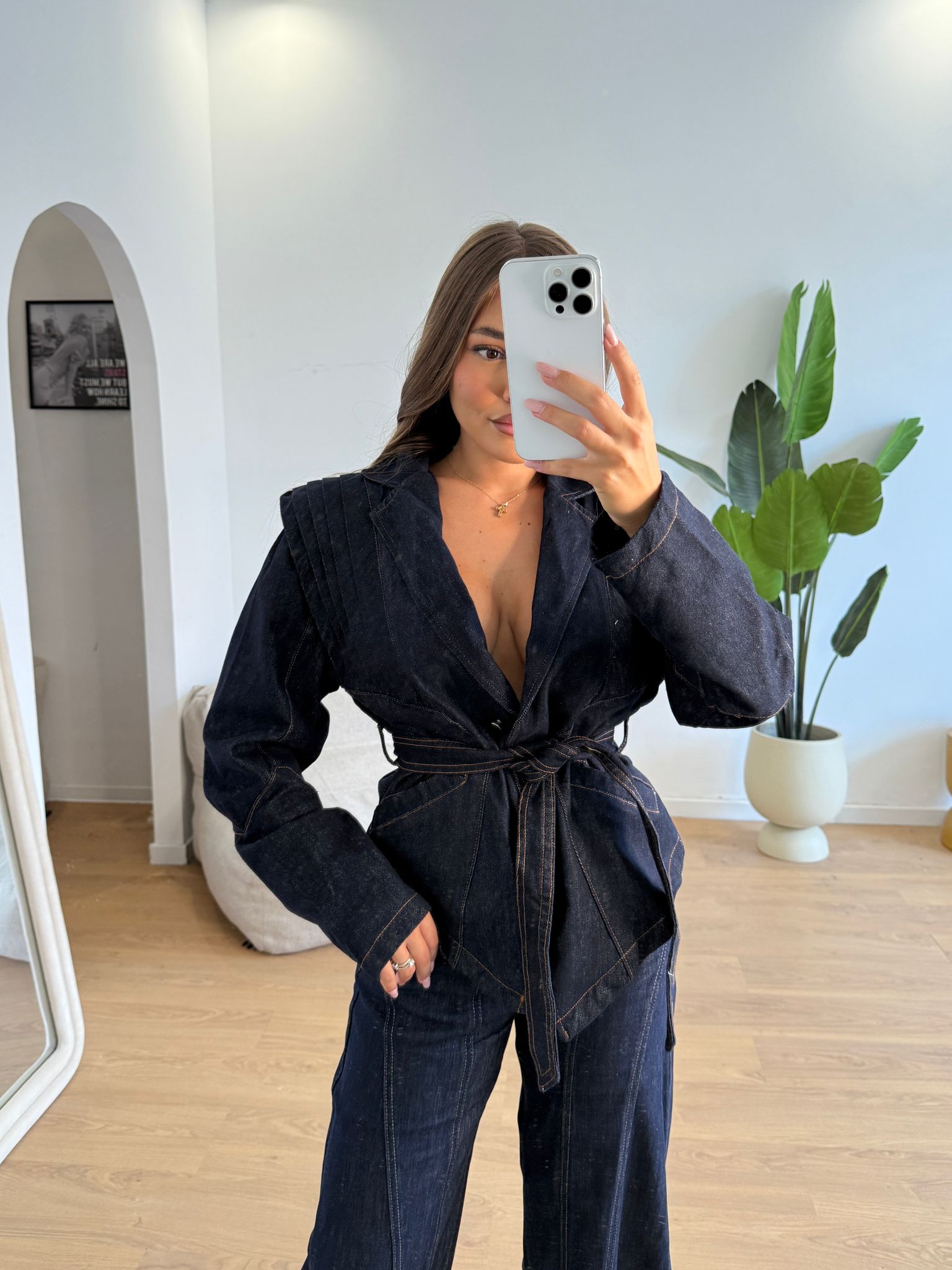 Giacca da donna in denim scuro, tessuto rigido con cintura e veste regolarmente la propria taglia e la modella indossa taglia S/M