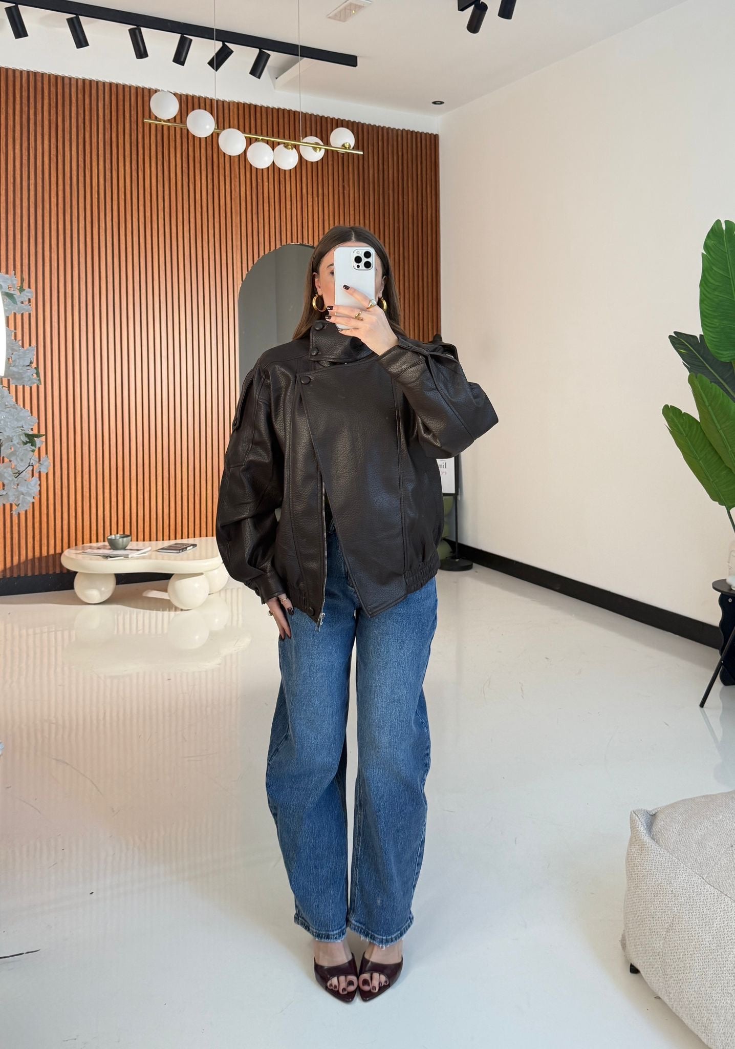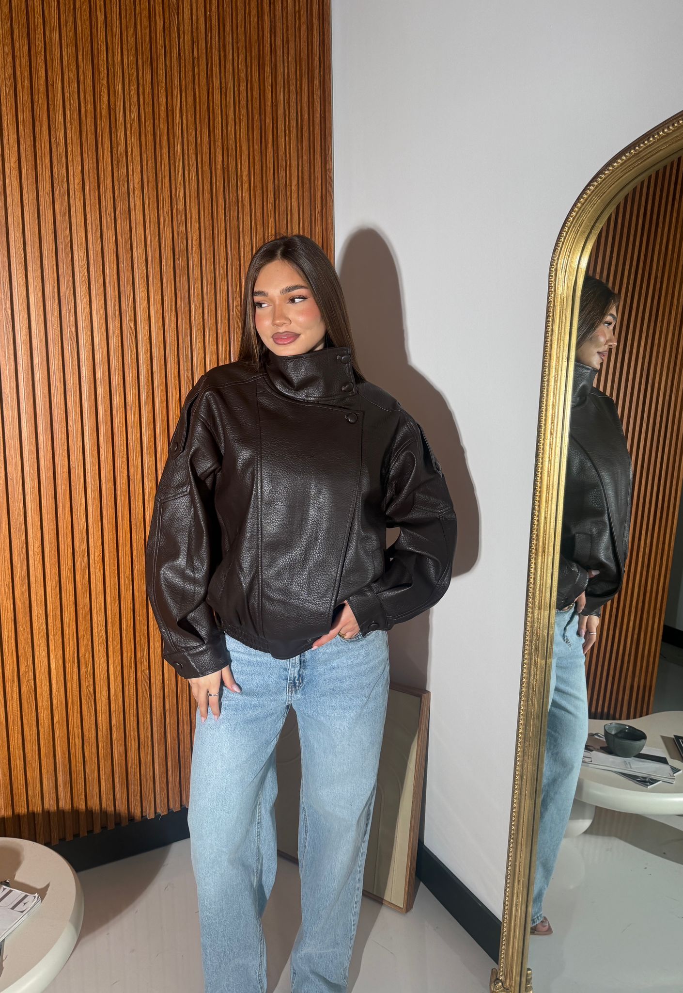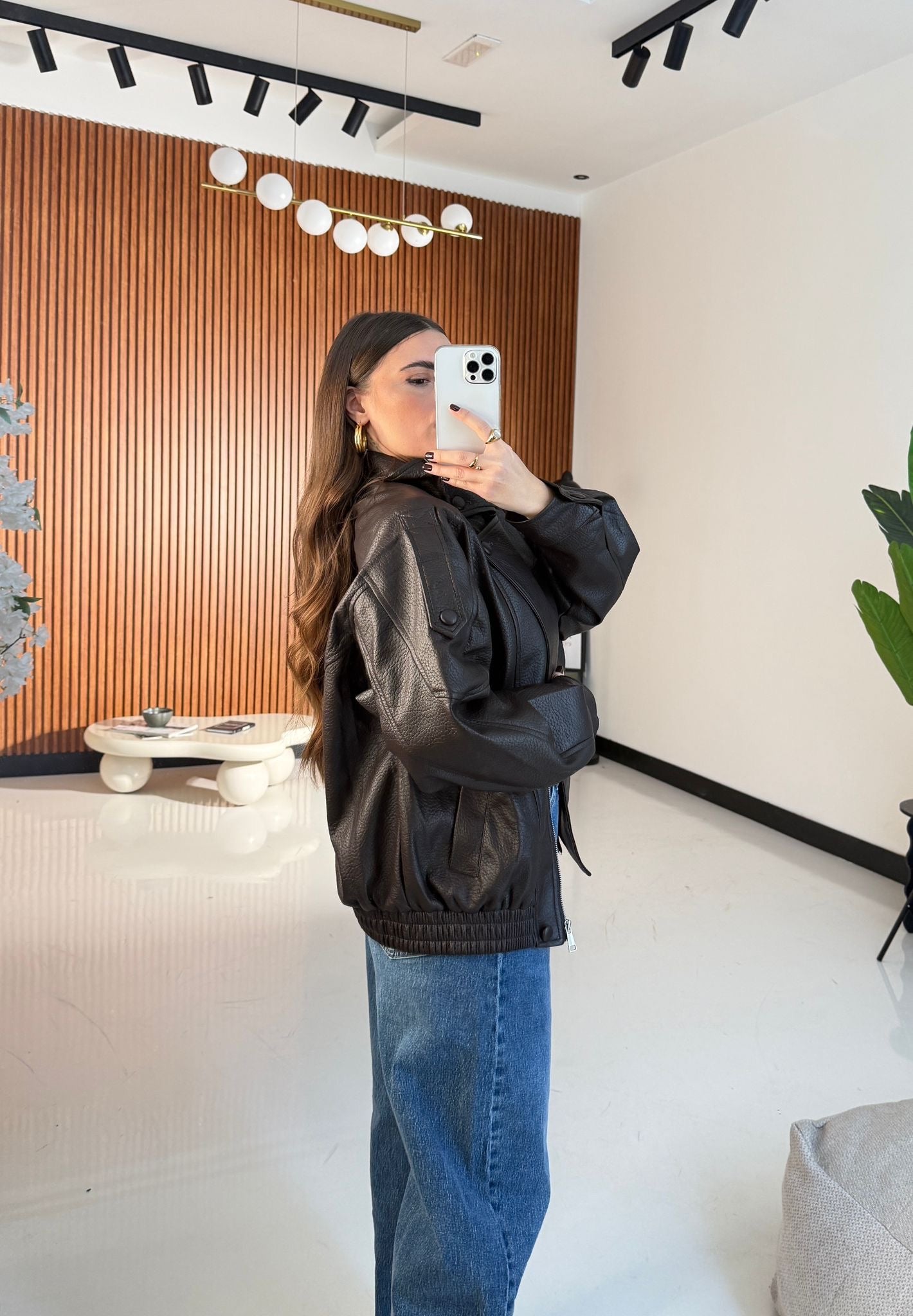 Giubbino da donna in ecopelle, foderato internamente, top quality, con chiusura zip sul davanti ed elastico sul finale. Taglia unica, veste bene fino ad una taglia L/XL. La modella è alta 1,65 e pesa 52/53 kg.