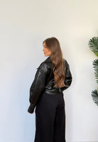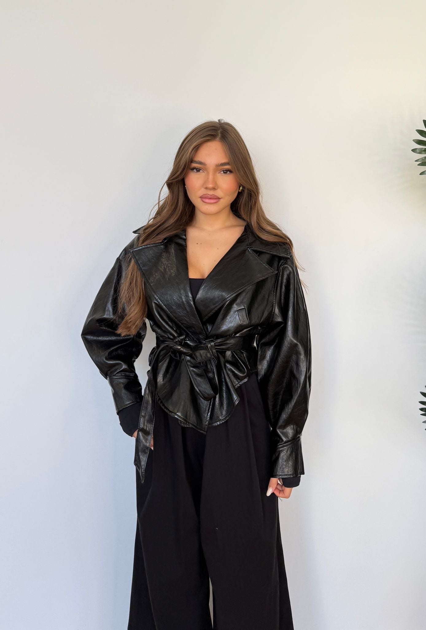 Giubbino da donna in ecopelle, foderato internamente, con cintura in vita. Taglia unica, veste bene fino ad una M.