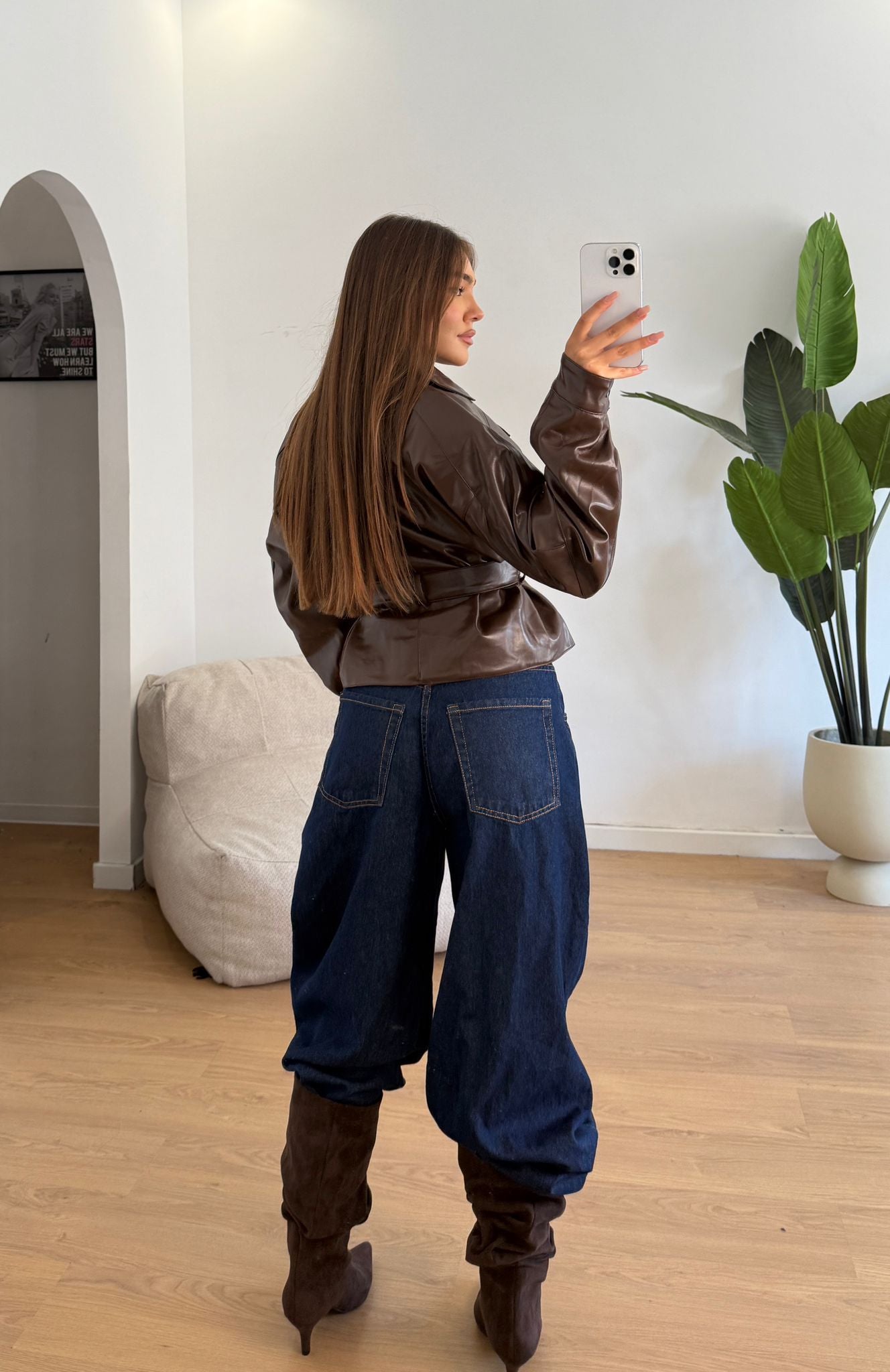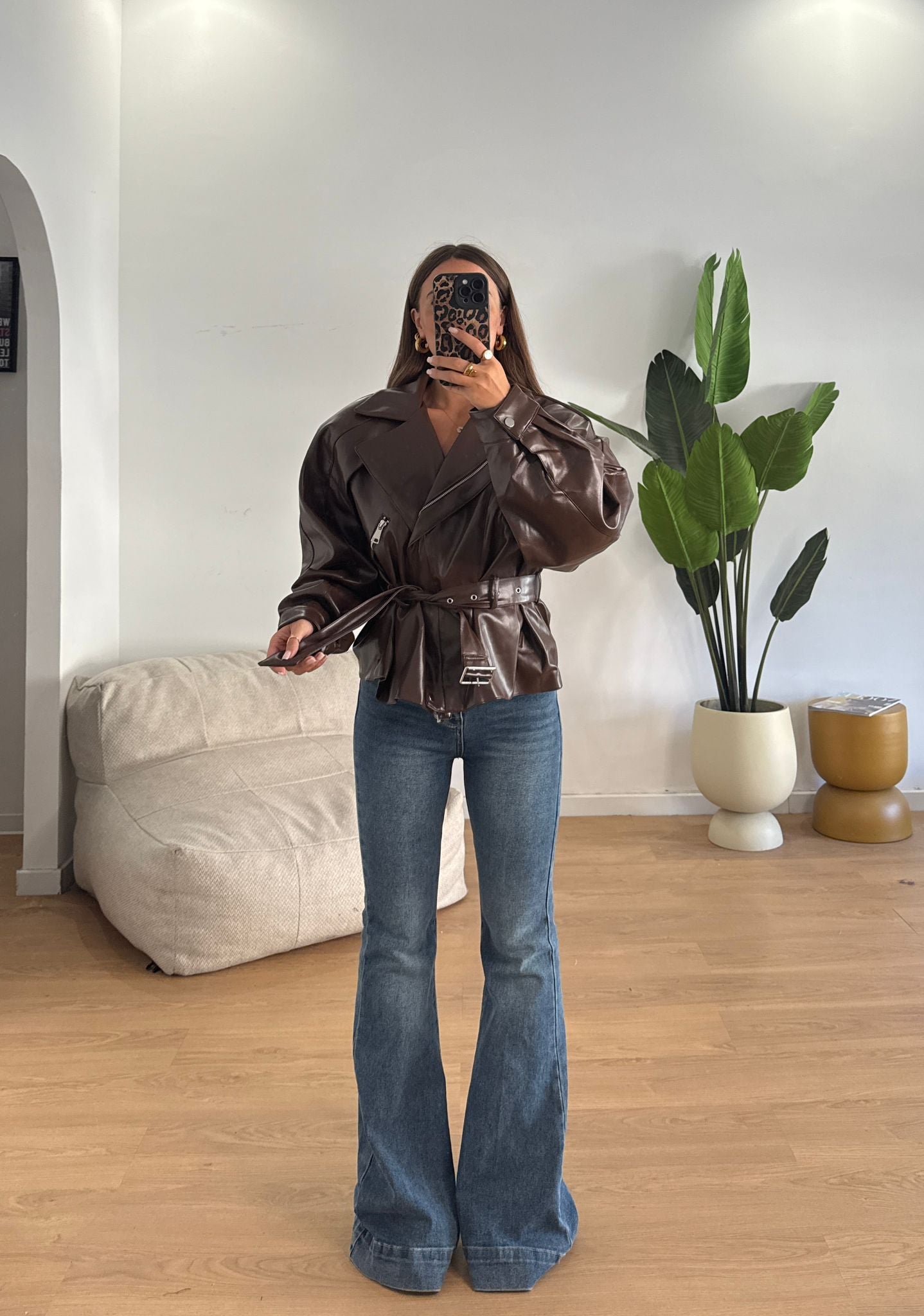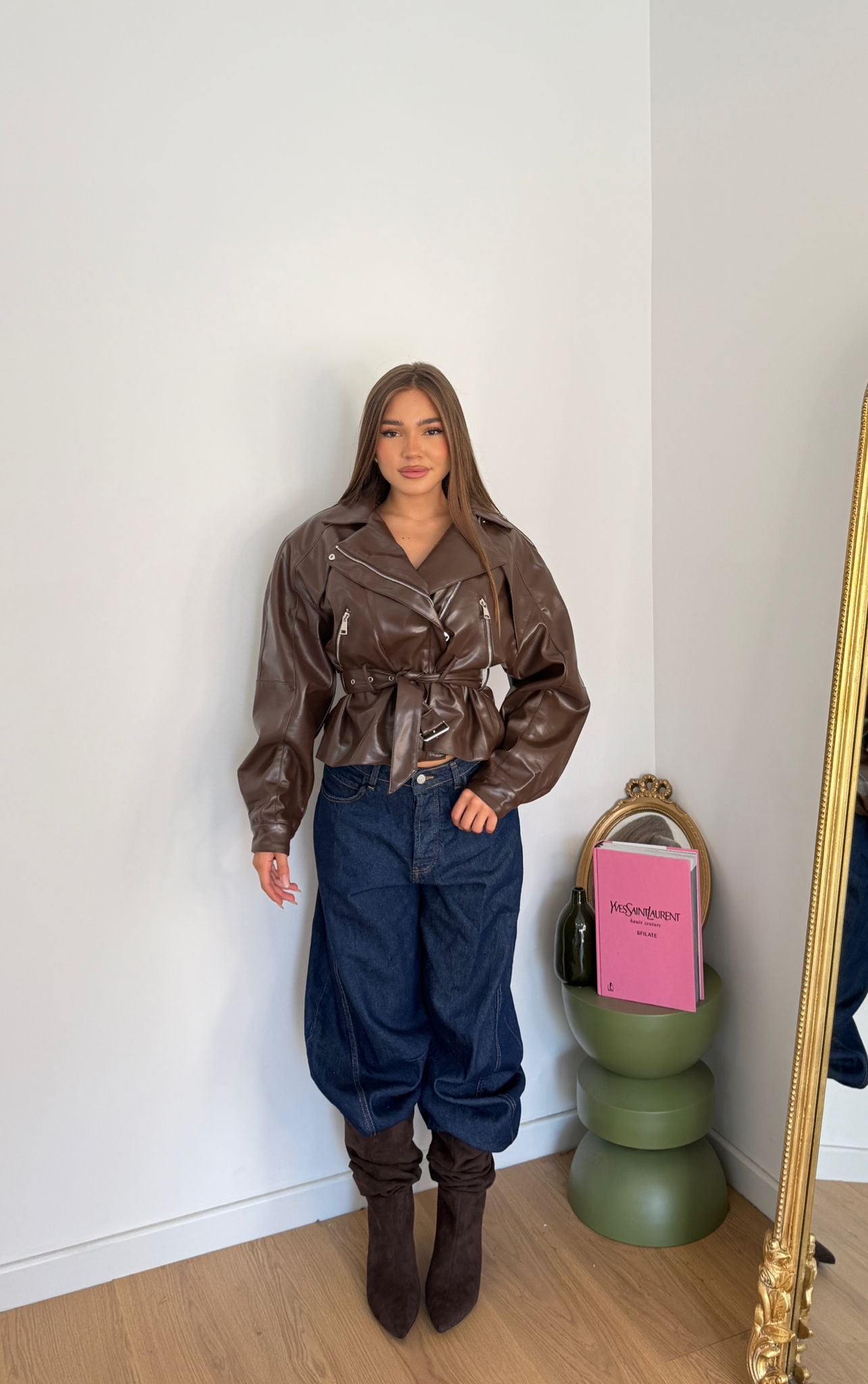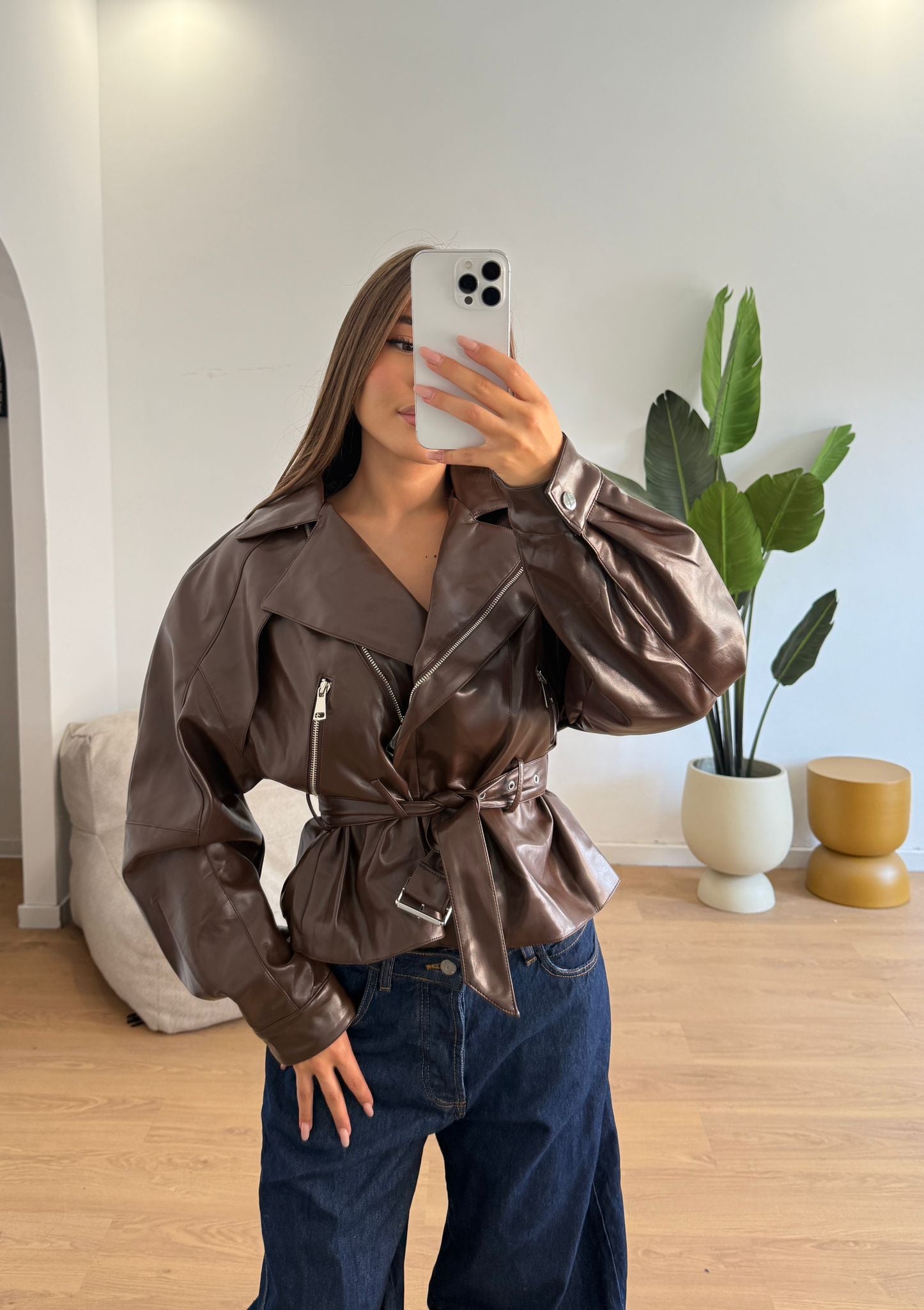 Giubbino da donna in ecopelle foderato internamente e veste regolarmente la propria taglia e la modella indossa taglia S/M