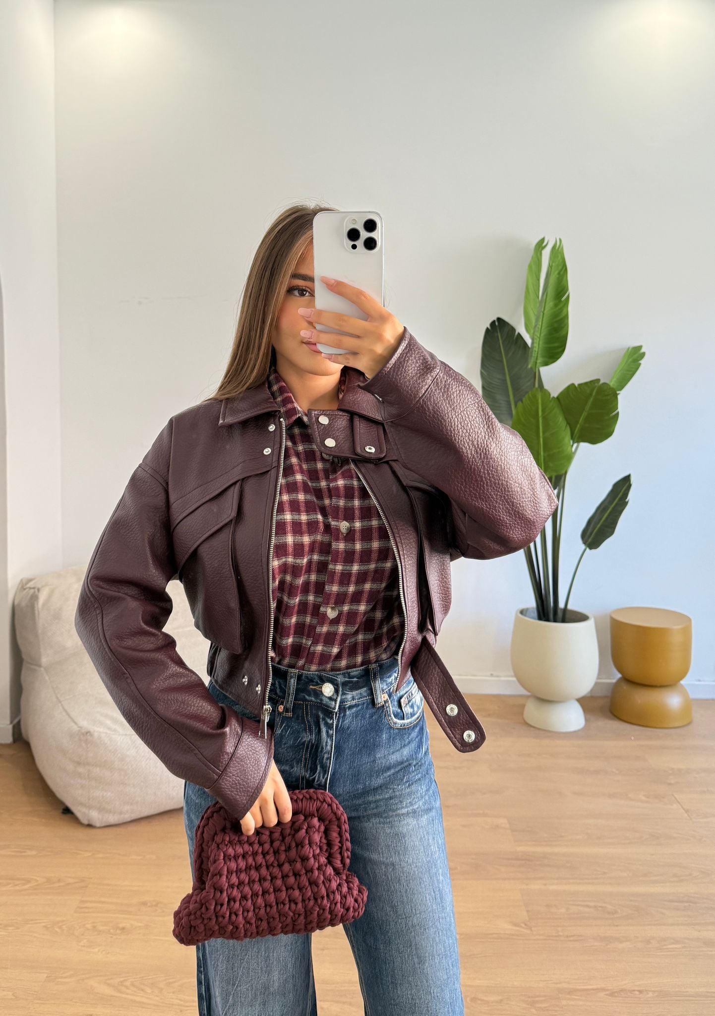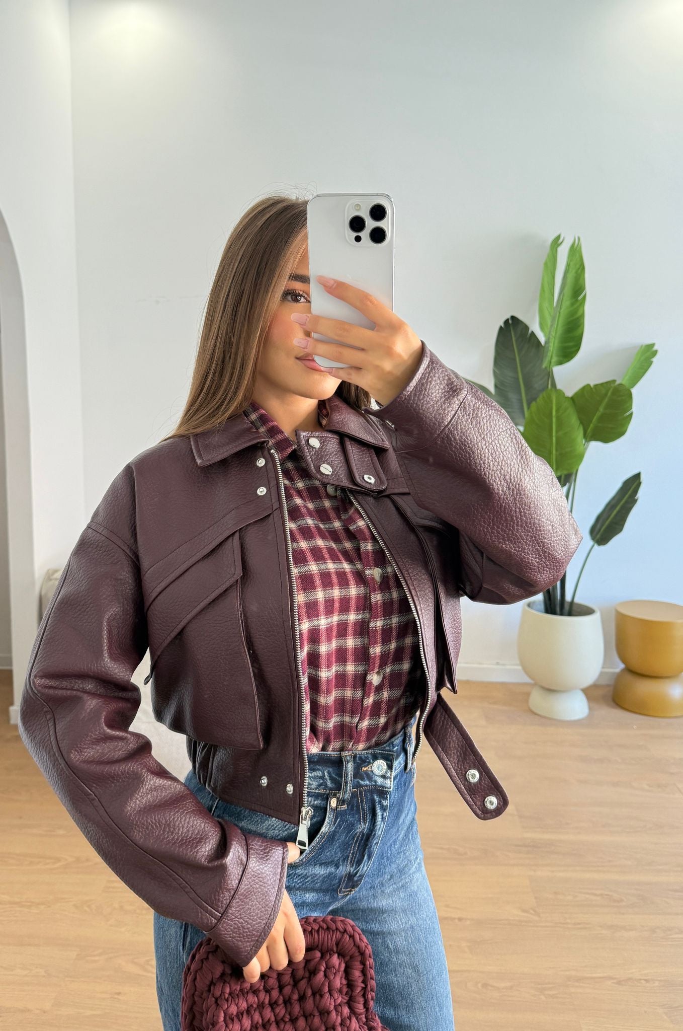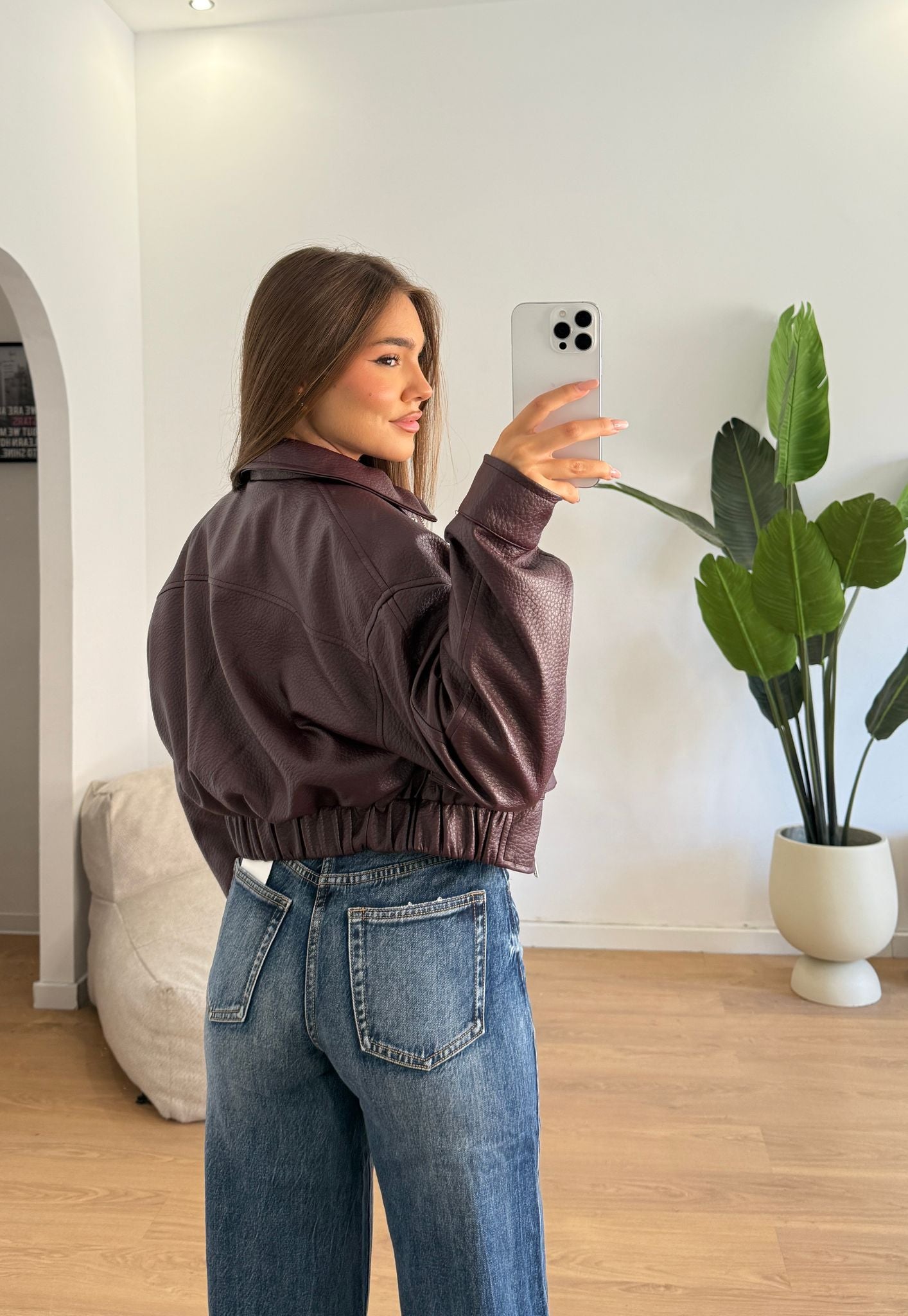 Giubbino da donna in ecopelle foderato internamente e veste regolarmente la propria taglia e la modella indossa taglia S/M