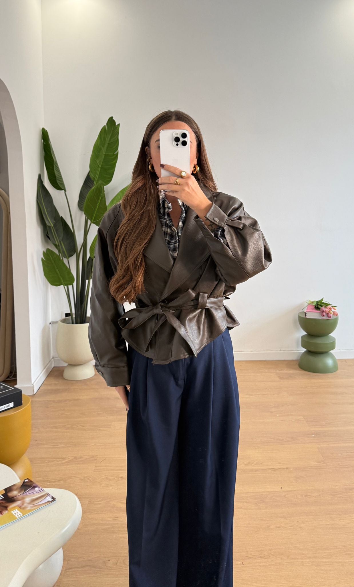 Giubbino da donna in ecopelle con cintura foderato internamente, vestibilità oversize e vestirà bene fino ad una M/L